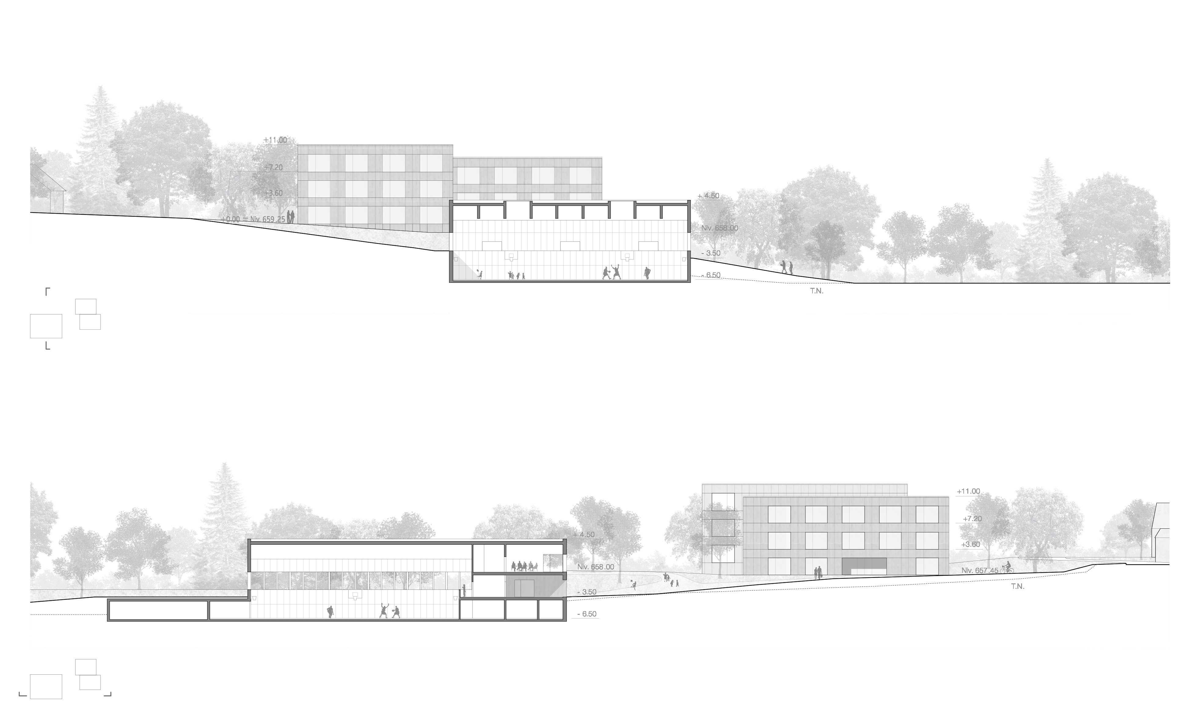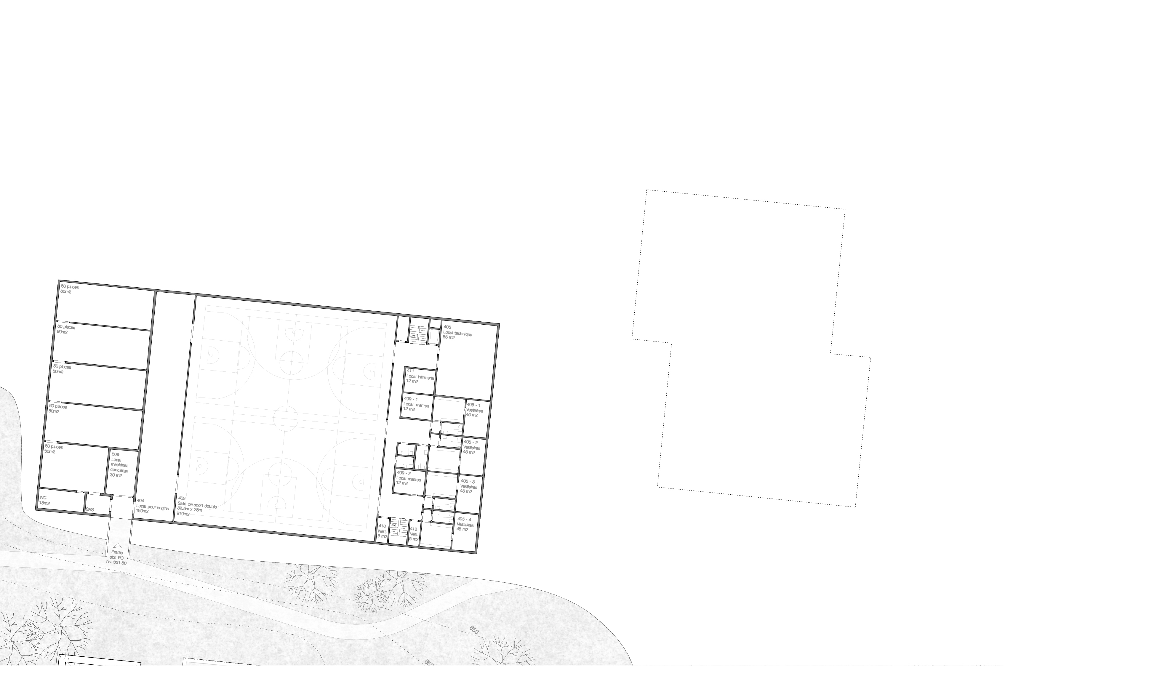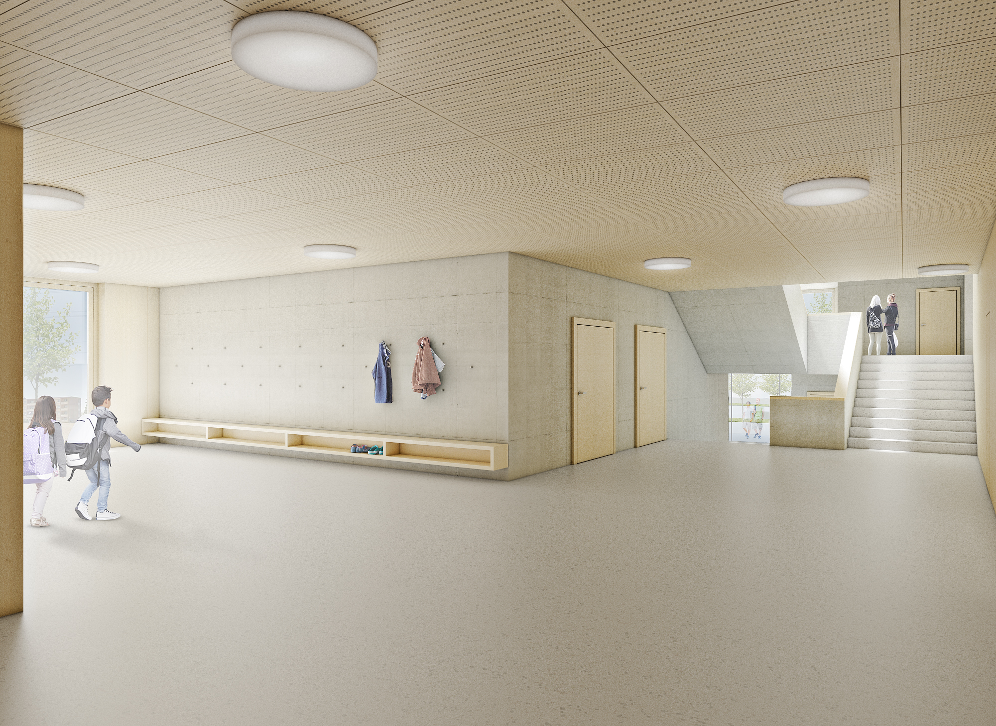 Le bâtiment des salles de classe épouse le relief du terrain en articulant 2 volumes qui s’étagent dans la pente, décalés l’un de l’autre d’un demi-niveau réduisant au minimum les excavations et déplacement de terre coûteux. Le volume unitaire des salles de sport s’oriente perpendiculairement à celui de l’école, de manière à former avec ce dernier une série de dégagements reliés les uns avec les autres par des cheminements. Le mode de distribution permet de séparer de manière simple et efficace les différentes parties du programme réparties dans deux volumes distincts. Dans le volume des salles de classe, les classes enfantines se situent au rez-de-chaussée inférieur, avec un prolongement extérieur séparé du préau principal. Les salles de classe à l’étage s’organisent autour de vastes halls de distribution, décalés en quinconce autour d’un escalier central. Des vues droites et diagonales découpent ces dégagements en plusieurs séquences spatiales qui s’ouvrent à la lumière naturelle par de larges baies vitrées s'orientant sur le paysage. On trouve au centre les parties communes (ascenseur, toilettes, espace photocopie, local nettoyage, etc) et un escalier à double volée reliant les étages par demi-niveau. L'emplacement de l'escalier au centre permet des vues diagonales et des mises en relations ouvertes entre les étages. Le volume des salles de sport accueille à l’étage supérieur la salle polyvalente avec ses locaux annexes (cuisine, sanitaires, dépôts); elle est accessible depuis un vaste couvert en relation directe avec l’esplanade principale. Cet accès permet aussi d’atteindre la salle de sport et les vestiaires. L'accueil parascolaire se situe à l’étage inférieur, accessible lui aussi par un vaste couvert