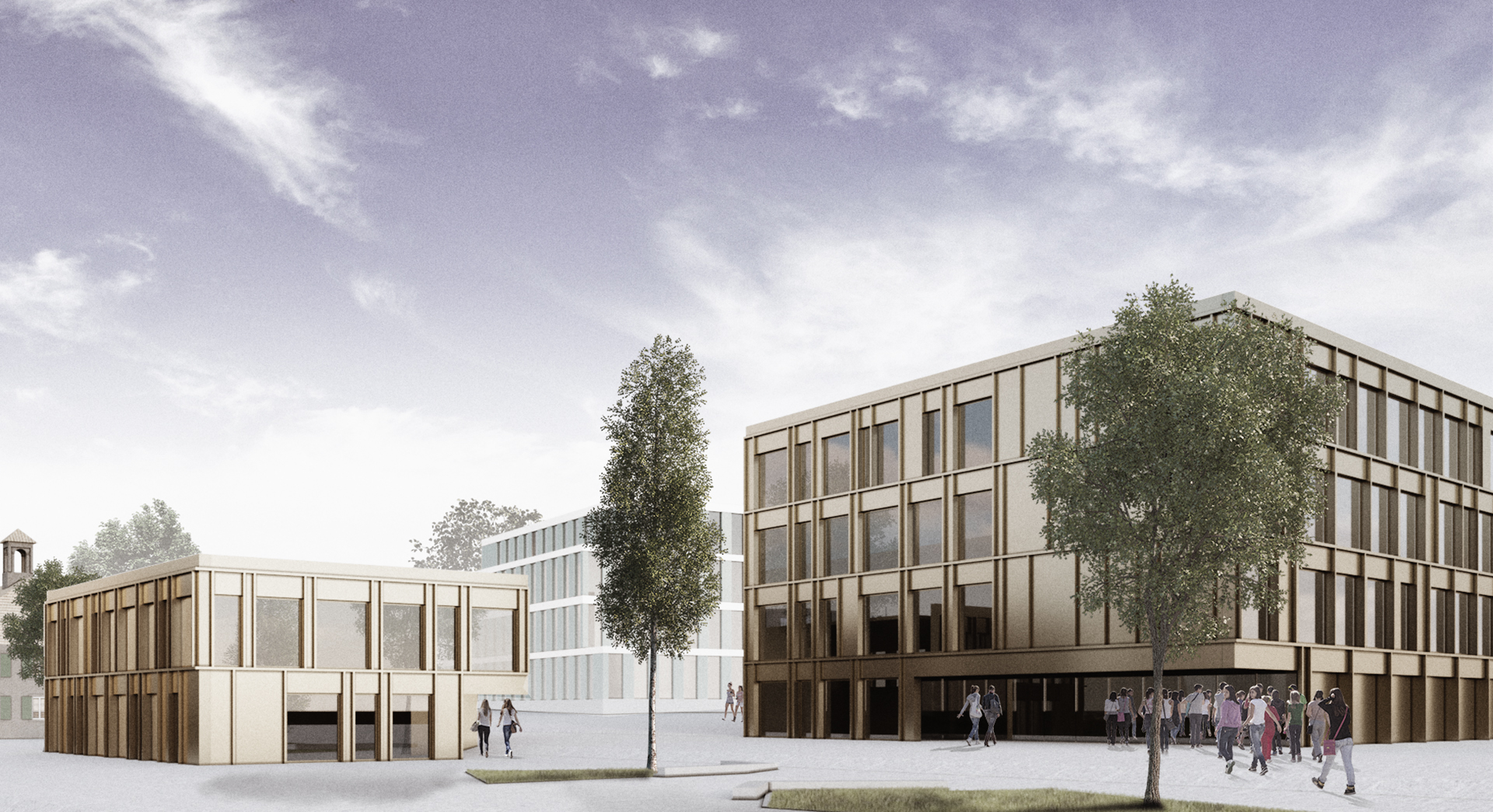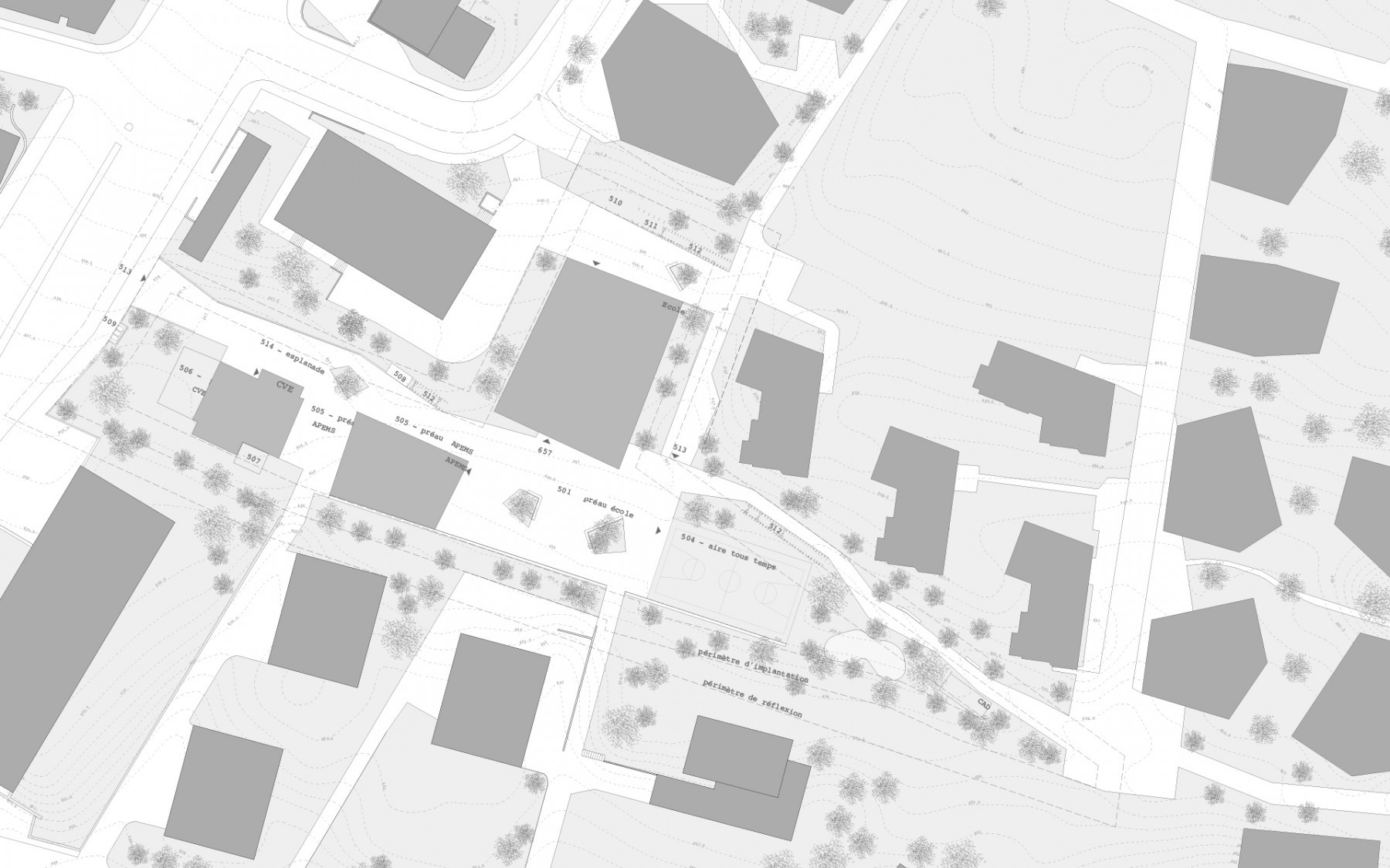 Le collège vient s'implanter en bordure sud-est du nouveau quartier d'habitations des Fiches, le long de la route de Berne. Le préau de l’école devient une nouvelle esplanade de convergence pour le quartier. Elle accueille le centre de vie enfantine existant, le nouvel APEMS et le terrain tous temps. L'école vient s'implanter en bordure de cette esplanade, sur la partie en amont de la parcelle. Elle profite de la déclivité du terrain pour offrir des accès à des niveaux différents: au nord l'entrée "administrative", au sud, l'entrée principale reliée aux préaux et aux terrains de jeux, hors circulation automobile. La liaison transversale souhaitée pour la mobilité douce d'est en ouest passe par l'esplanade et le préau scolaire. L'école se développe sur trois niveaux, la salle de sport se situe en partie basse, semi-enterrée. L'APEMS, plus petit en surface, cherche à se mettre en rapport avec la volumétrie du bâtiment scolaire historique de Petit Vennes, point de référence dans cette partie de l’esplanade.