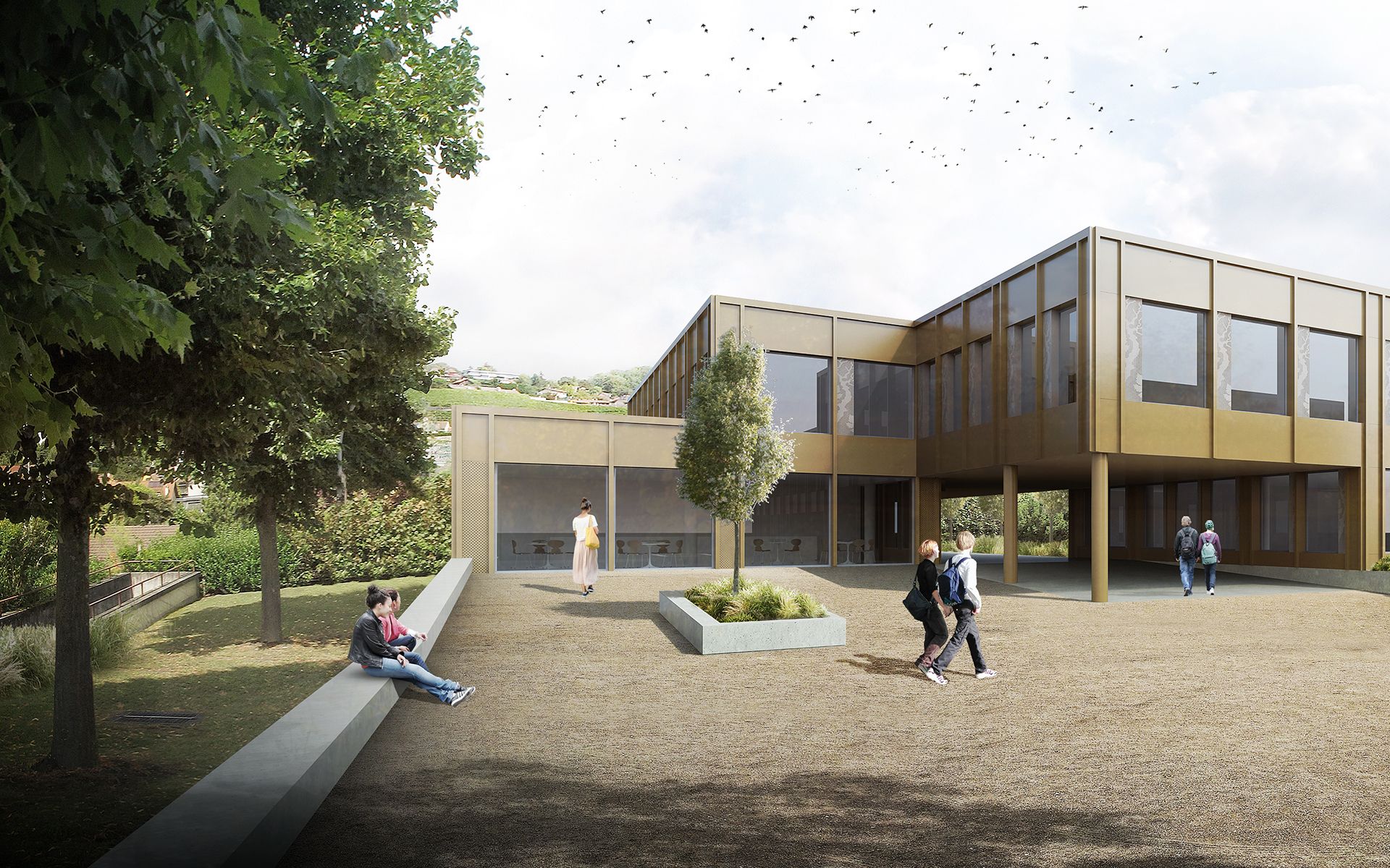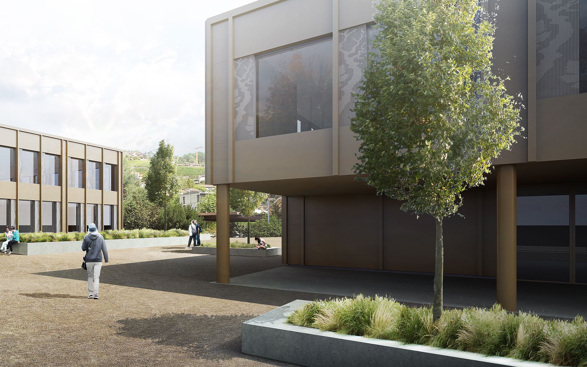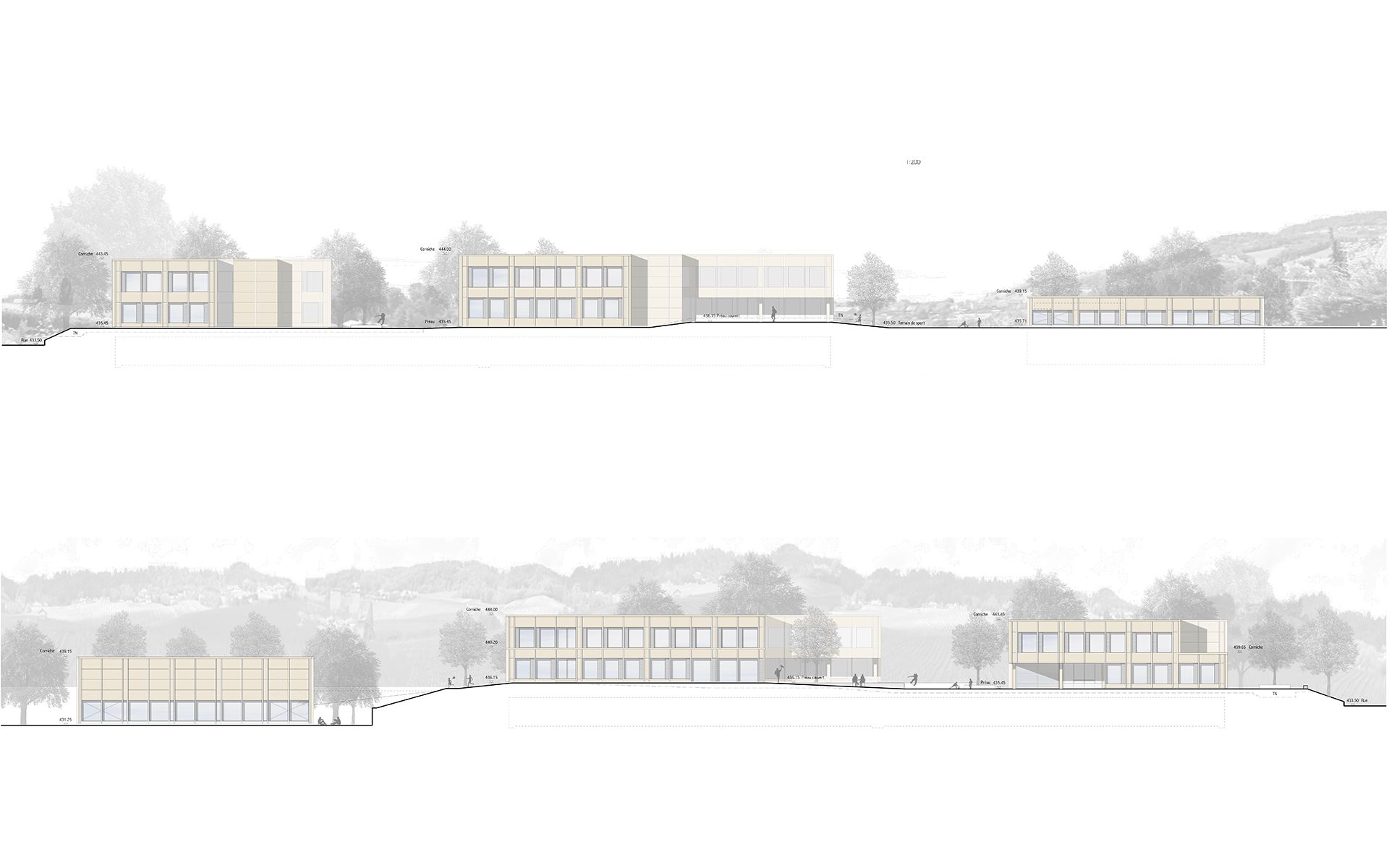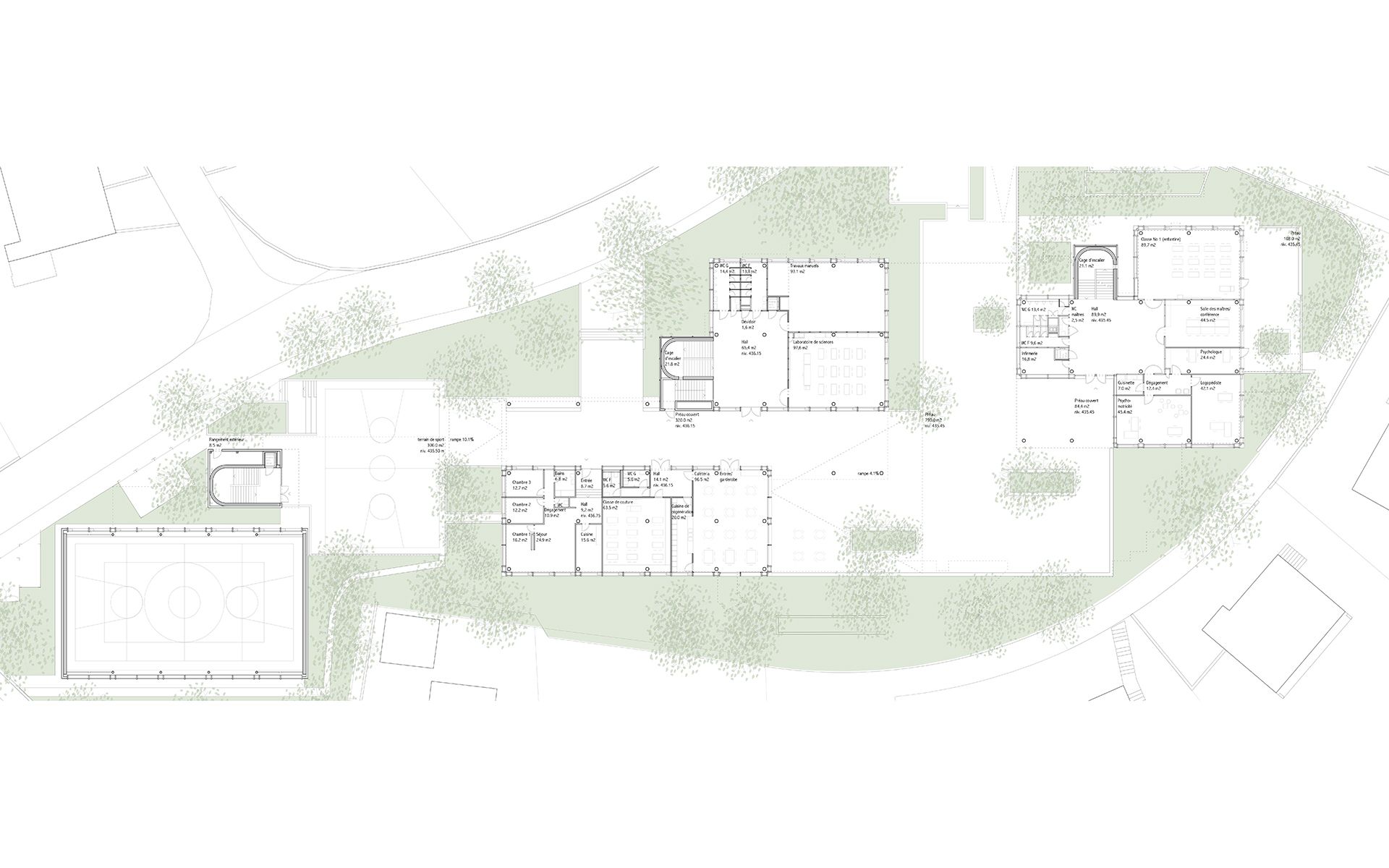 Le projet d’agrandissement consiste à intervenir ponctuellement en quelques endroits stratégiques. Le nouveau réfectoire scolaire est créé dans l’extension du volume existant au sud et profite ainsi du dégagement vers le paysage lémanique. Les autres interventions visent à mettre en conformité parasismique et de protection incendie les bâtiments existants (salle de sport, salles de classe, bureaux administratifs). L’enveloppe des bâtiments répond aux nouveaux standards énergétiques. Le système constructif de type CROCS est conservé dans son essence et sa matérialité. Les aménagements extérieurs sont remaniés pour supprimer les barrières architecturales existantes.