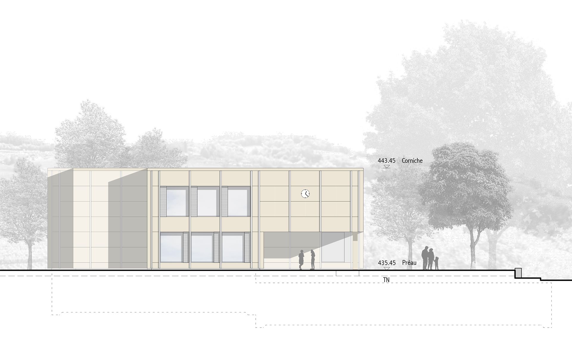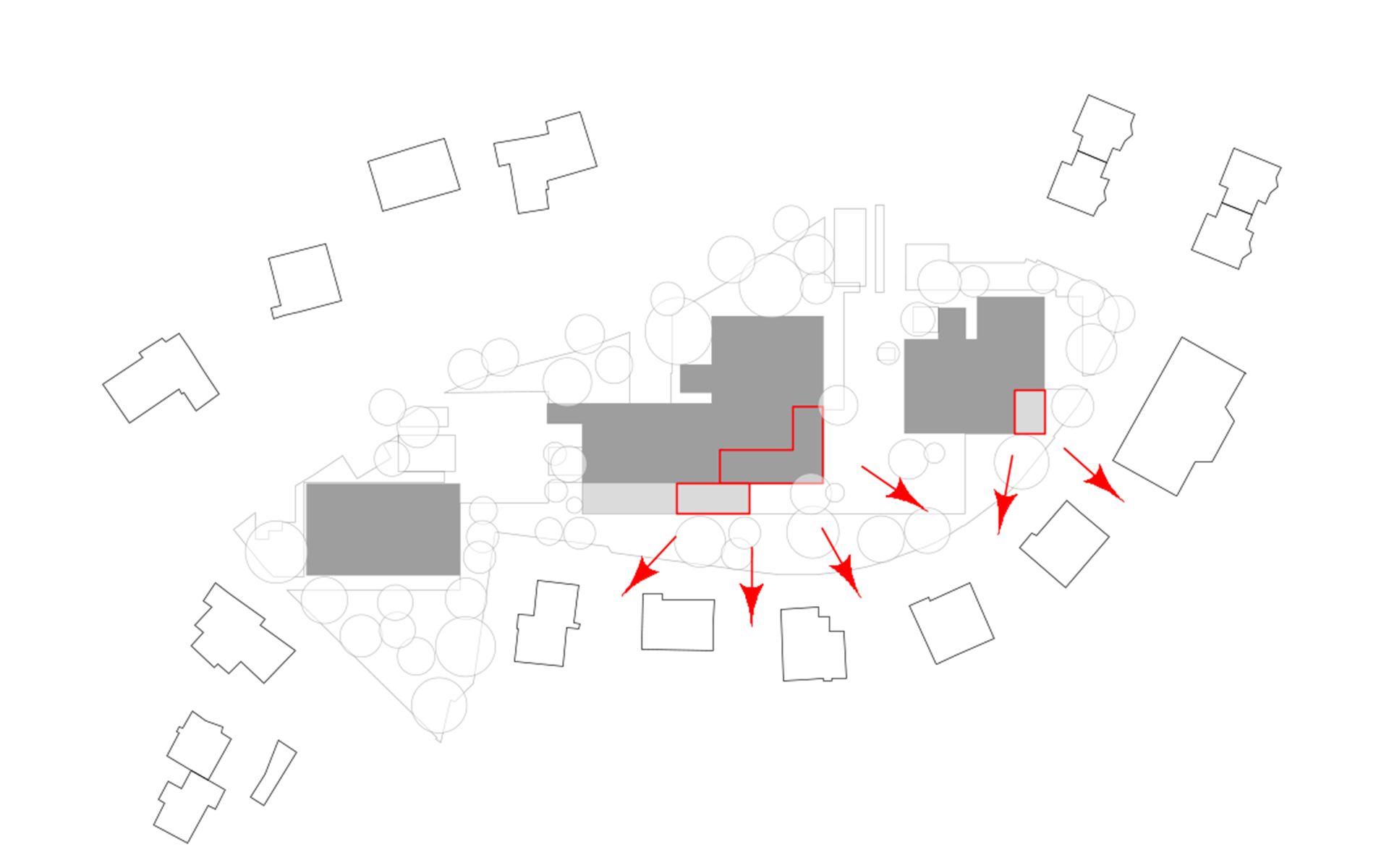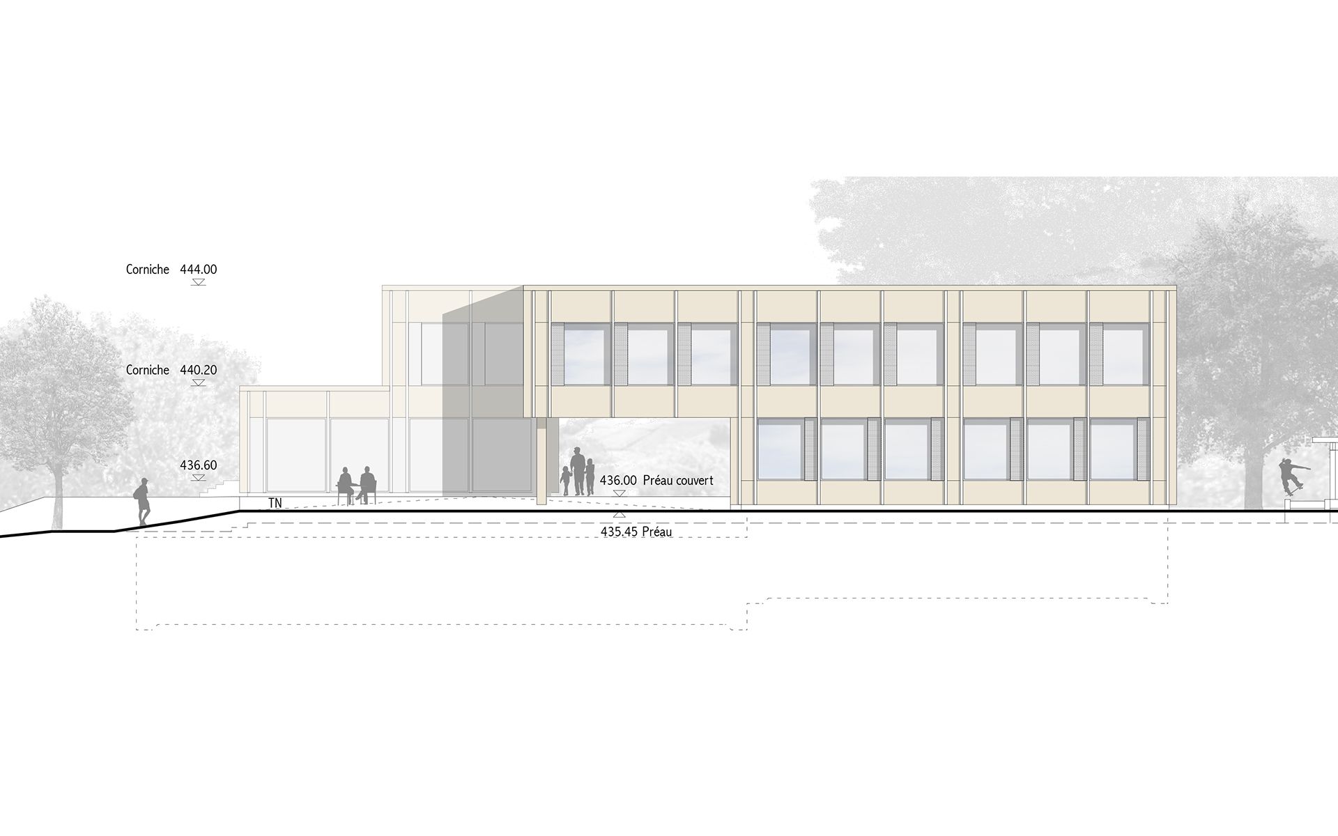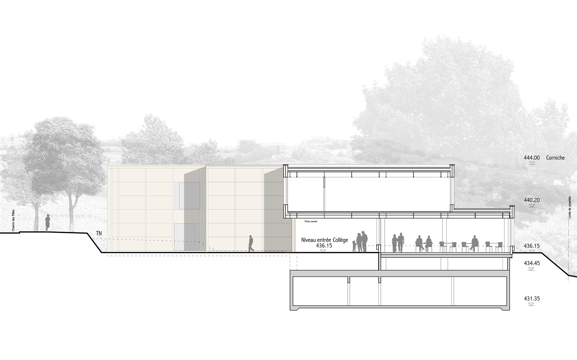 Le projet d’agrandissement consiste à intervenir ponctuellement en quelques endroits stratégiques. Le nouveau réfectoire scolaire est créé dans l’extension du volume existant au sud et profite ainsi du dégagement vers le paysage lémanique. Les autres interventions visent à mettre en conformité parasismique et de protection incendie les bâtiments existants (salle de sport, salles de classe, bureaux administratifs). L’enveloppe des bâtiments répond aux nouveaux standards énergétiques. Le système constructif de type CROCS est conservé dans son essence et sa matérialité. Les aménagements extérieurs sont remaniés pour supprimer les barrières architecturales existantes.