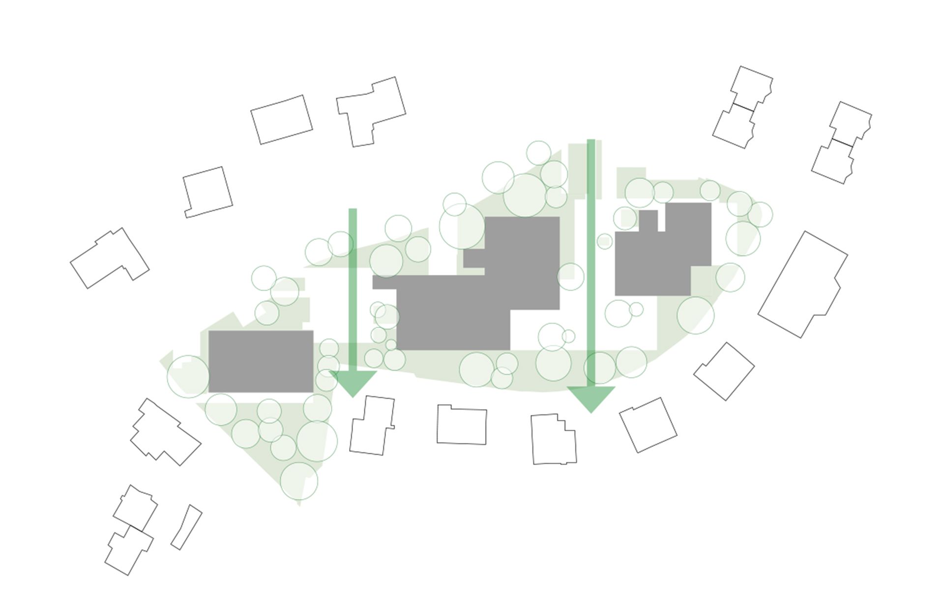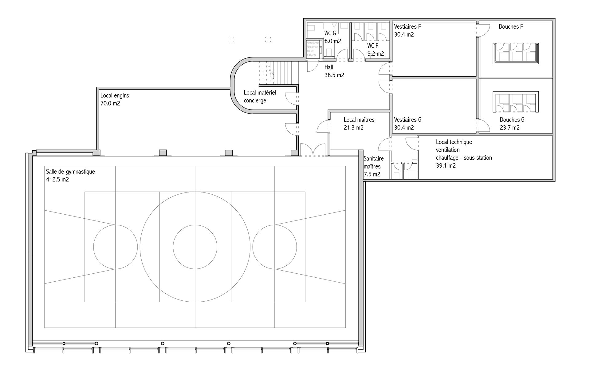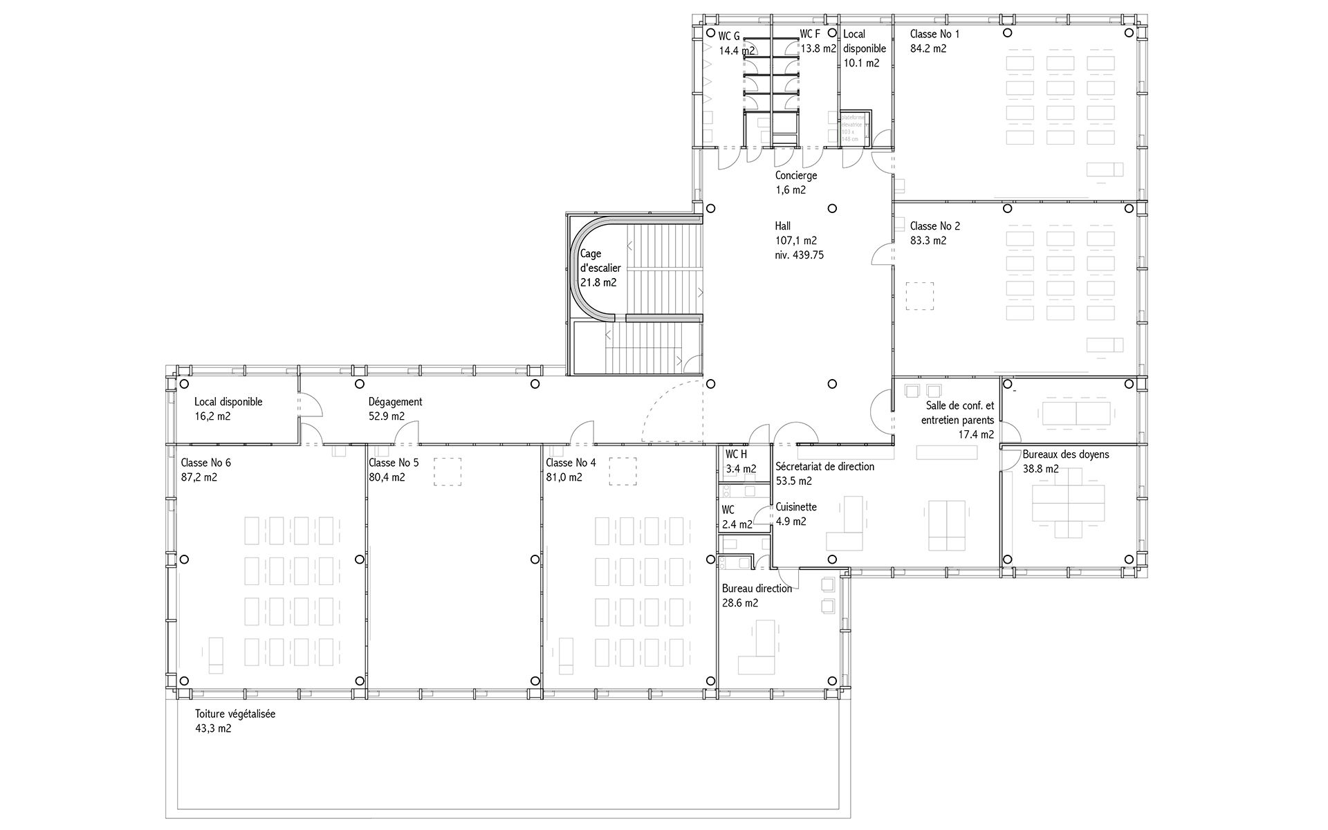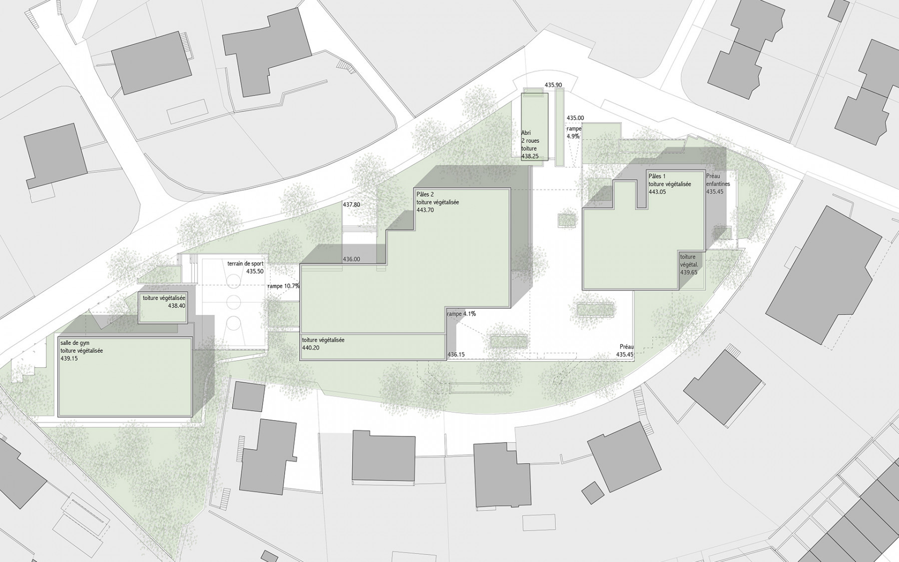 Le projet d’agrandissement consiste à intervenir ponctuellement en quelques endroits stratégiques. Le nouveau réfectoire scolaire est créé dans l’extension du volume existant au sud et profite ainsi du dégagement vers le paysage lémanique. Les autres interventions visent à mettre en conformité parasismique et de protection incendie les bâtiments existants (salle de sport, salles de classe, bureaux administratifs). L’enveloppe des bâtiments répond aux nouveaux standards énergétiques. Le système constructif de type CROCS est conservé dans son essence et sa matérialité. Les aménagements extérieurs sont remaniés pour supprimer les barrières architecturales existantes.