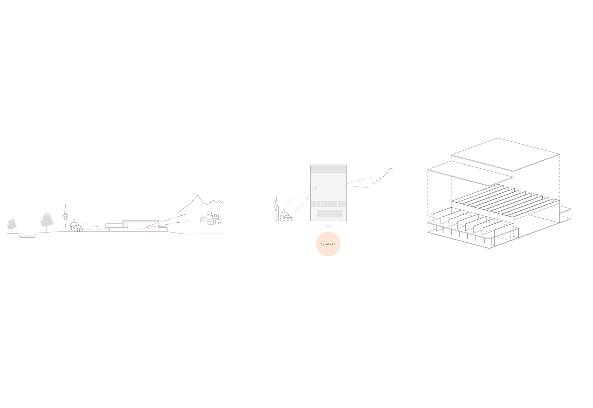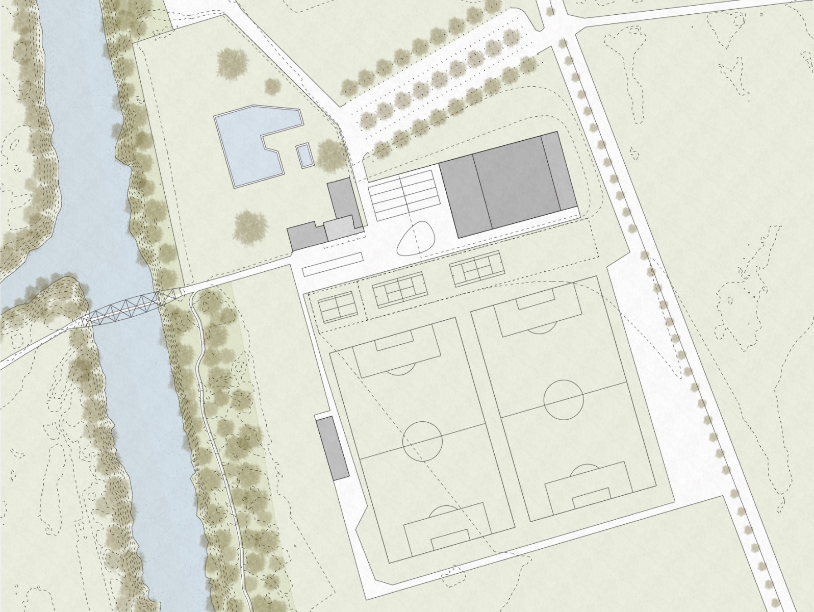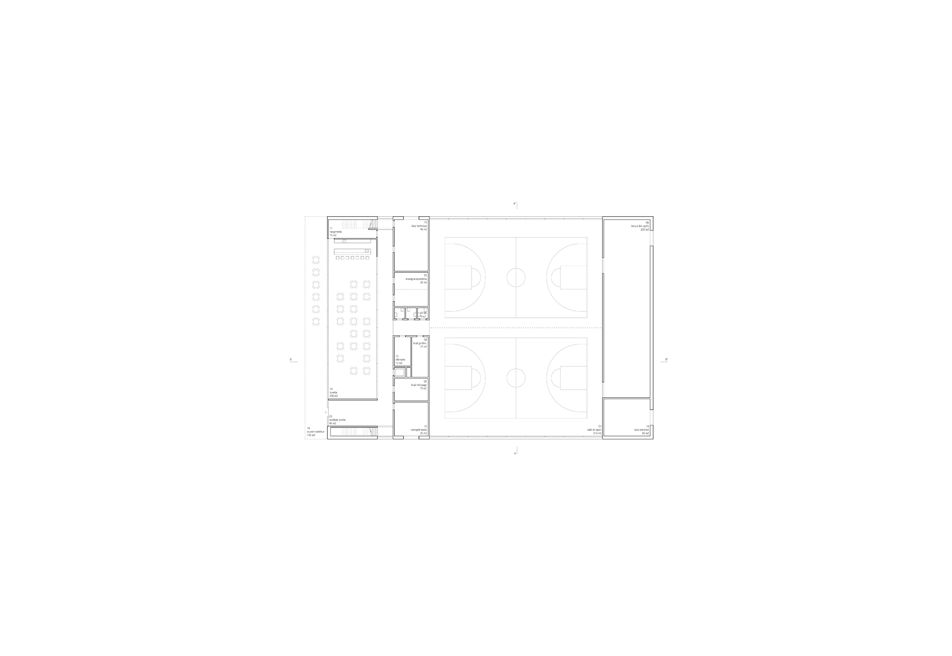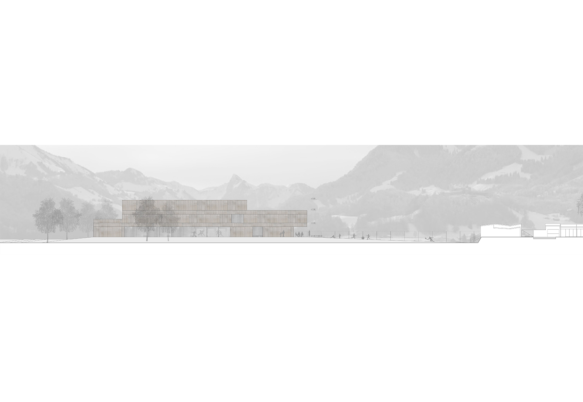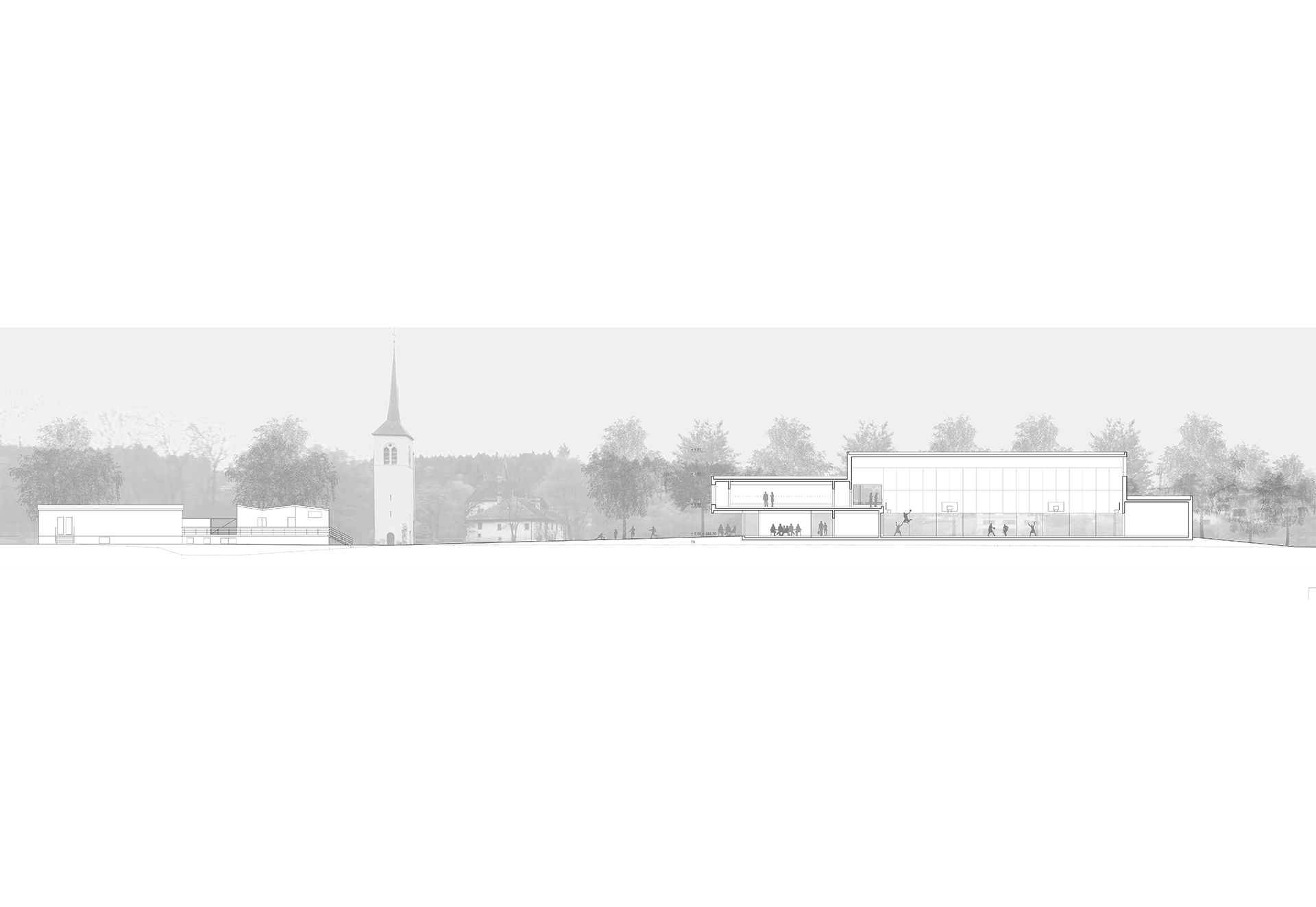 Le site réservé pour développer le complexe sportif de la plaine des Marches est d’une qualité exceptionnelle : entre les collines qui annoncent les préalpes fribourgeoises, au sud du lac de la Gruyère, le village de Broc se développe sur la hauteur. Le projet s’implante parallèlement aux terrains de football et en bordure de la nouvelle plate-forme qui se termine en gradins en direction des terrains de tennis et de football. La buvette et sa terrasse couverte sont placées à côté de l’entrée, offrant aux utilisateurs autant une facilité d’accès qu’un regard sur la place de jeux ou les autres terrains de sport (tennis, multisport, football). La salle double s’ouvre généreusement à l’est comme à l’ouest sur le paysage. Des fenêtres en hauteur, aussi bien au nord qu’au sud, viennent compléter l’éclairage naturel à l’intérieur de la salle. La façade est constituée de panneaux sandwichs isolés en bois, recouverts d’un bardage en bois plus ou moins ajouré. Celui-ci est pré-traité, imprégné, pour avoir dès la construction un aspect brun foncé qui ne variera pas dans la durée et surtout gardera une teinte uniforme.