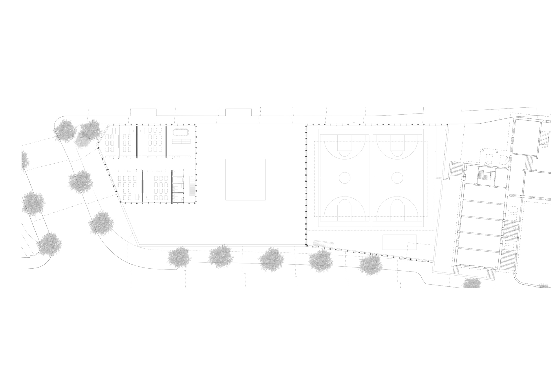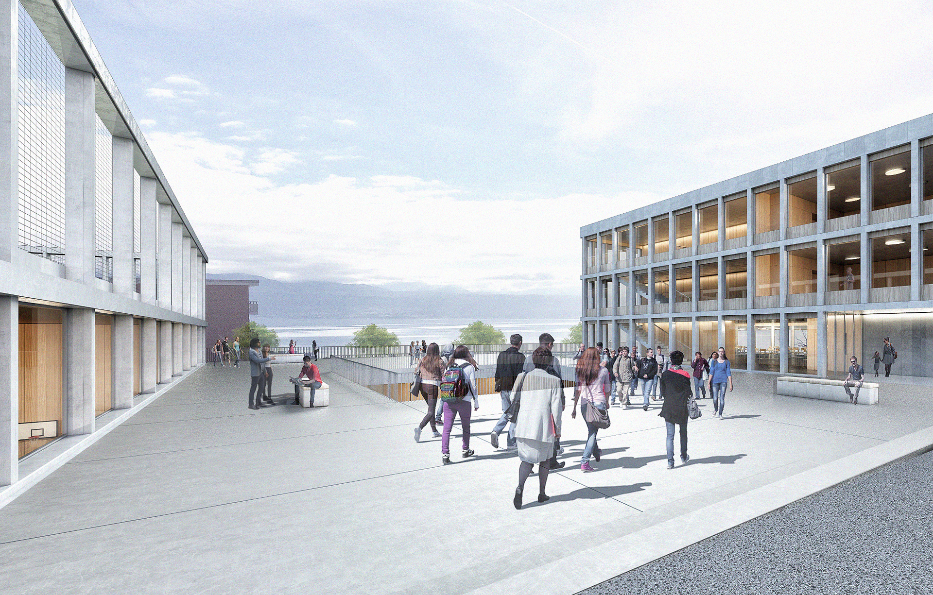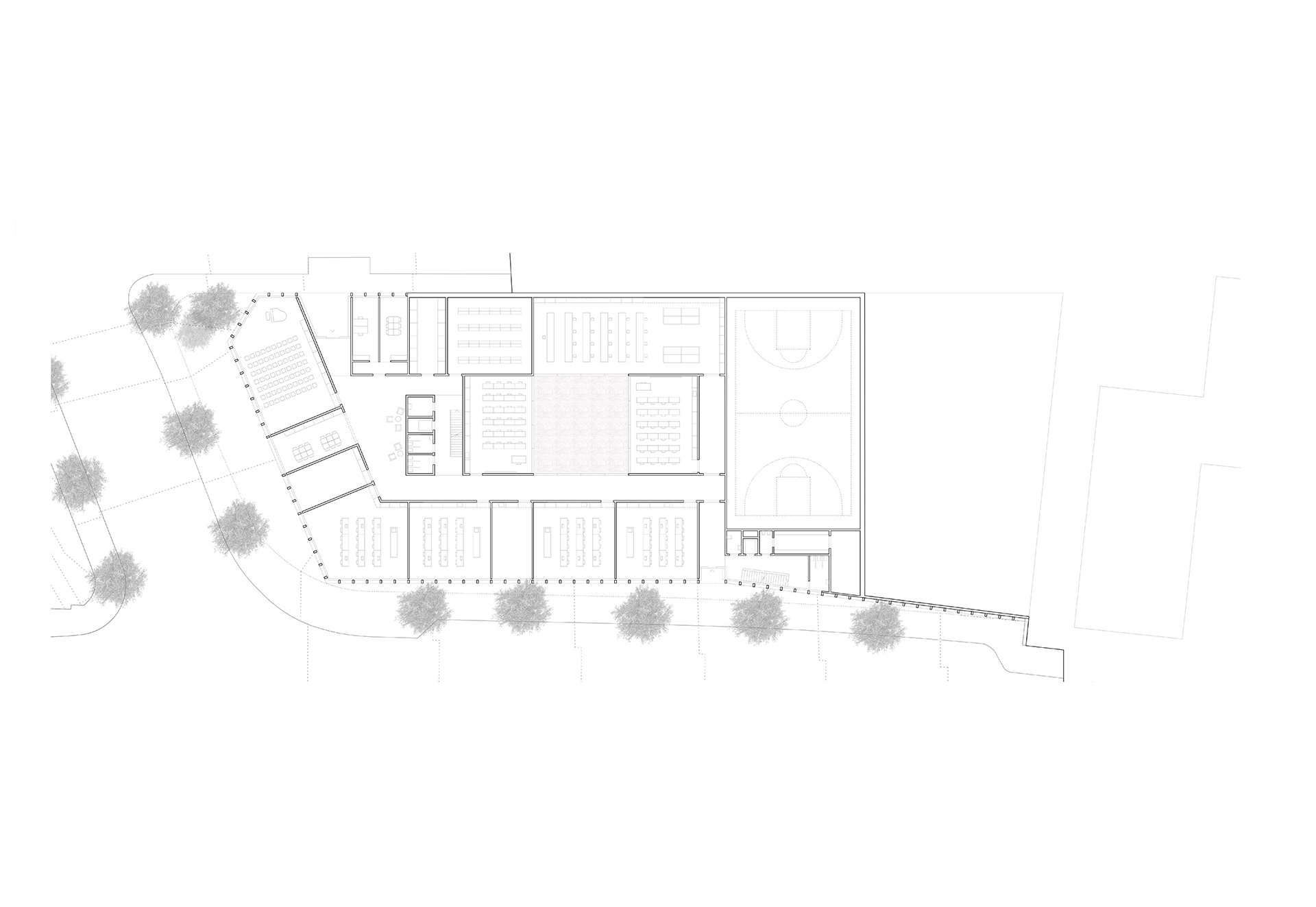 Le bâtiment est relié à son environnement par des accès distincts qui suivent la déclivité des trois rues qui le bordent. Ces accès séparés et indépendants répondent à la demande du Maître d’ouvrage de distinguer et répartir le flux des élèves selon les programmes ou l’utilisation des locaux en dehors des horaires scolaires. L’accès principal de l’école se trouve au niveau de l’esplanade et fait « pendant » à l’entrée du collège des Croix-Rouges. La typologie et l’organisation de l’école est relativement simple : elle tire parti du site et des rues en pente qui la bordent, ainsi que des dégagements sur le paysage urbain et lacustre. Les salles de classes spéciales installées dans le socle s’organisent en « couronne » sur le pourtour du bâtiment autour d’un noyau de circulation verticale et d’un patio. Les salles de classe situées dans la tête émergente s’organisent simplement de part et d’autre d’un couloir central. Les circulations sont réduites à l’essentiel et ponctuées de lumière naturelle pour minimiser l’utilisation de l’éclairage artificiel. Elles sont également pourvues de dégagements sur l’extérieur pour faciliter l’orientation dans le bâtiment et offrir des vues sur le paysage. Cette organisation modulaire permet des rocades entre les différents locaux si le MO le souhaite, sans que le concept de base n'en soit modifié.