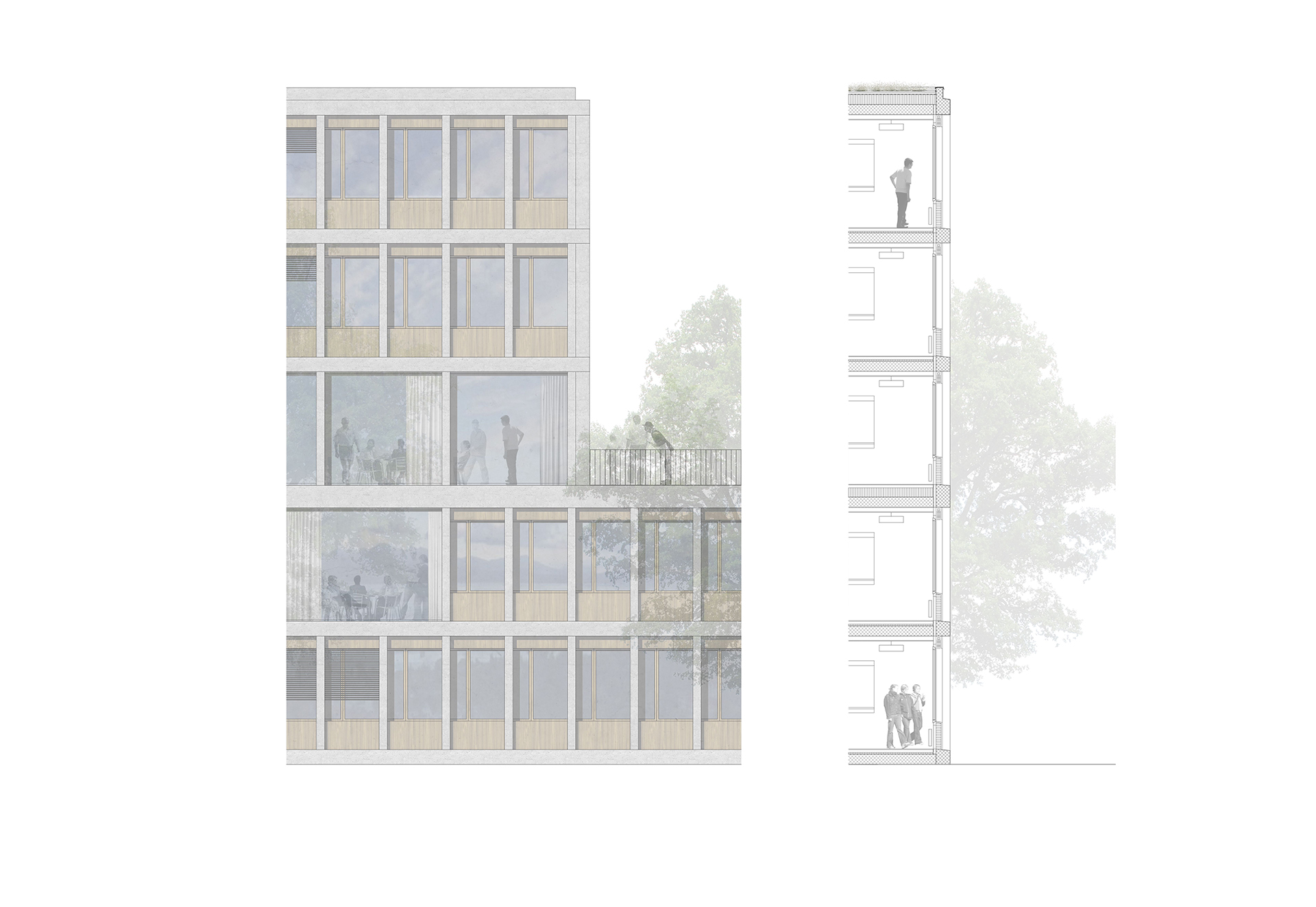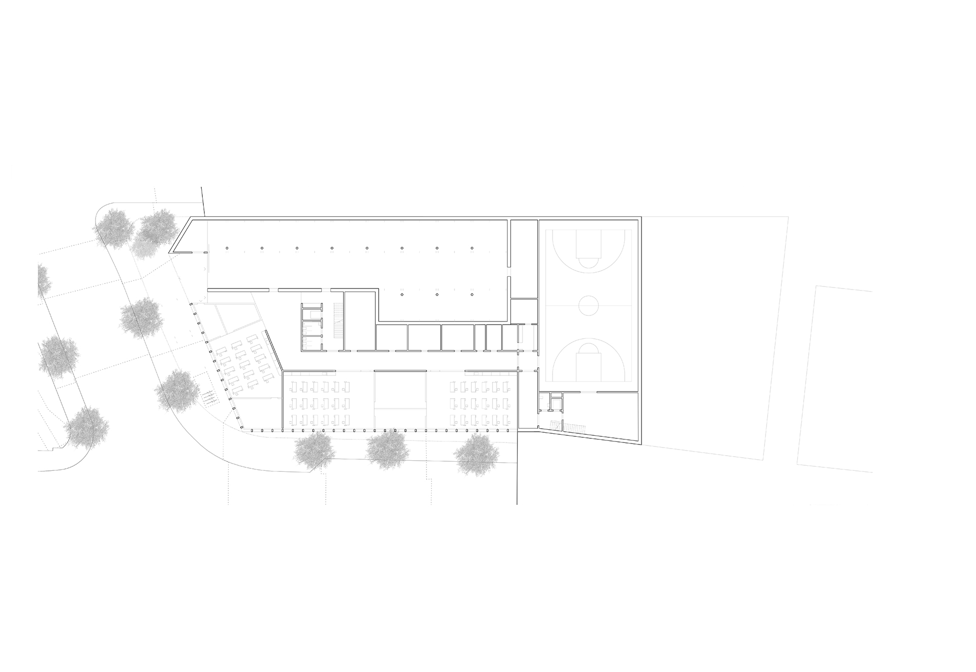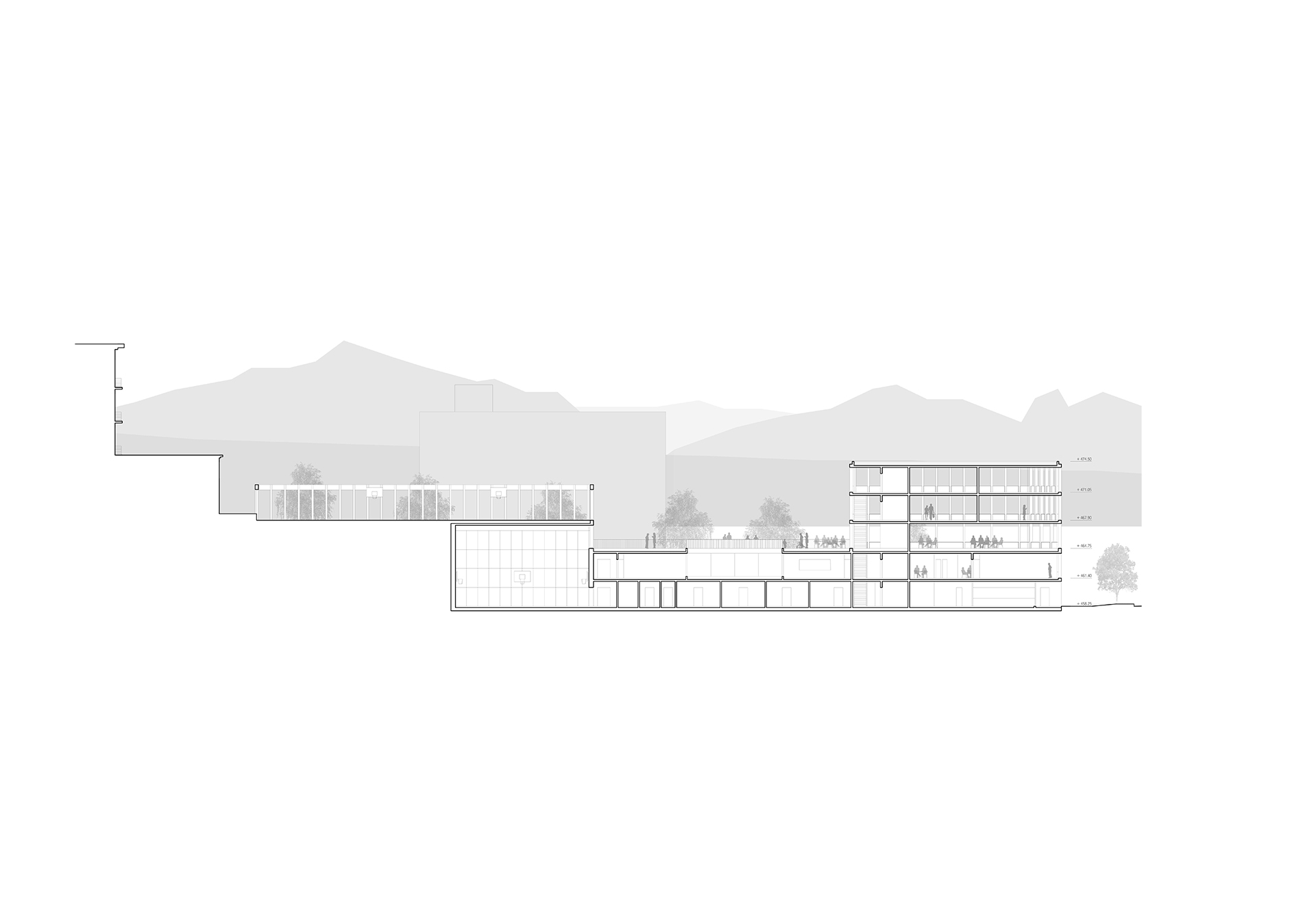 Le bâtiment est relié à son environnement par des accès distincts qui suivent la déclivité des trois rues qui le bordent. Ces accès séparés et indépendants répondent à la demande du Maître d’ouvrage de distinguer et répartir le flux des élèves selon les programmes ou l’utilisation des locaux en dehors des horaires scolaires. L’accès principal de l’école se trouve au niveau de l’esplanade et fait « pendant » à l’entrée du collège des Croix-Rouges. La typologie et l’organisation de l’école est relativement simple : elle tire parti du site et des rues en pente qui la bordent, ainsi que des dégagements sur le paysage urbain et lacustre. Les salles de classes spéciales installées dans le socle s’organisent en « couronne » sur le pourtour du bâtiment autour d’un noyau de circulation verticale et d’un patio. Les salles de classe situées dans la tête émergente s’organisent simplement de part et d’autre d’un couloir central. Les circulations sont réduites à l’essentiel et ponctuées de lumière naturelle pour minimiser l’utilisation de l’éclairage artificiel. Elles sont également pourvues de dégagements sur l’extérieur pour faciliter l’orientation dans le bâtiment et offrir des vues sur le paysage. Cette organisation modulaire permet des rocades entre les différents locaux si le MO le souhaite, sans que le concept de base n'en soit modifié.