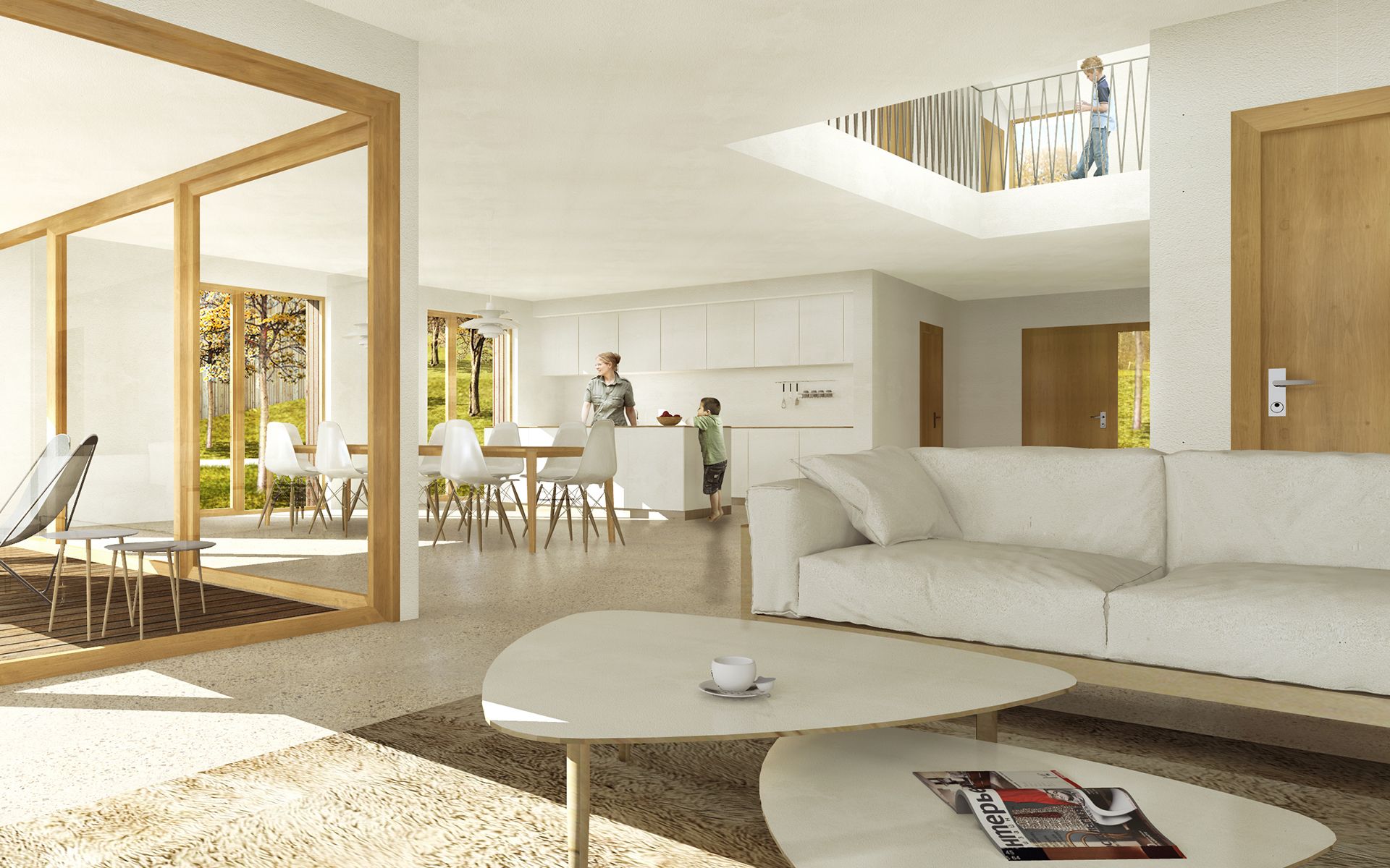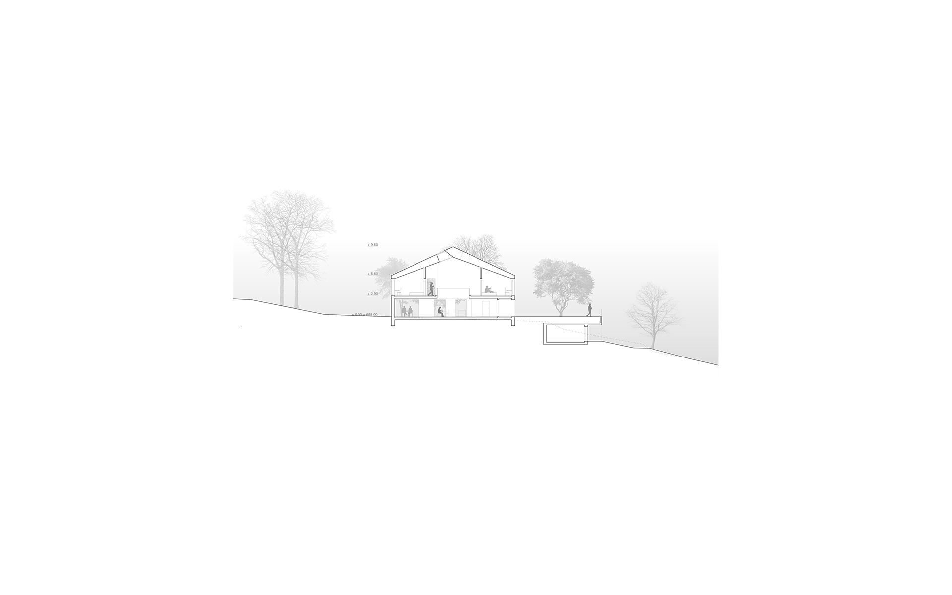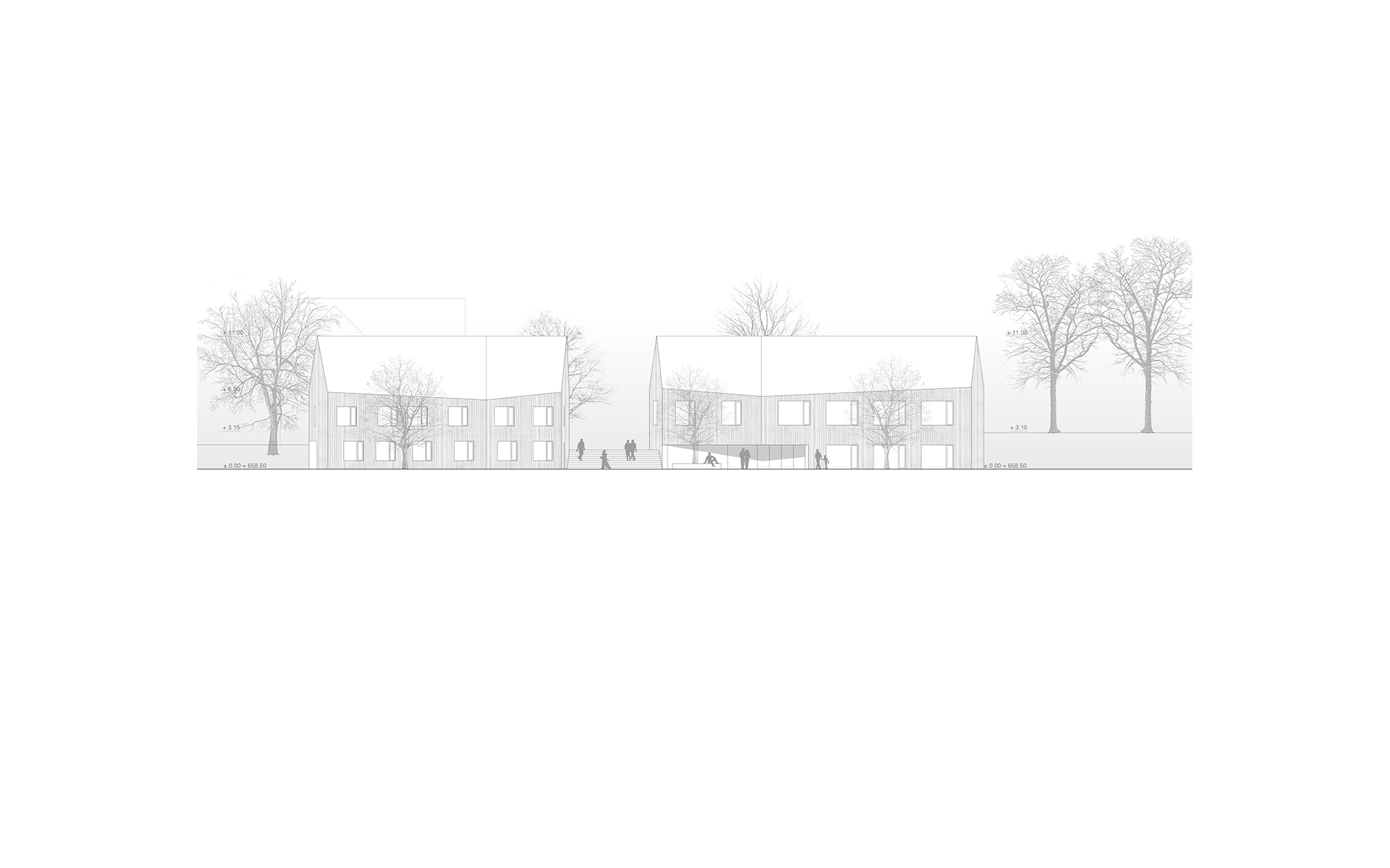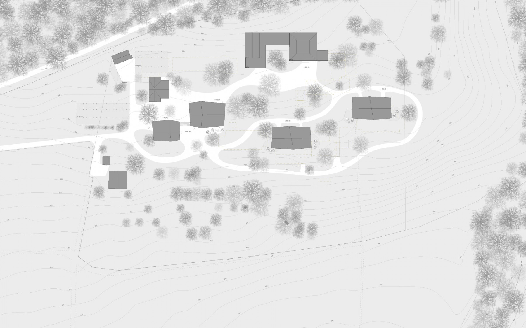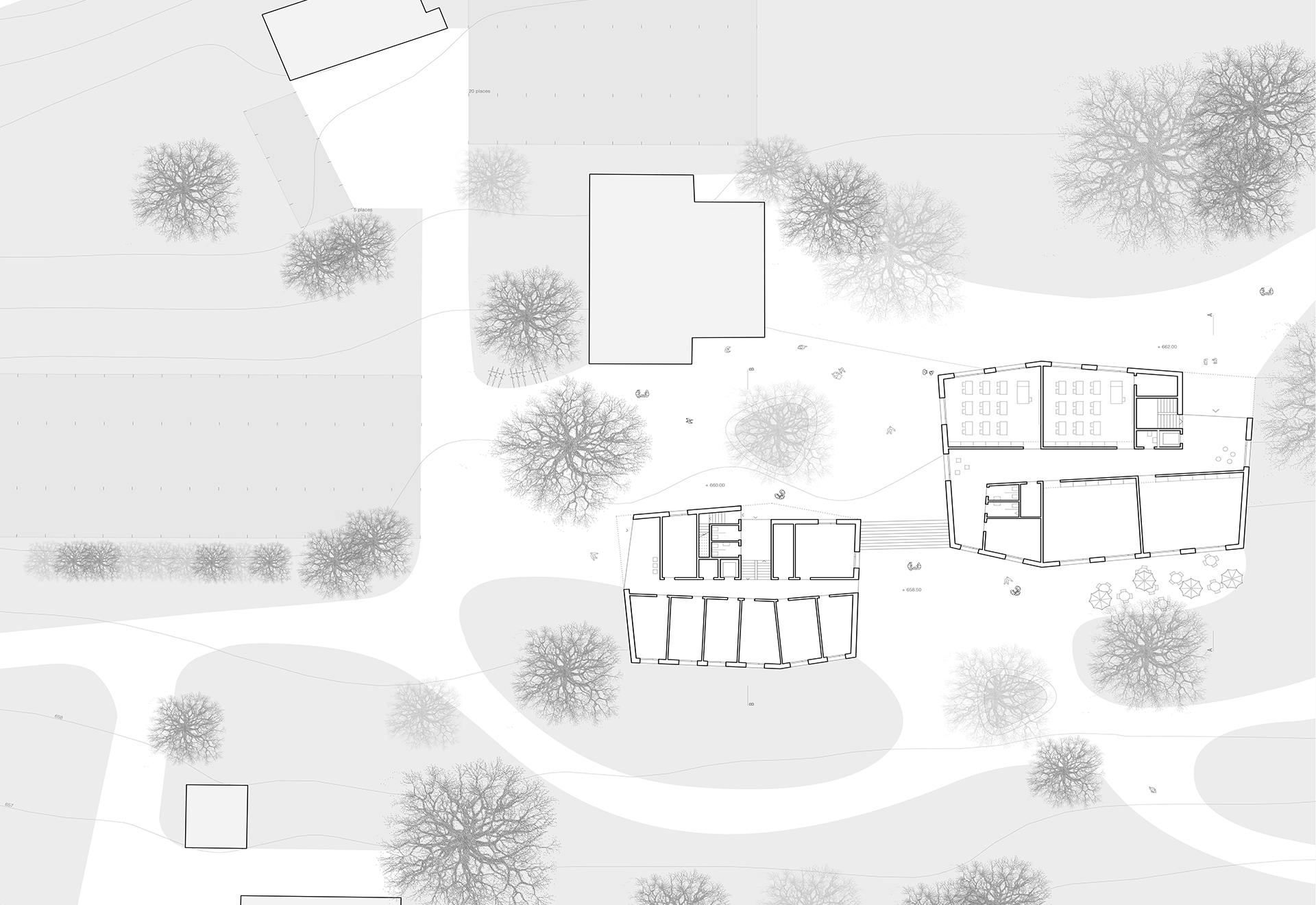 L’implantation stricte et linéaire des bâtiments actuels est remplacée par une disposition plus libre laissant plus de place entre les différents bâtiments, dans un contexte paysager et arboré. Les bâtiments sont reliés entre eux par des parcours qui serpentent au milieu d’un grand jardin recomposé, où l’arborisation existante est maintenue et complétée par de nouvelles essences. Les voitures se concentrent à l’entrée du site pour en préserver le caractère naturel et paysager. Le programme se répartit dans 3 groupes distincts de bâtiments situés à chaque extrémité du site. Les bâtiments en rapport avec l’accueil (administration, direction et bureaux des thérapeutes) et l’apprentissage (cuisine, salle polyvalente, salles de classe) sont disposés en quinconce l’un par rapport à l’autre. Ils définissent deux espaces distincts et communicants entre eux qui tirent parti des différences de niveau du terrain. Les bâtiments contenant les quatre groupes éducatifs sont disposés dans un grand jardin à l’autre extrémité du site, dans une zone plus calme et retirée. Le bâtiment des salles de classe se trouve entre ces deux pôles, relié aux nouvelles salles de classe par un préau scolaire commun.