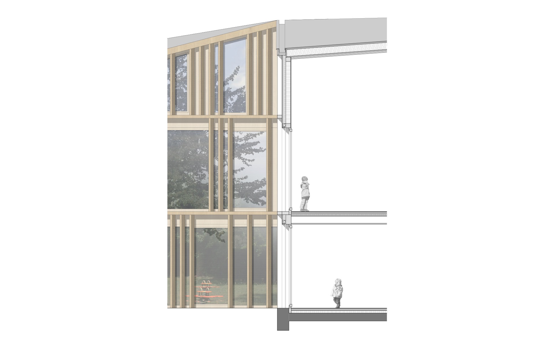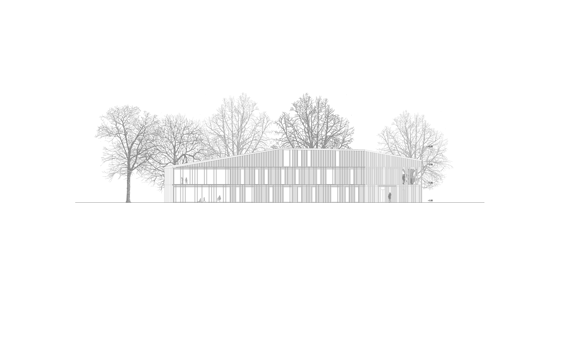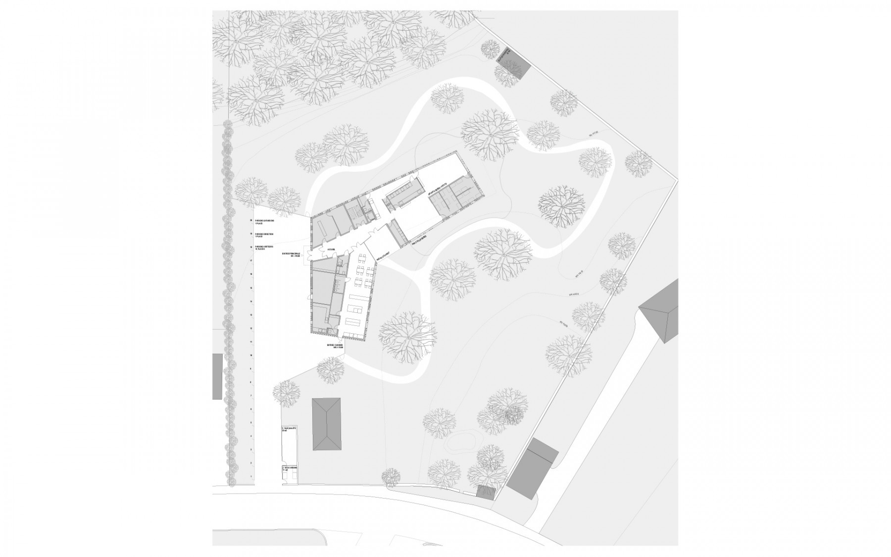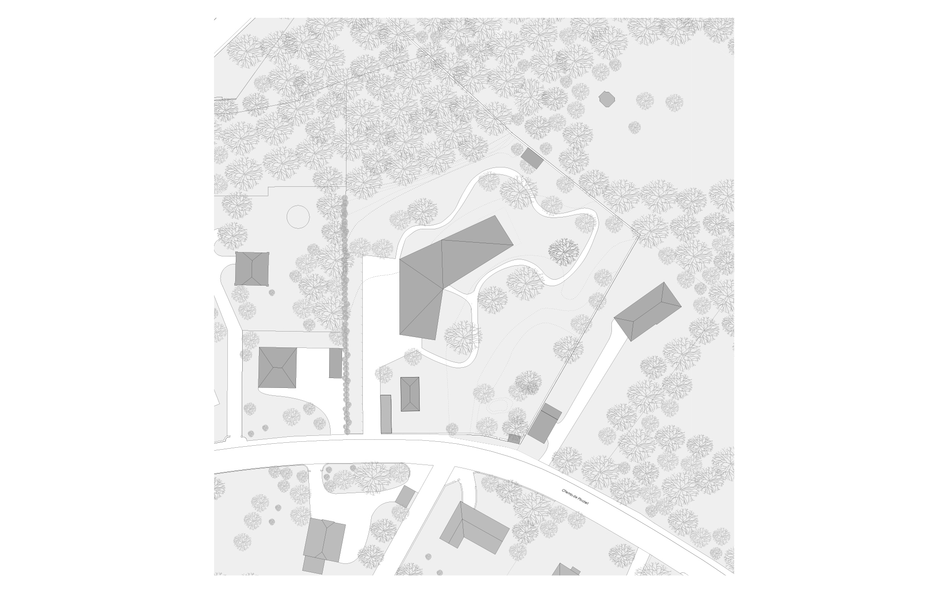 L’espace de vie enfantine est situé sur le plateau de Pinchat, en bordure de la falaise arborée qui surplombe Carouge. Le bâtiment existant, une bâtisse du début de siècle, est démoli, sa substance d’origine n’étant plus reconnaissable à la suite de multiples transformations. La nouvelle construction s’implante à l’emplacement de l’ancienne bâtisse. Sa forme plissée est induite par la présence et la disposition des grands tilleuls et marronniers présents sur le site. Les espaces des enfants sont tous éclairés naturellement et sont organisés de manière fluide, autour des noyaux de service et de change. Ces derniers ont une vision sur les espaces de vie et bénéficient de lumière naturelle en second jour. Les différents espaces d’activité peuvent être ouverts et fluides ou fermés, selon les différents besoins de la journée. Les enfants sont en rapport constant avec les différentes lumières du jour et des saisons qui défilent dans le parc, leur donnant de précieux repères spatio-temporels indispensables à leur développement.