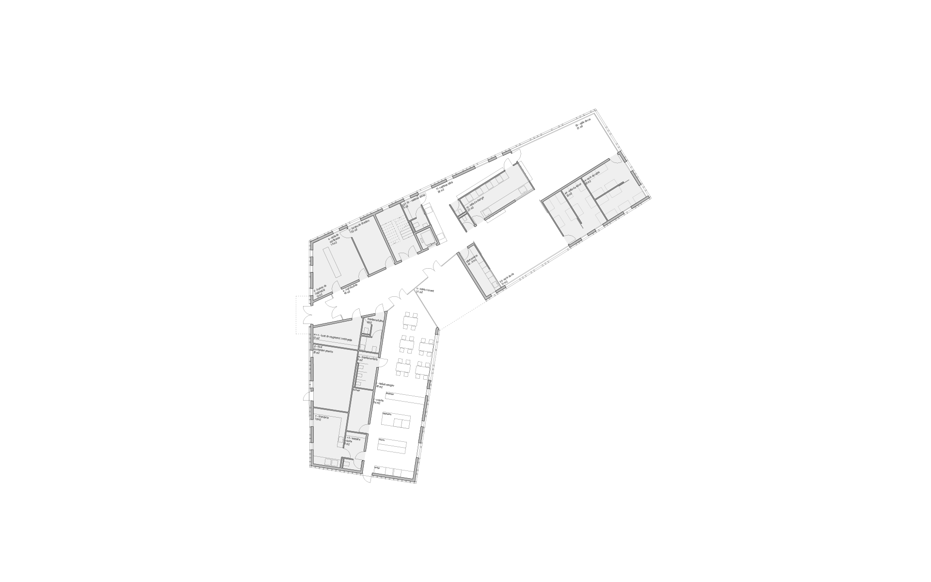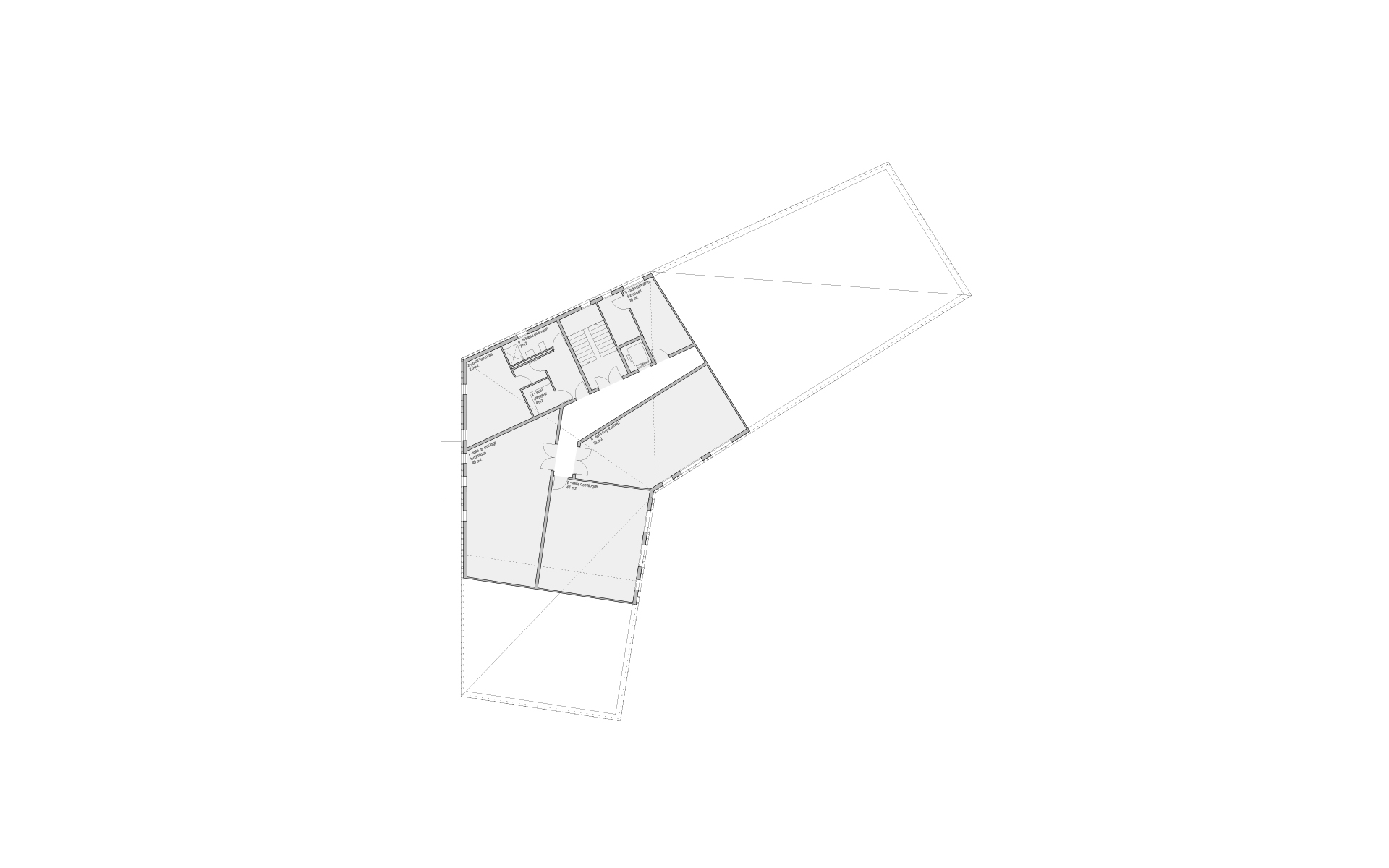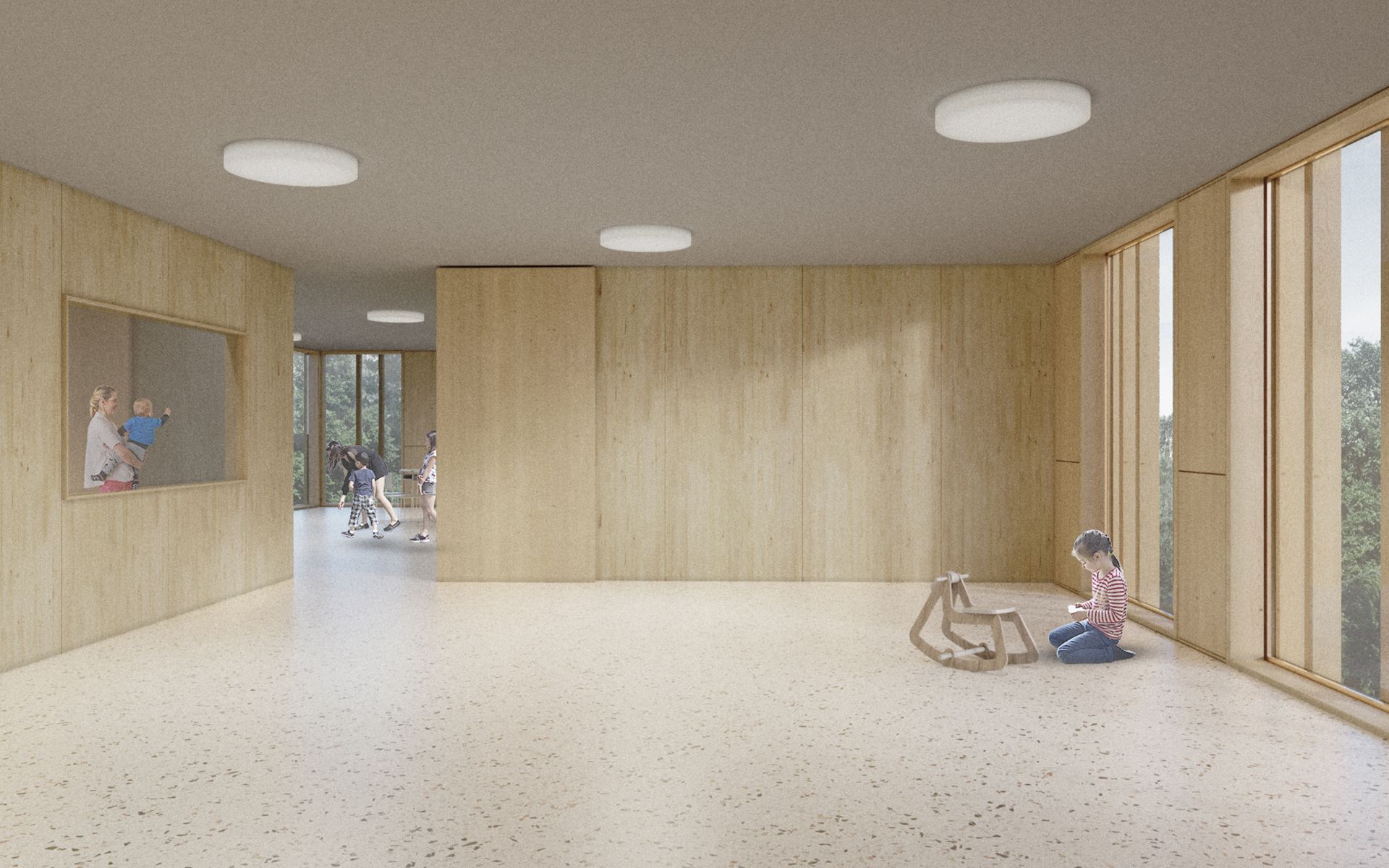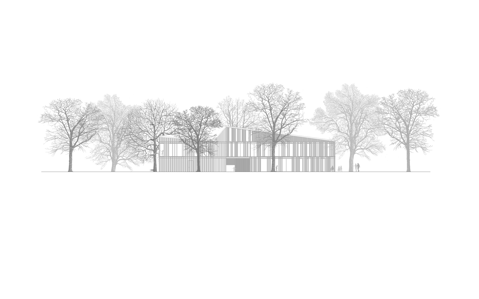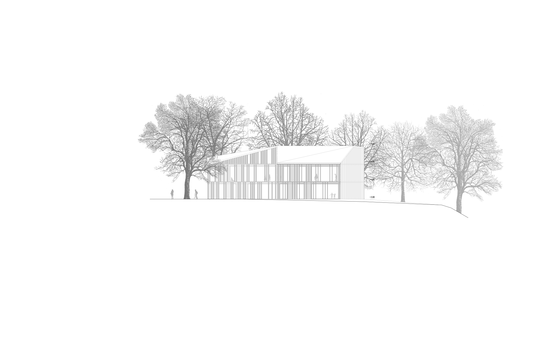 L’espace de vie enfantine est situé sur le plateau de Pinchat, en bordure de la falaise arborée qui surplombe Carouge. Le bâtiment existant, une bâtisse du début de siècle, est démoli, sa substance d’origine n’étant plus reconnaissable à la suite de multiples transformations. La nouvelle construction s’implante à l’emplacement de l’ancienne bâtisse. Sa forme plissée est induite par la présence et la disposition des grands tilleuls et marronniers présents sur le site. Les espaces des enfants sont tous éclairés naturellement et sont organisés de manière fluide, autour des noyaux de service et de change. Ces derniers ont une vision sur les espaces de vie et bénéficient de lumière naturelle en second jour. Les différents espaces d’activité peuvent être ouverts et fluides ou fermés, selon les différents besoins de la journée. Les enfants sont en rapport constant avec les différentes lumières du jour et des saisons qui défilent dans le parc, leur donnant de précieux repères spatio-temporels indispensables à leur développement.