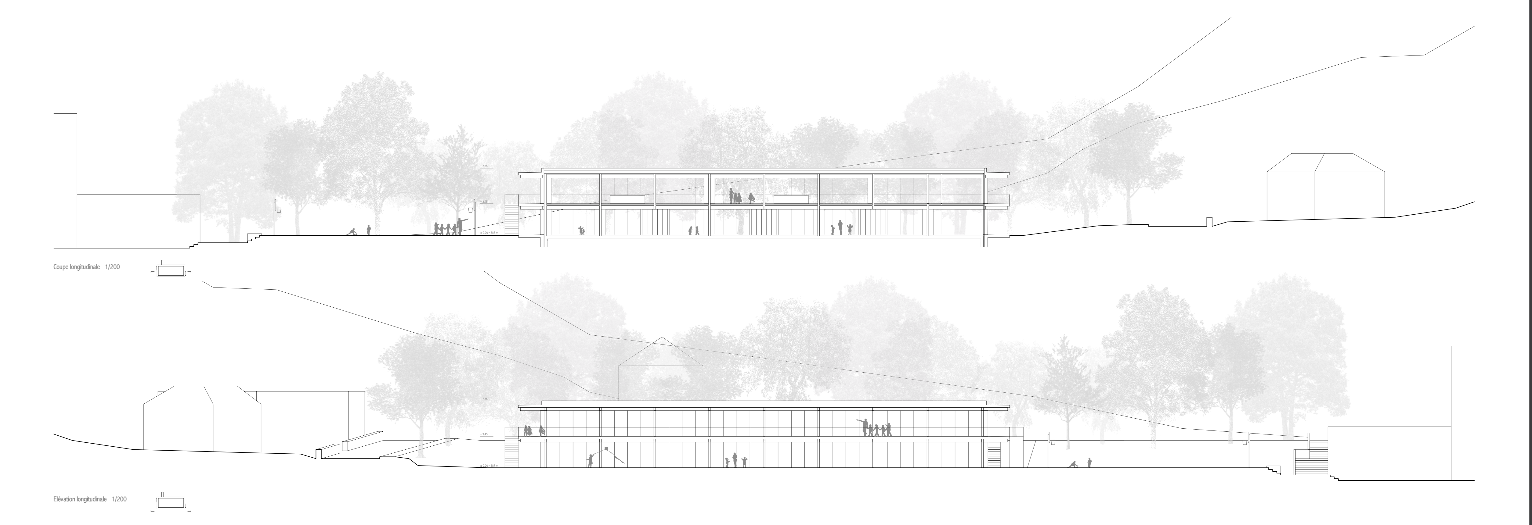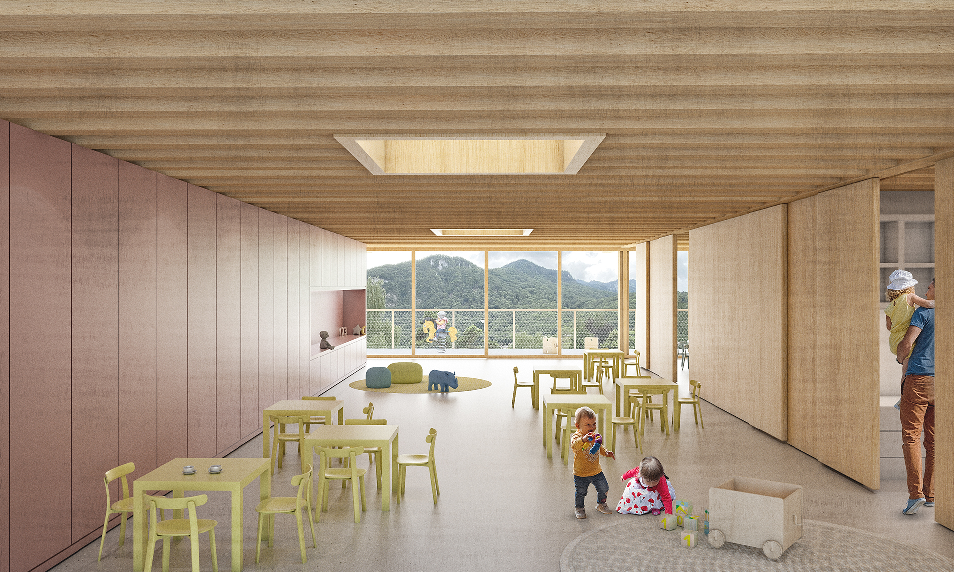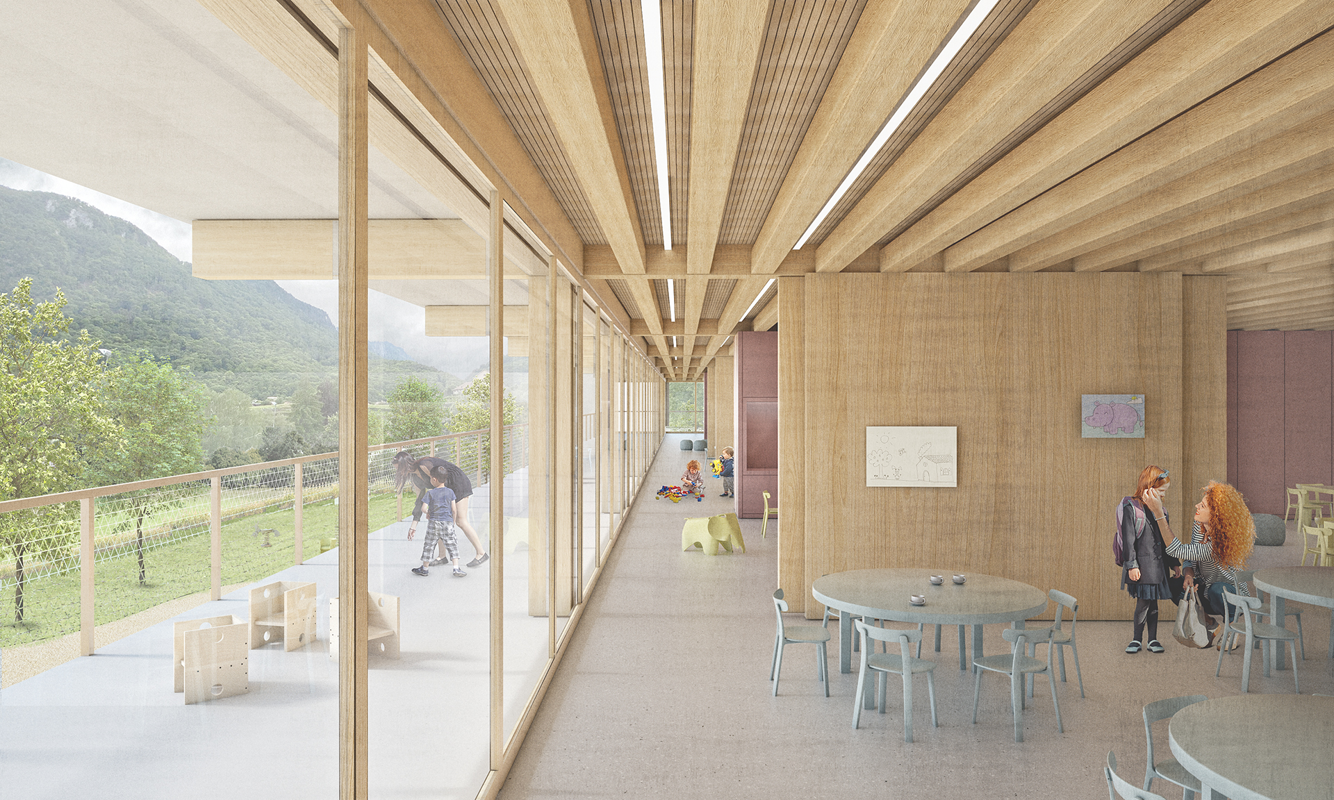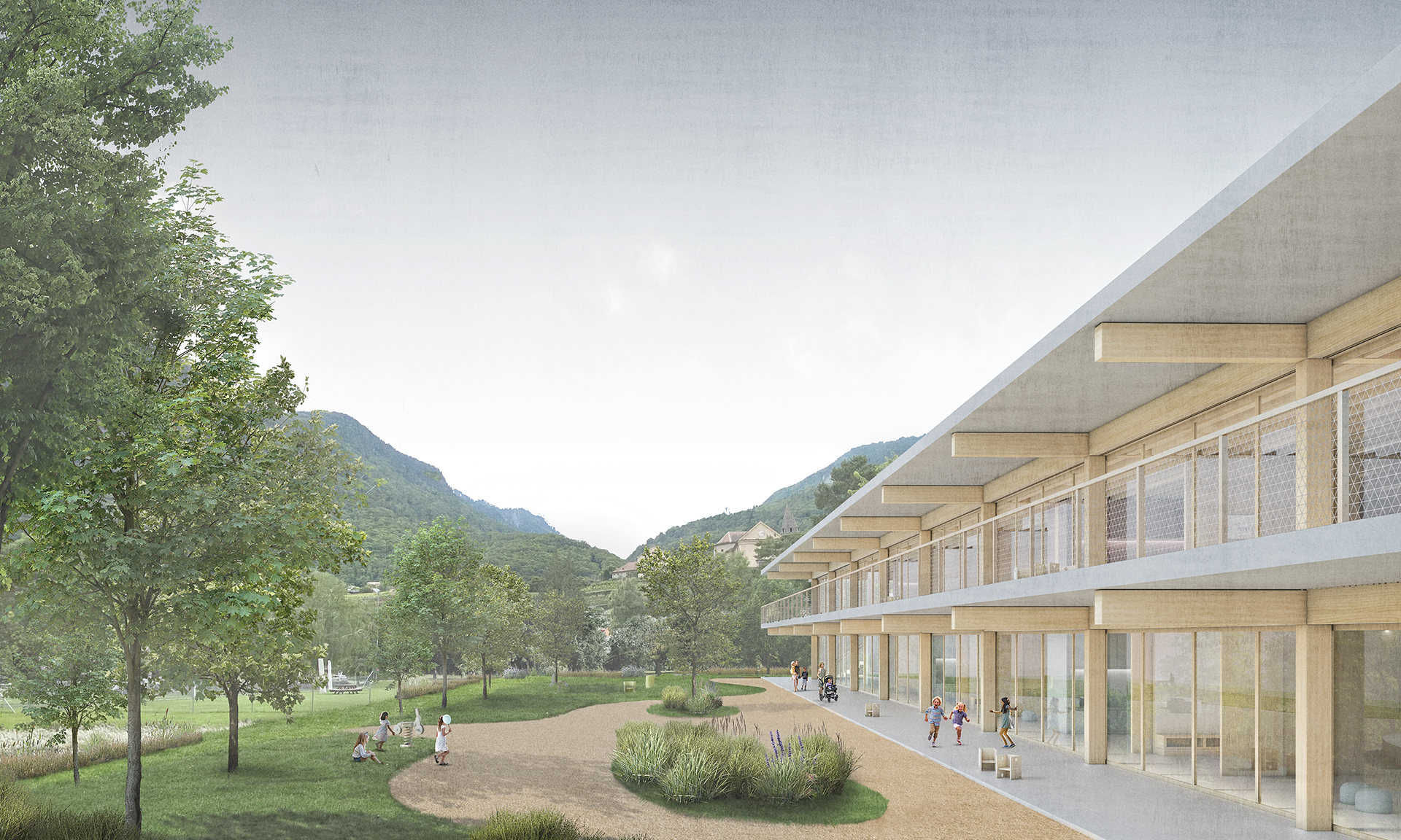 Le nouveau bâtiment met en relation la partie haute du site située le long du chemin des Ecoliers avec la partie basse accueillant le préau scolaire, au moyen d’une passerelle, d’un ascenseur et d’escaliers facilement atteignables par des coursives entourant le bâtiment. On trouve au rez-de-chaussée la nurserie, à l’extrémité ouest, qui bénéficie d’une extension extérieure sécurisée et arborée, ainsi que l’UAPE à l’autre extrémité, en relation directe avec l’école et les terrains de sport voisins, tout en préservant son autonomie spatiale. Le bâtiment est entièrement conçu en structure porteuse bois, à l’exception des coursives et de la cage d’ascenseur en béton armé, qui servent de contreventement à l’ensemble. Les dalles sont constituées de plancher mixtes bois-béton préfabriqués en usine, qui permettent l’usage du bois local et une grande rapidité de mise en œuvre, tout en garantissant le confort acoustique nécessaire pour une structure d’accueil de l’enfance. Les grandes coursives en béton créent d’importants avant-toits, permettant la régulation optimale de la lumière en fonction des saisons. Le bois est également utilisé pour la fabrication des fenêtres ou de tous les panneaux de remplissage ou de doublage des murs intérieurs ou de façade.