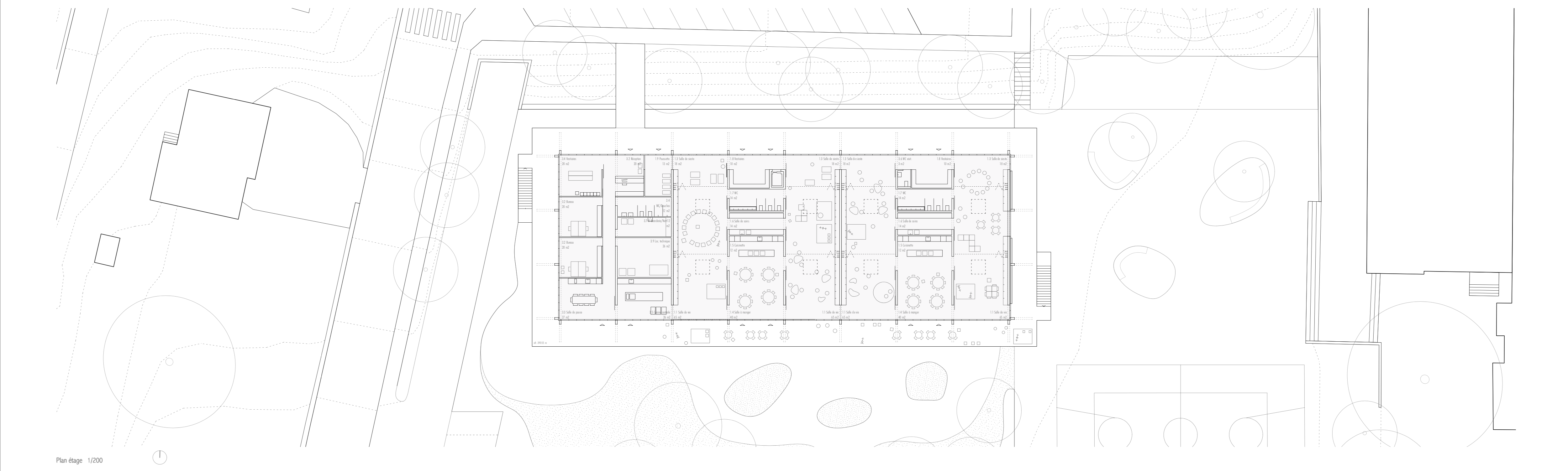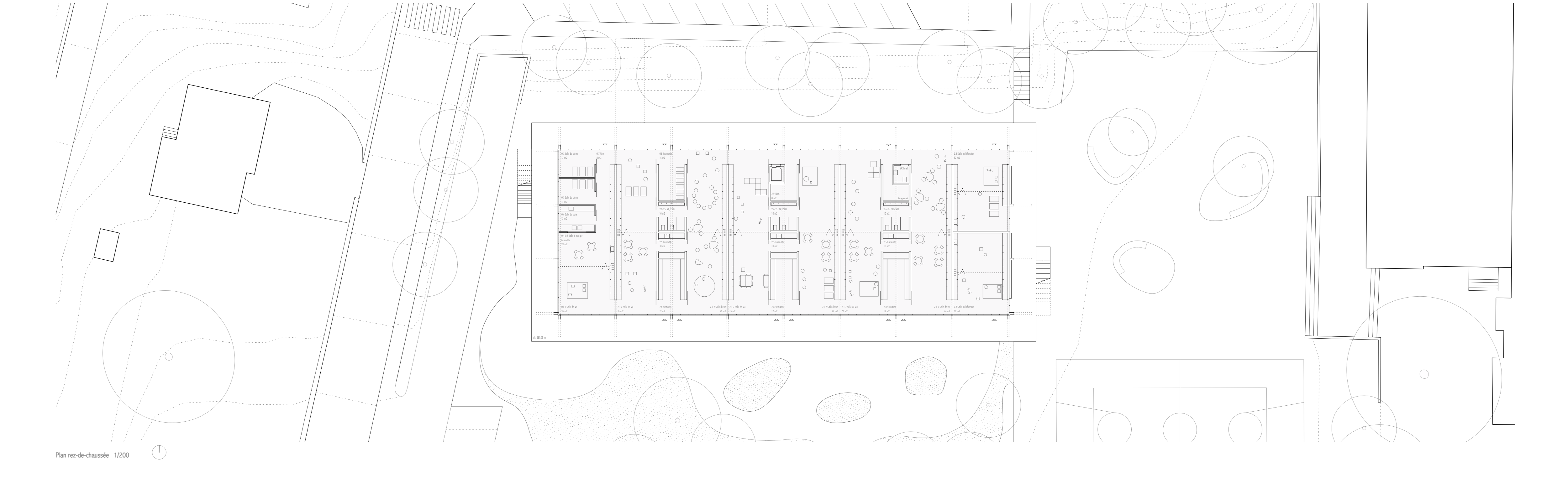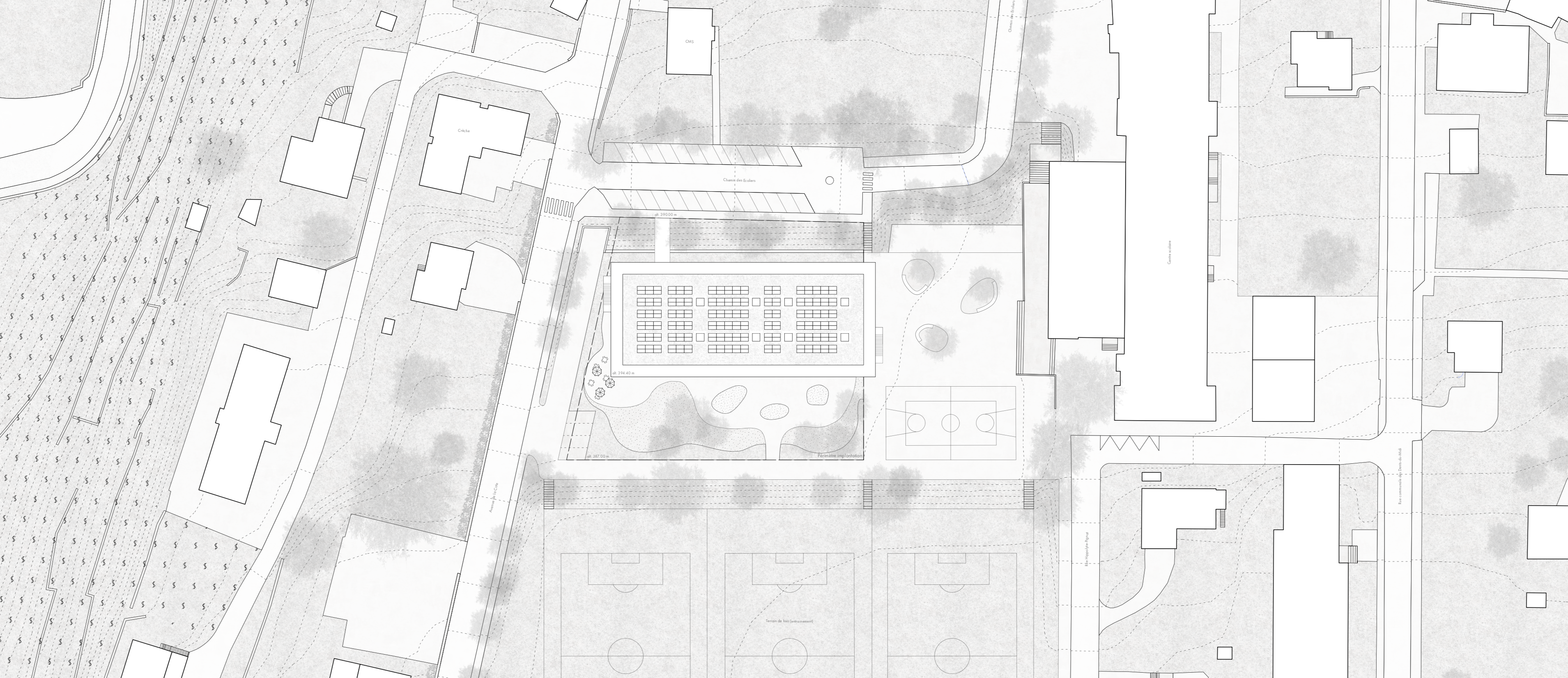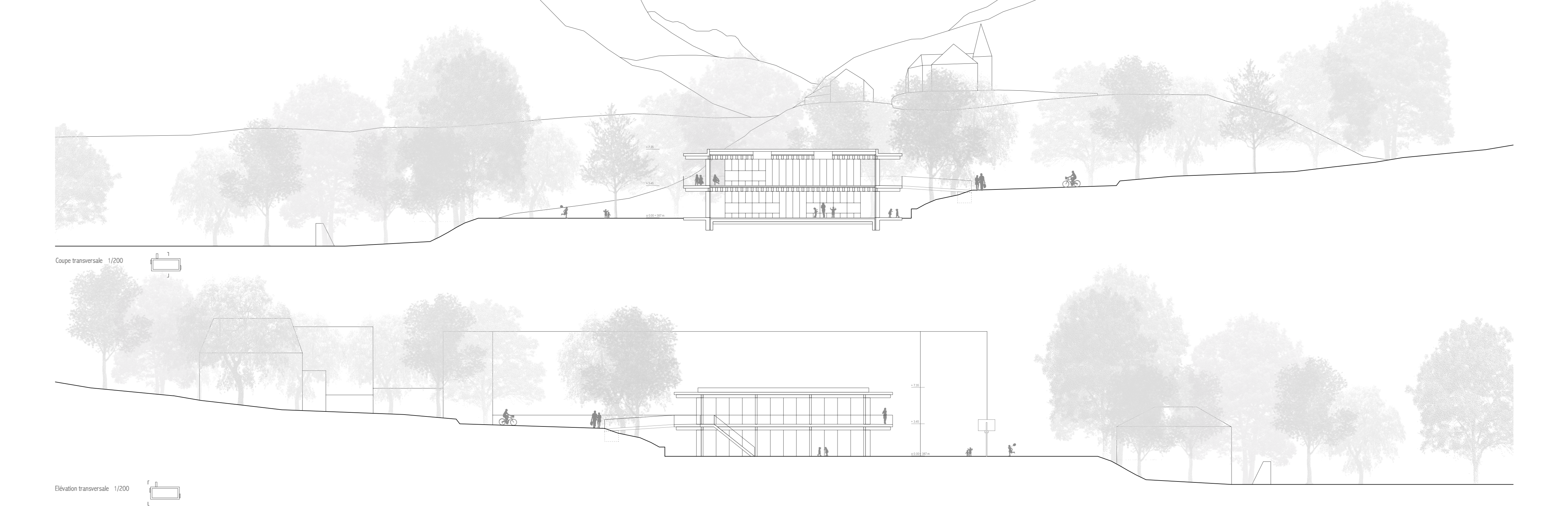 Le nouveau bâtiment met en relation la partie haute du site située le long du chemin des Ecoliers avec la partie basse accueillant le préau scolaire, au moyen d’une passerelle, d’un ascenseur et d’escaliers facilement atteignables par des coursives entourant le bâtiment. On trouve au rez-de-chaussée la nurserie, à l’extrémité ouest, qui bénéficie d’une extension extérieure sécurisée et arborée, ainsi que l’UAPE à l’autre extrémité, en relation directe avec l’école et les terrains de sport voisins, tout en préservant son autonomie spatiale. Le bâtiment est entièrement conçu en structure porteuse bois, à l’exception des coursives et de la cage d’ascenseur en béton armé, qui servent de contreventement à l’ensemble. Les dalles sont constituées de plancher mixtes bois-béton préfabriqués en usine, qui permettent l’usage du bois local et une grande rapidité de mise en œuvre, tout en garantissant le confort acoustique nécessaire pour une structure d’accueil de l’enfance. Les grandes coursives en béton créent d’importants avant-toits, permettant la régulation optimale de la lumière en fonction des saisons. Le bois est également utilisé pour la fabrication des fenêtres ou de tous les panneaux de remplissage ou de doublage des murs intérieurs ou de façade.