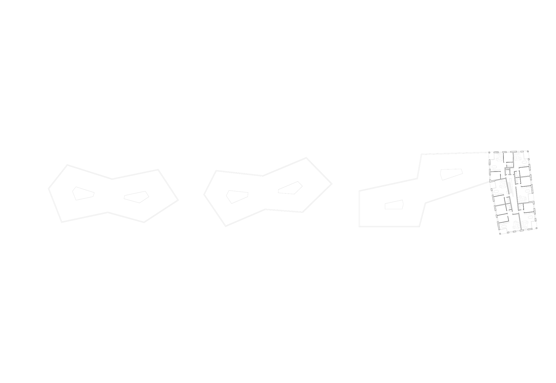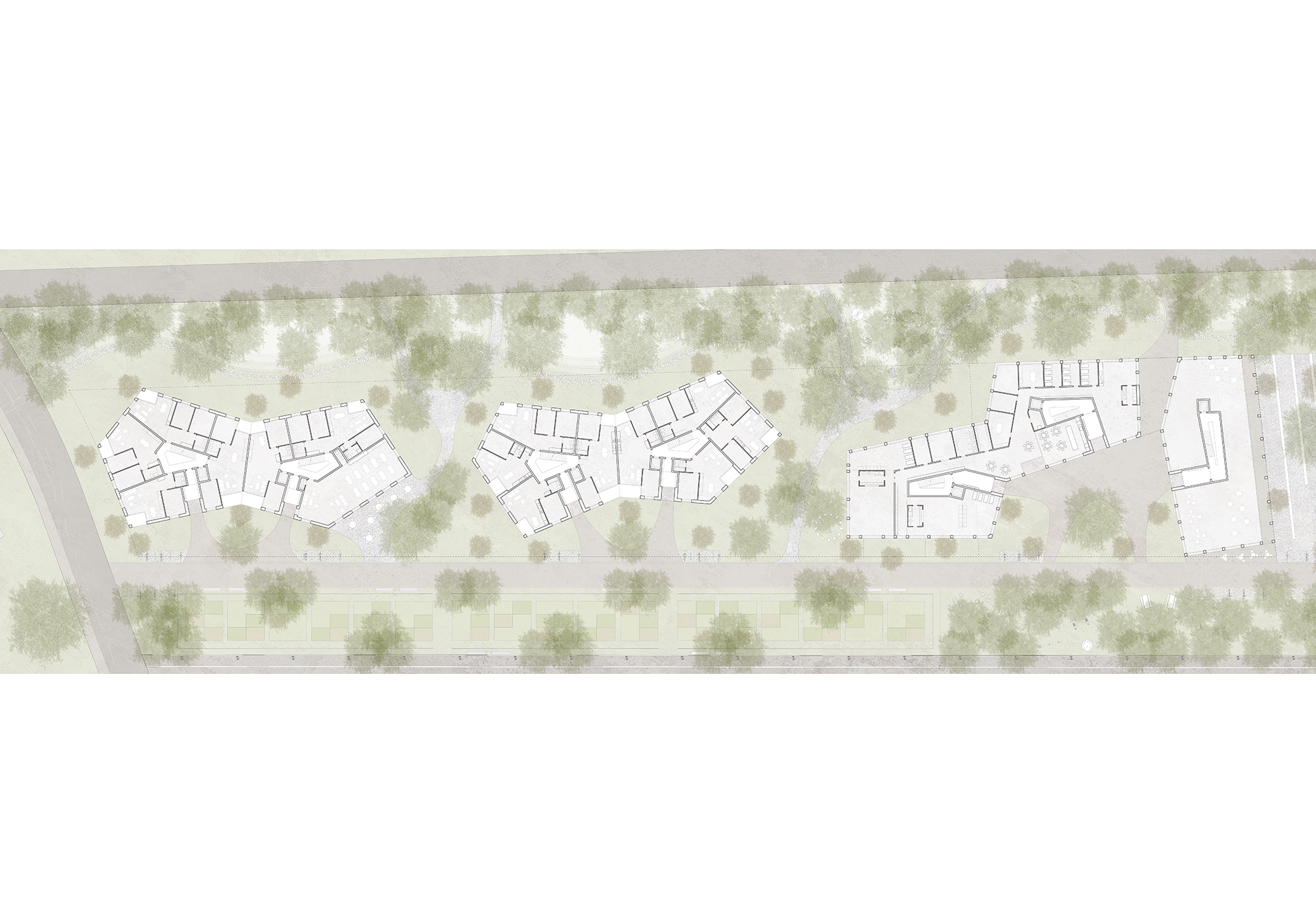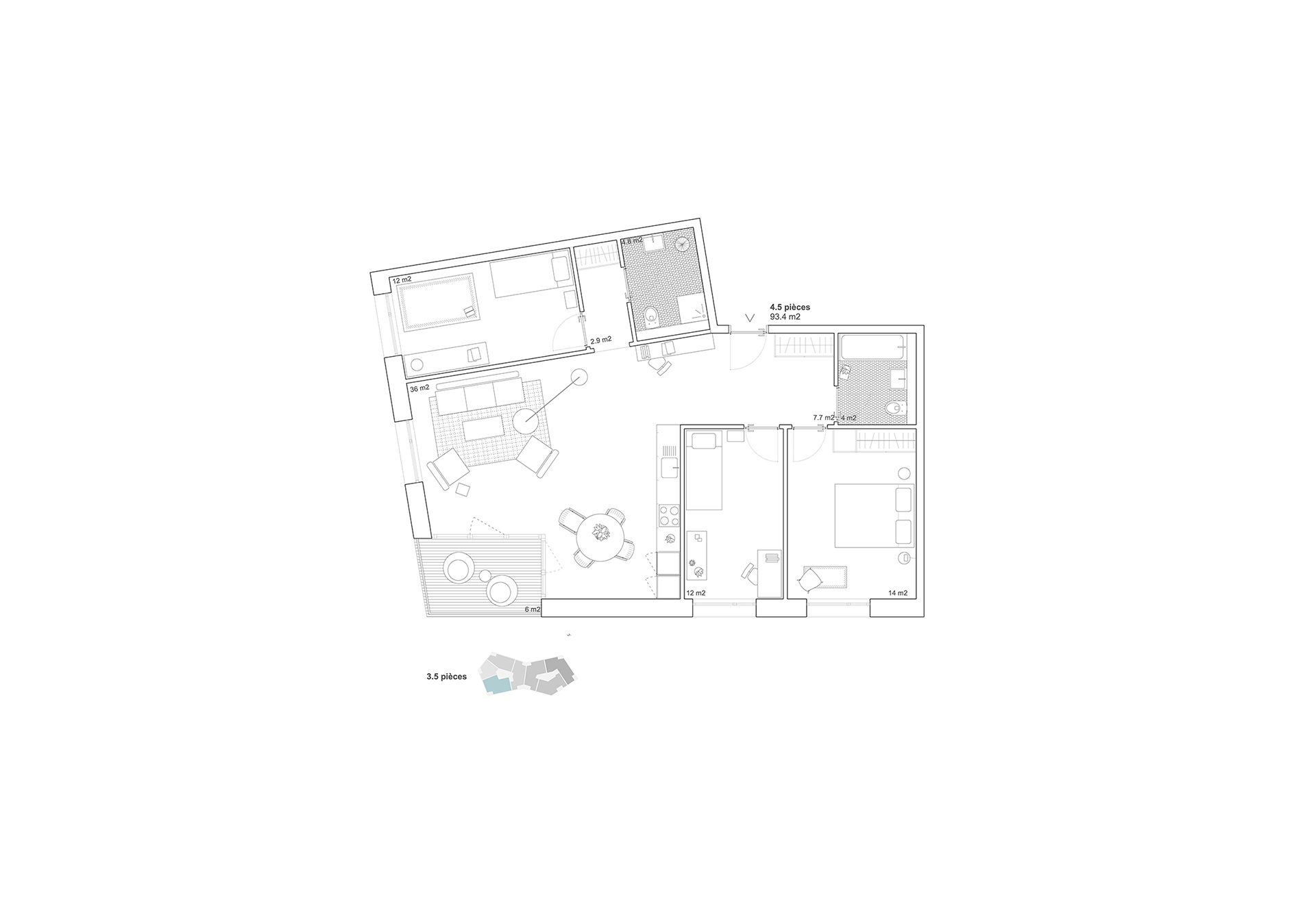 Le concept d’implantation des volumes bâtis des différentes coopératives découle du cahier des principes d’aménagement urbanistique et paysager établi pour l’ensemble du site et plus particulièrement pour la pièce urbaine C. La forme urbaine de cette pièce longue et étroite s’apparente à une barre et non pas à un ilôt, comme c’est le cas pour d’autres pièces urbaines sur le site. En partant de cette forme linéaire initiale, sans redent ni décalage, et en la rendant plus perméable par la multiplication des passages traversant le site, la continuité de la figure s’enrichit de séquences et de déformations qui font la part belle aux aménagements extérieurs et aux plantations, malgré la densité importante du programme de logements demandé. L’organisation des appartements se veut simple et rationnelle. Les angles des différents bâtiments accueillent les pièces de jour, les façades linéaires les chambres qui sont de forme rectangulaire. L’organisation des appartements se veut simple et rationnelle. Les angles des différents bâtiments accueillent les pièces de jour, les façades linéaires les chambres qui sont de forme rectangulaire. Depuis l’entrée du logement, un hall doté d’une armoire/vestiaire distribue les chambres et les locaux sanitaires. Dans son prolongement, les pièces de jour de l’appartement se dévoilent dans toute leur profondeur et leur spatialité. Cette séquence se termine par le balcon/loggia qui organise et différencie le séjour du coin cuisine/salle à manger. L’absence de couloirs au profit de surfaces de dégagement plus généreuses restitue plus de surface utile pour le logement, appropriable pour des usages variés (coins bureau, surface de jeu, rangements/bibliothèque).