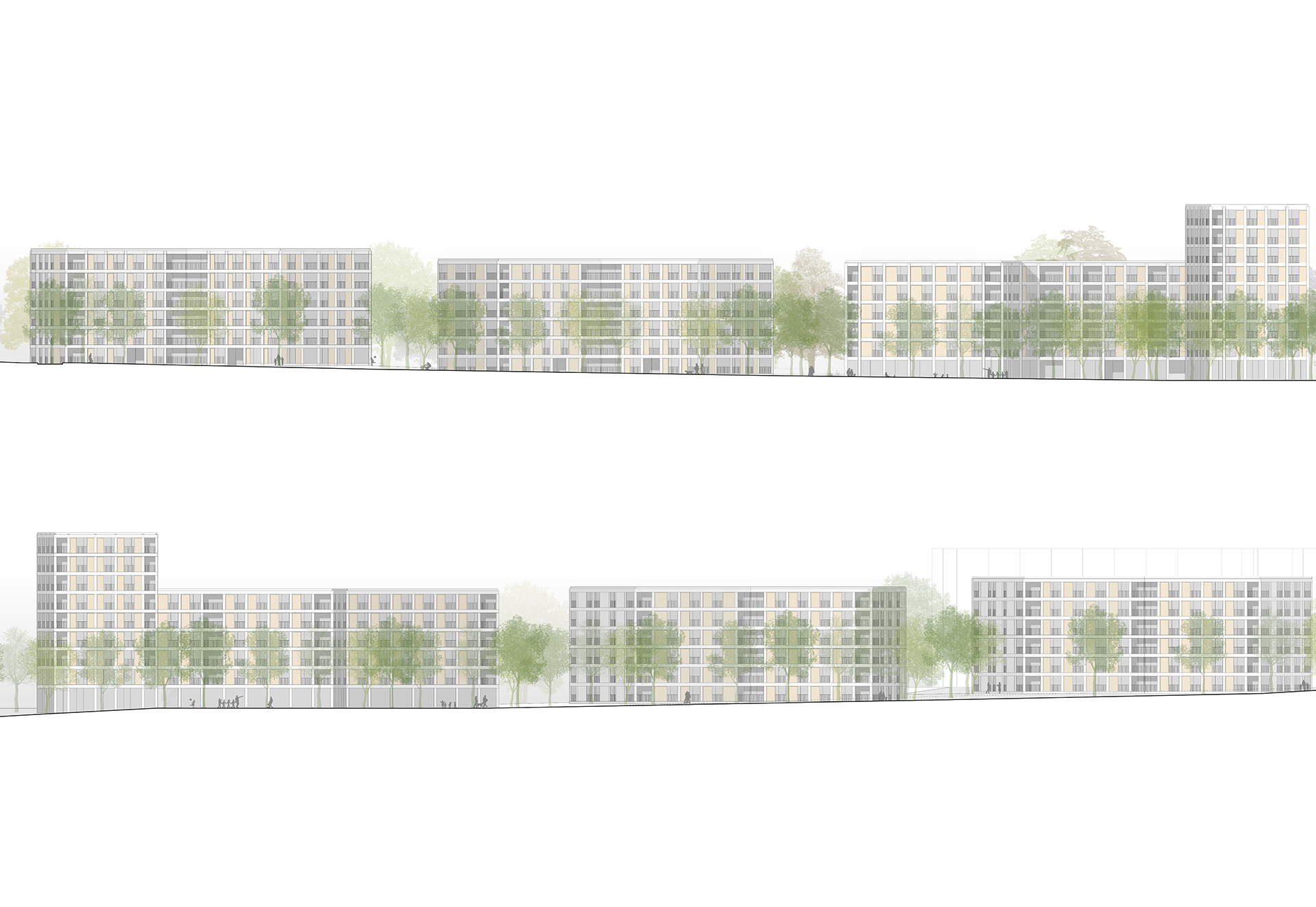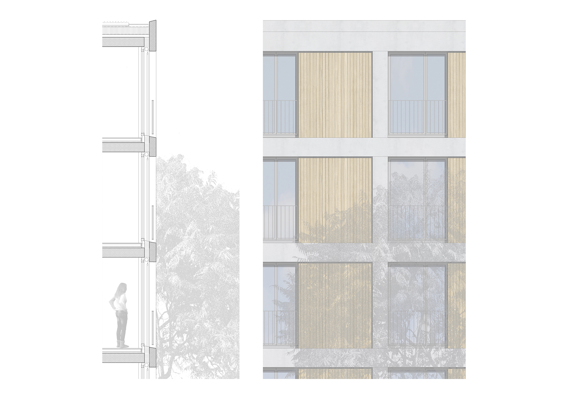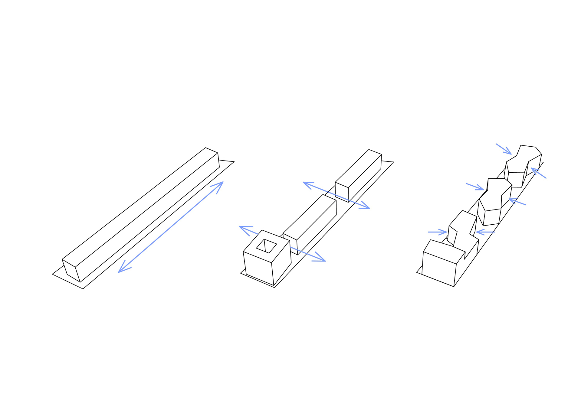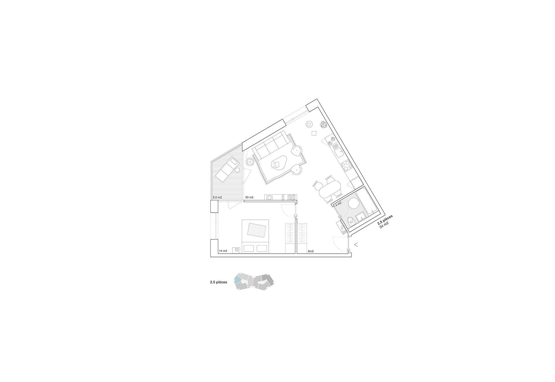 Le concept d’implantation des volumes bâtis des différentes coopératives découle du cahier des principes d’aménagement urbanistique et paysager établi pour l’ensemble du site et plus particulièrement pour la pièce urbaine C. La forme urbaine de cette pièce longue et étroite s’apparente à une barre et non pas à un ilôt, comme c’est le cas pour d’autres pièces urbaines sur le site. En partant de cette forme linéaire initiale, sans redent ni décalage, et en la rendant plus perméable par la multiplication des passages traversant le site, la continuité de la figure s’enrichit de séquences et de déformations qui font la part belle aux aménagements extérieurs et aux plantations, malgré la densité importante du programme de logements demandé. L’organisation des appartements se veut simple et rationnelle. Les angles des différents bâtiments accueillent les pièces de jour, les façades linéaires les chambres qui sont de forme rectangulaire. L’organisation des appartements se veut simple et rationnelle. Les angles des différents bâtiments accueillent les pièces de jour, les façades linéaires les chambres qui sont de forme rectangulaire. Depuis l’entrée du logement, un hall doté d’une armoire/vestiaire distribue les chambres et les locaux sanitaires. Dans son prolongement, les pièces de jour de l’appartement se dévoilent dans toute leur profondeur et leur spatialité. Cette séquence se termine par le balcon/loggia qui organise et différencie le séjour du coin cuisine/salle à manger. L’absence de couloirs au profit de surfaces de dégagement plus généreuses restitue plus de surface utile pour le logement, appropriable pour des usages variés (coins bureau, surface de jeu, rangements/bibliothèque).