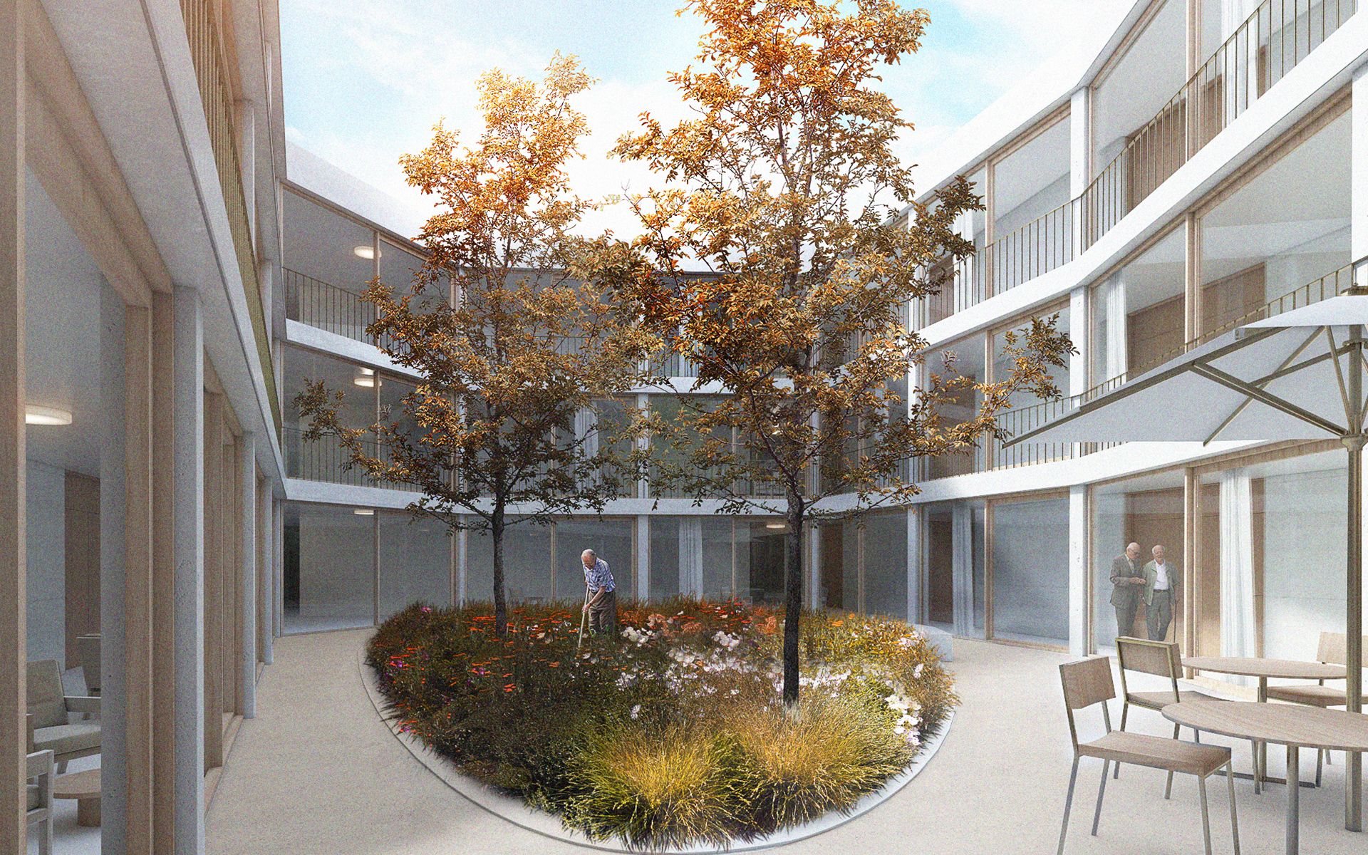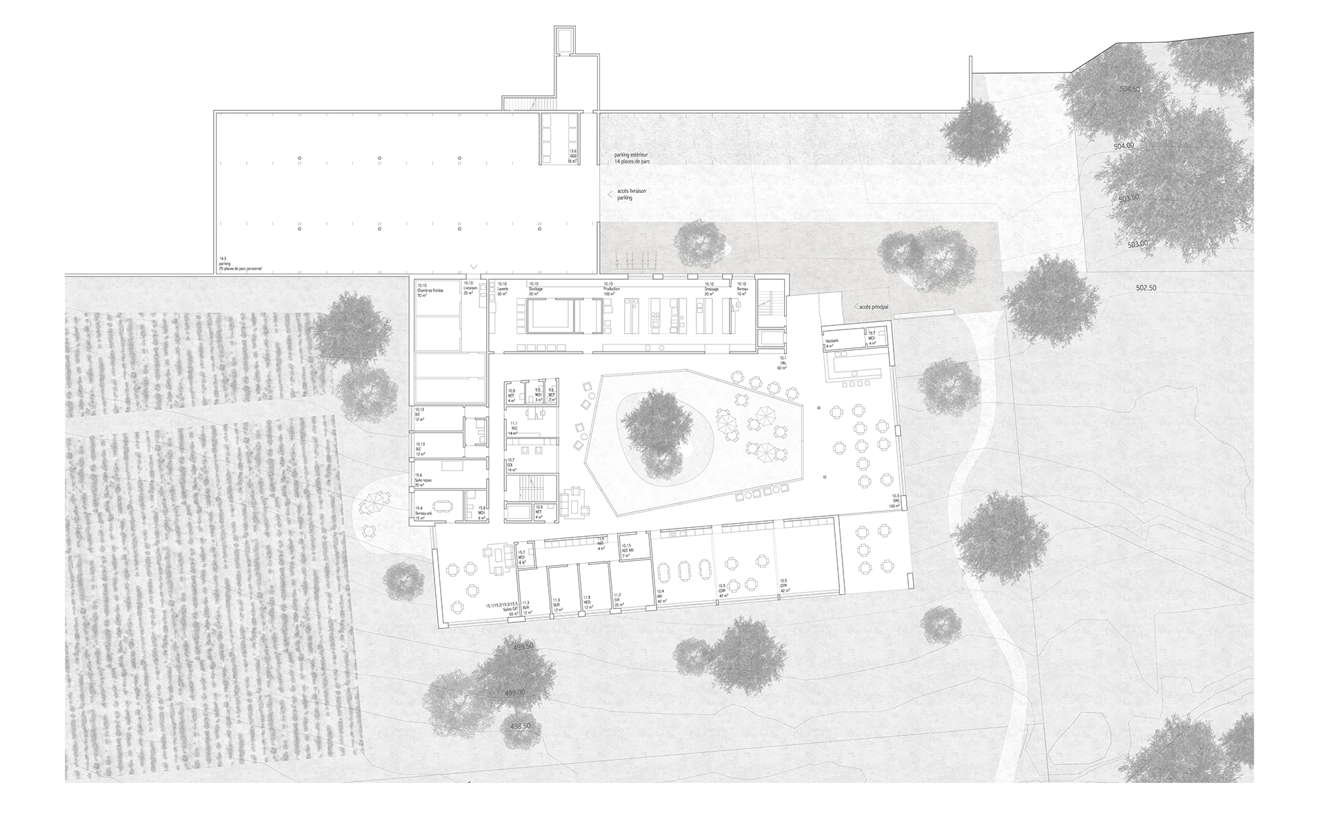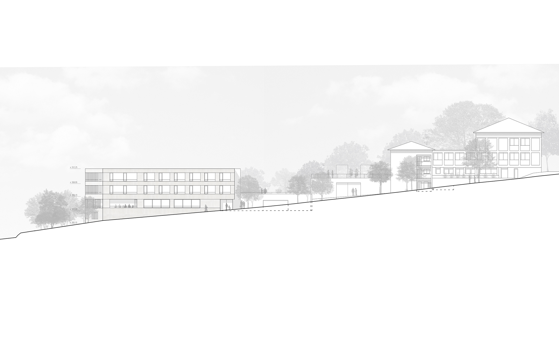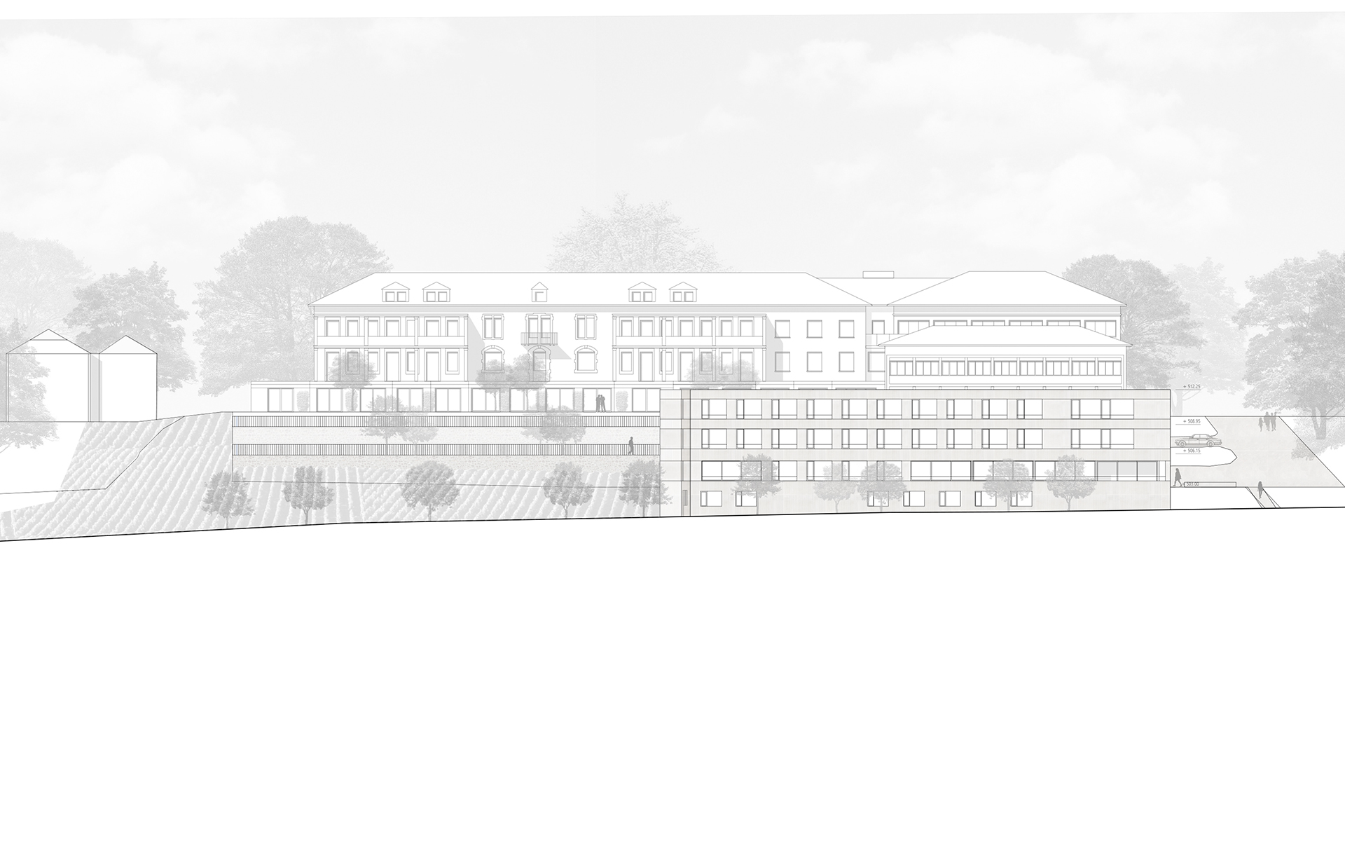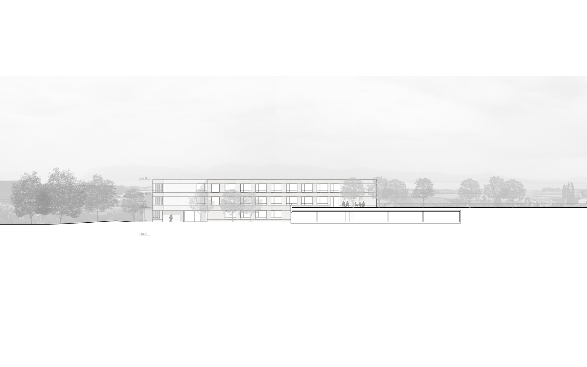 L'agrandissement s'implante à l'est, dans la partie basse de la parcelle, de manière à ménager les dégagements des constructions actuelles et futures sur le paysage de la Côte et du lac Léman. L'accès à L'EMS et au parking couvert de 24 places se fait depuis le plateau inférieur. L'accès au parking couvert se fait sur le même principe que celui de l'abri de protection civile, en traversant le parking à ciel ouvert. L'ensemble des places de parc des deux plateaux de parking est maintenu et réorganisé de manière à ménager une généreuse esplanade d’entrée à l'EMS, libre de tout trafic automobile. Cette esplanade est traitée comme une place piétonne. La toiture du parking couvert est traitée comme un jardin en terrasse, faisant écho au jardin en terrasse existant. Les chambres sont disposées en boucle sur deux étages accessibles par un escalier et un ascenseur propre. Le parcours en boucle des résidents autour de la cour centrale est ponctué d’espaces de dégagement et de repos. Le séjour d'unité est situé de manière à profiter au mieux de la vue privilégiée sur le paysage lémanique. Le rez-de-chaussée accueille toutes les fonctions communes de l’institution (bar-réception, salle à manger et salles polyvalentes, coiffeur) qui se regroupent autour du patio central pour former "la place du village".
