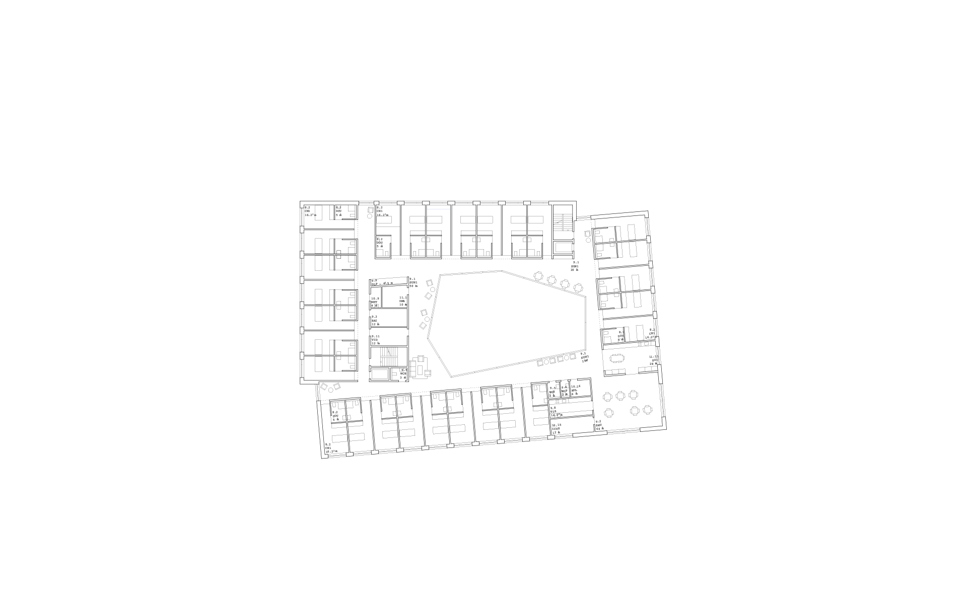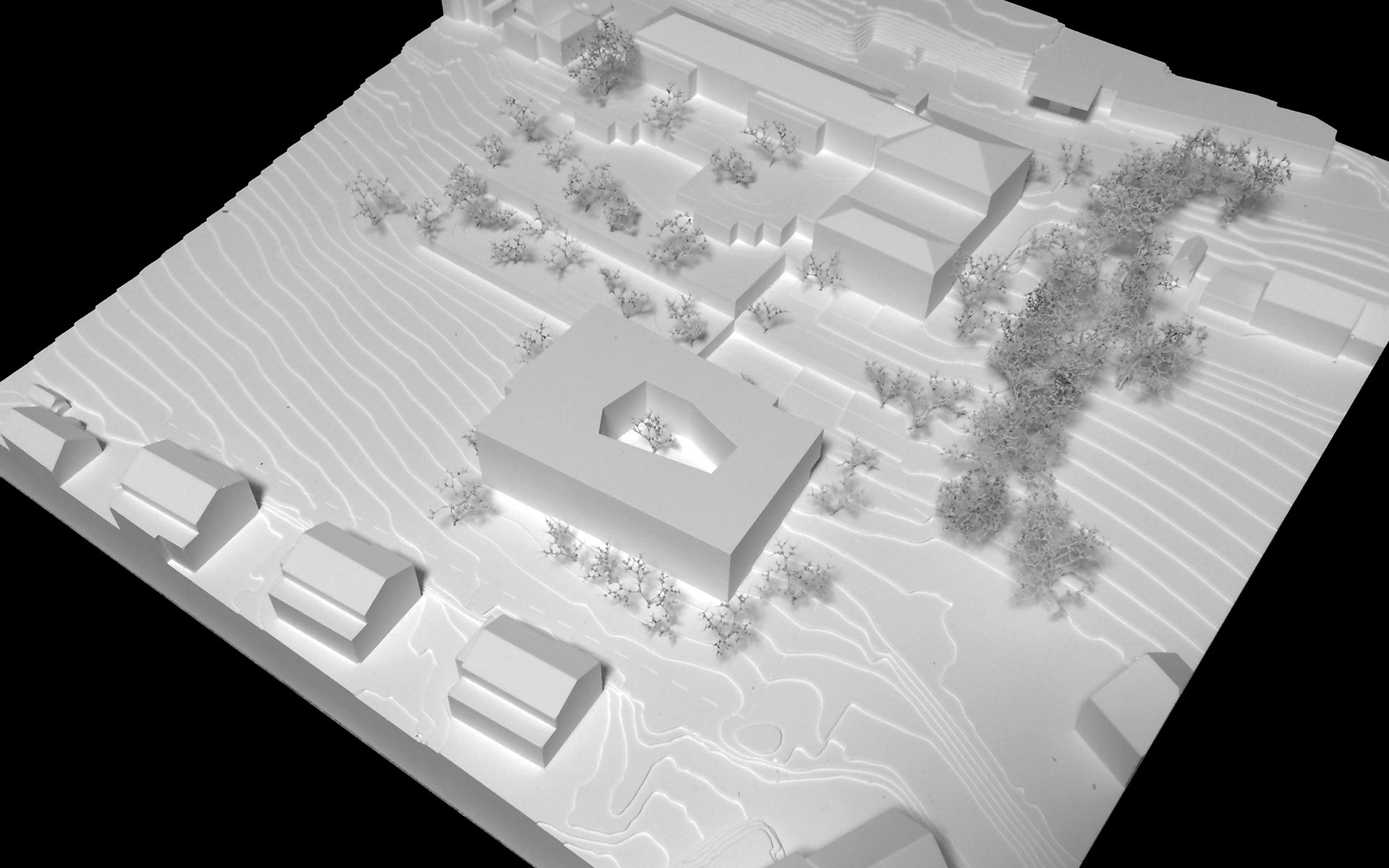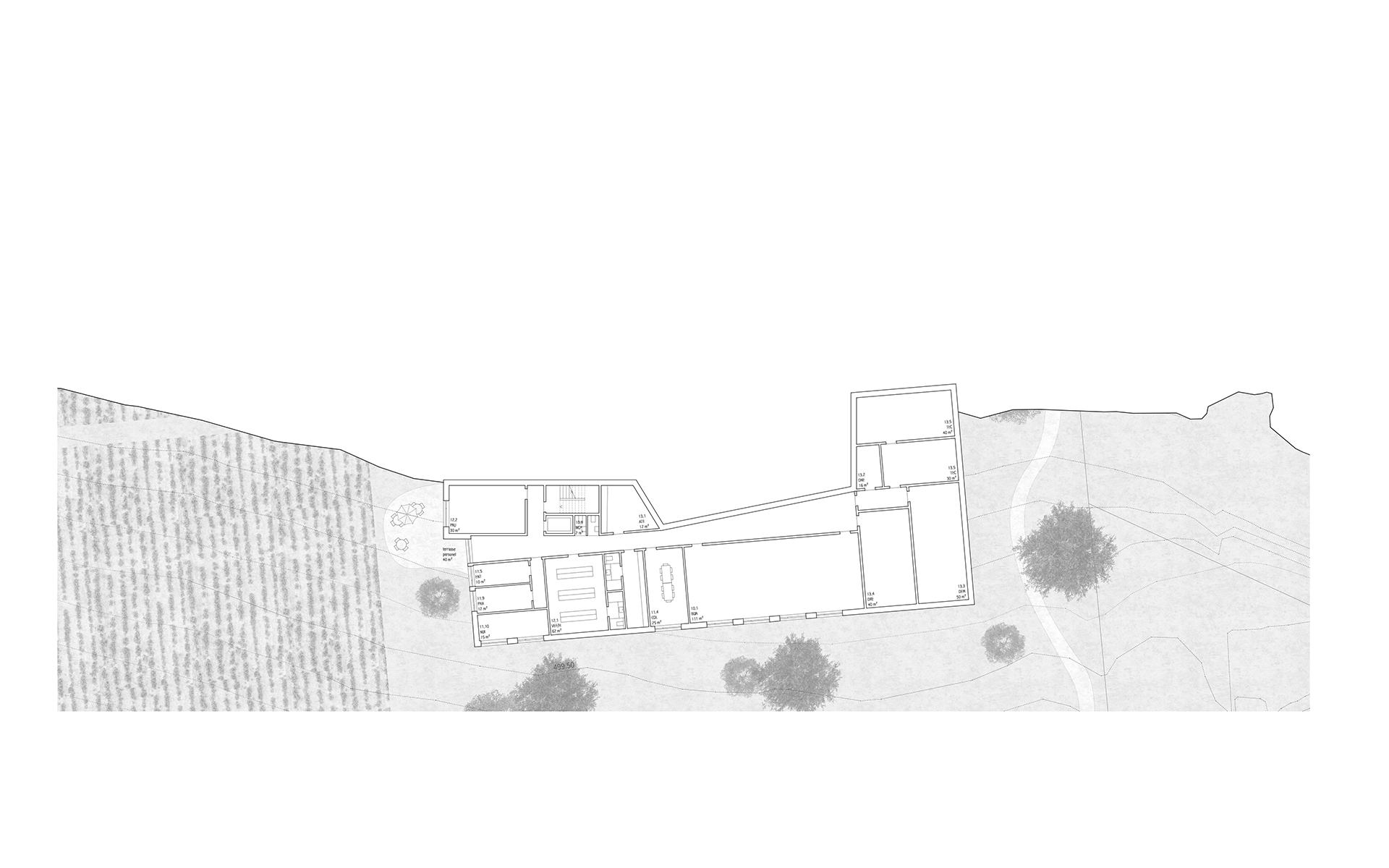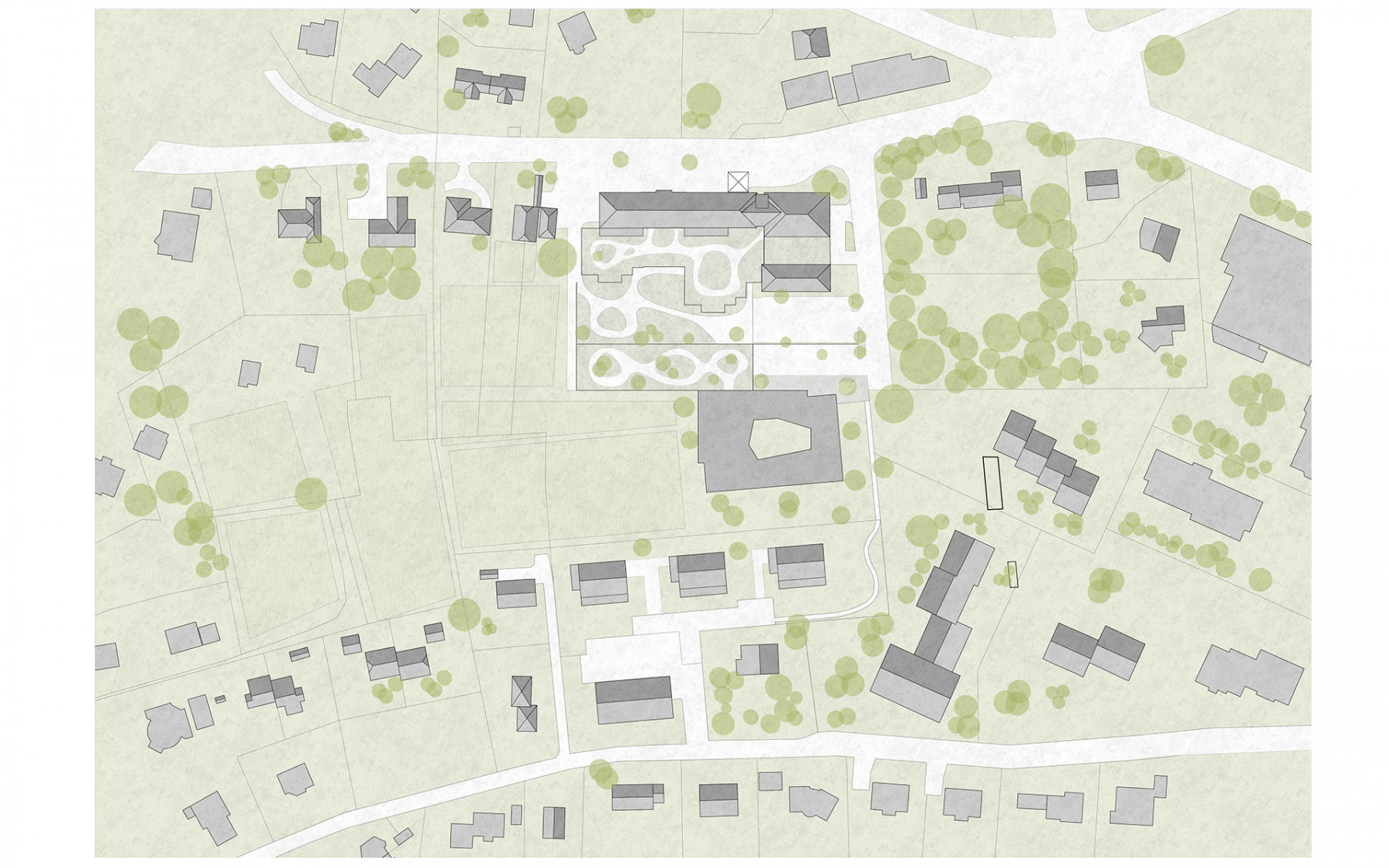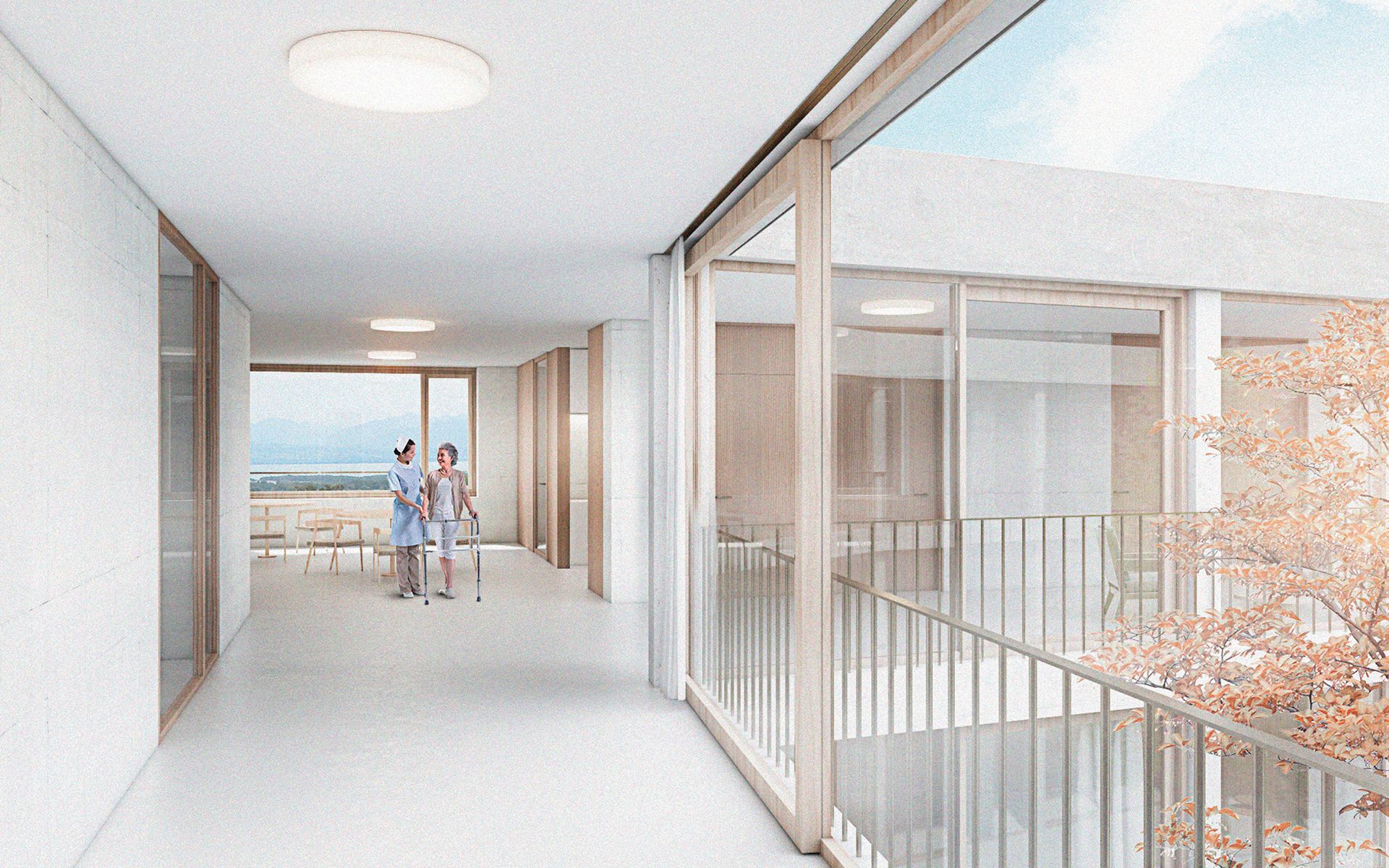 L'agrandissement s'implante à l'est, dans la partie basse de la parcelle, de manière à ménager les dégagements des constructions actuelles et futures sur le paysage de la Côte et du lac Léman. L'accès à L'EMS et au parking couvert de 24 places se fait depuis le plateau inférieur. L'accès au parking couvert se fait sur le même principe que celui de l'abri de protection civile, en traversant le parking à ciel ouvert. L'ensemble des places de parc des deux plateaux de parking est maintenu et réorganisé de manière à ménager une généreuse esplanade d’entrée à l'EMS, libre de tout trafic automobile. Cette esplanade est traitée comme une place piétonne. La toiture du parking couvert est traitée comme un jardin en terrasse, faisant écho au jardin en terrasse existant. Les chambres sont disposées en boucle sur deux étages accessibles par un escalier et un ascenseur propre. Le parcours en boucle des résidents autour de la cour centrale est ponctué d’espaces de dégagement et de repos. Le séjour d'unité est situé de manière à profiter au mieux de la vue privilégiée sur le paysage lémanique. Le rez-de-chaussée accueille toutes les fonctions communes de l’institution (bar-réception, salle à manger et salles polyvalentes, coiffeur) qui se regroupent autour du patio central pour former "la place du village".