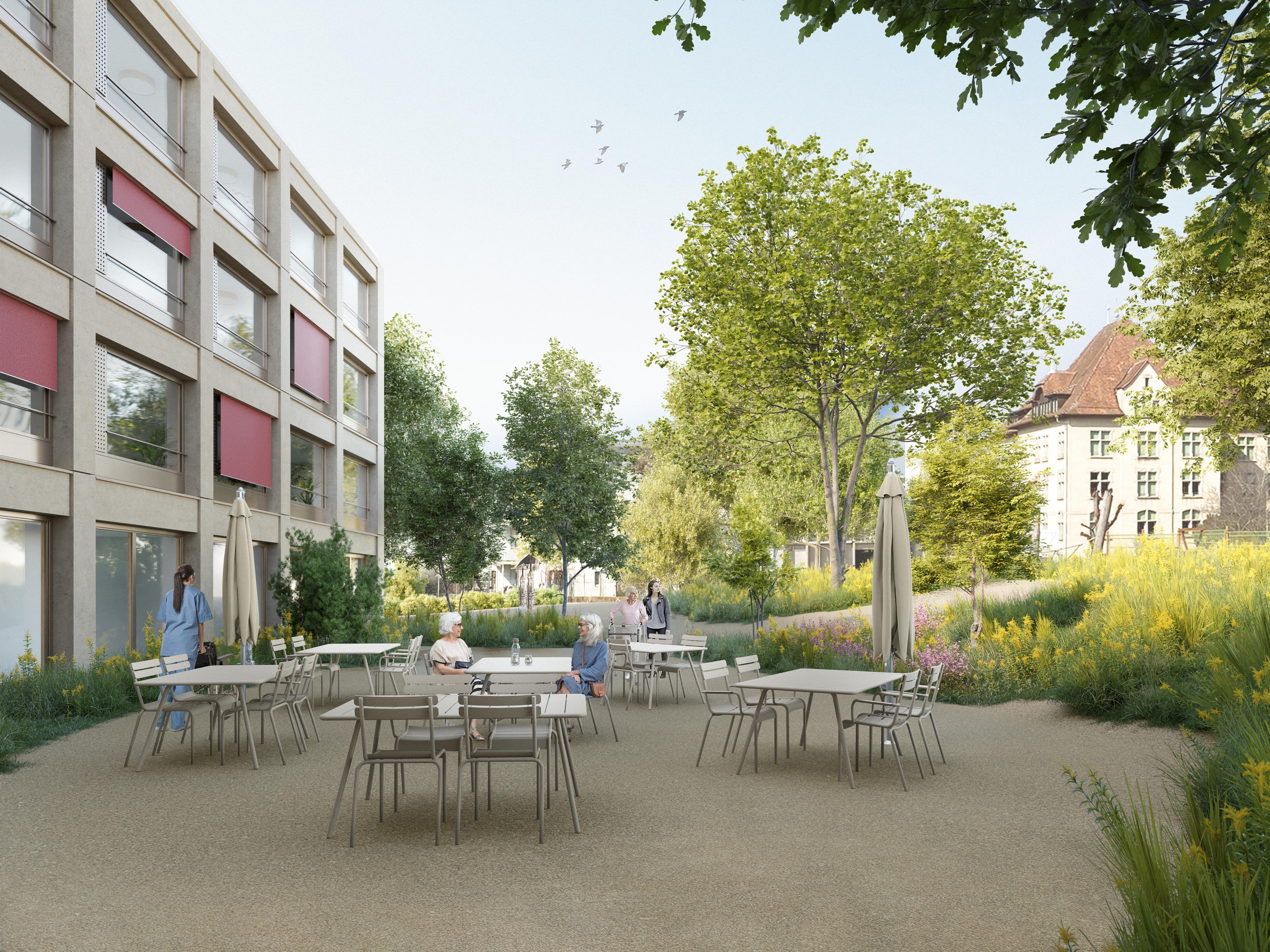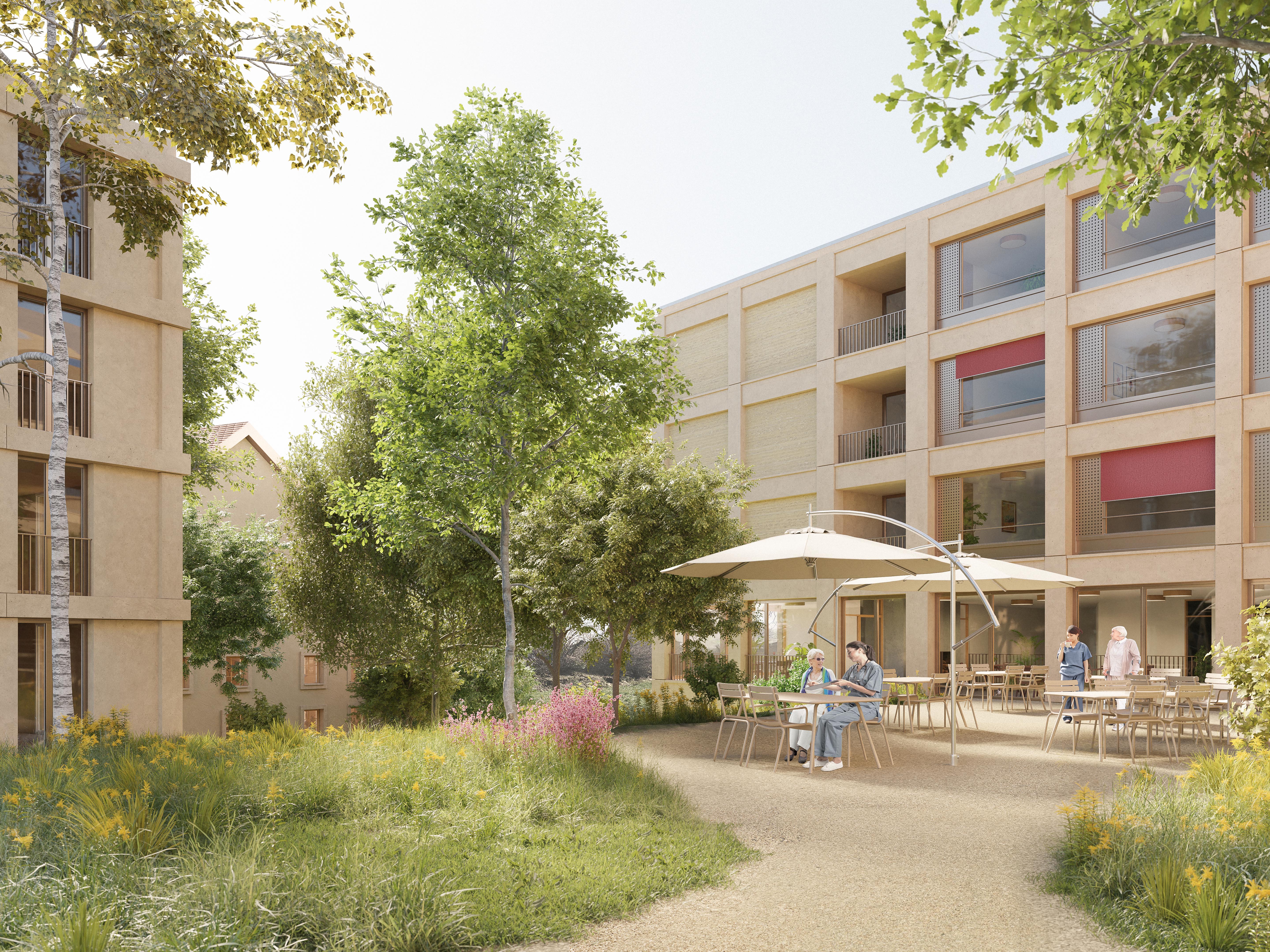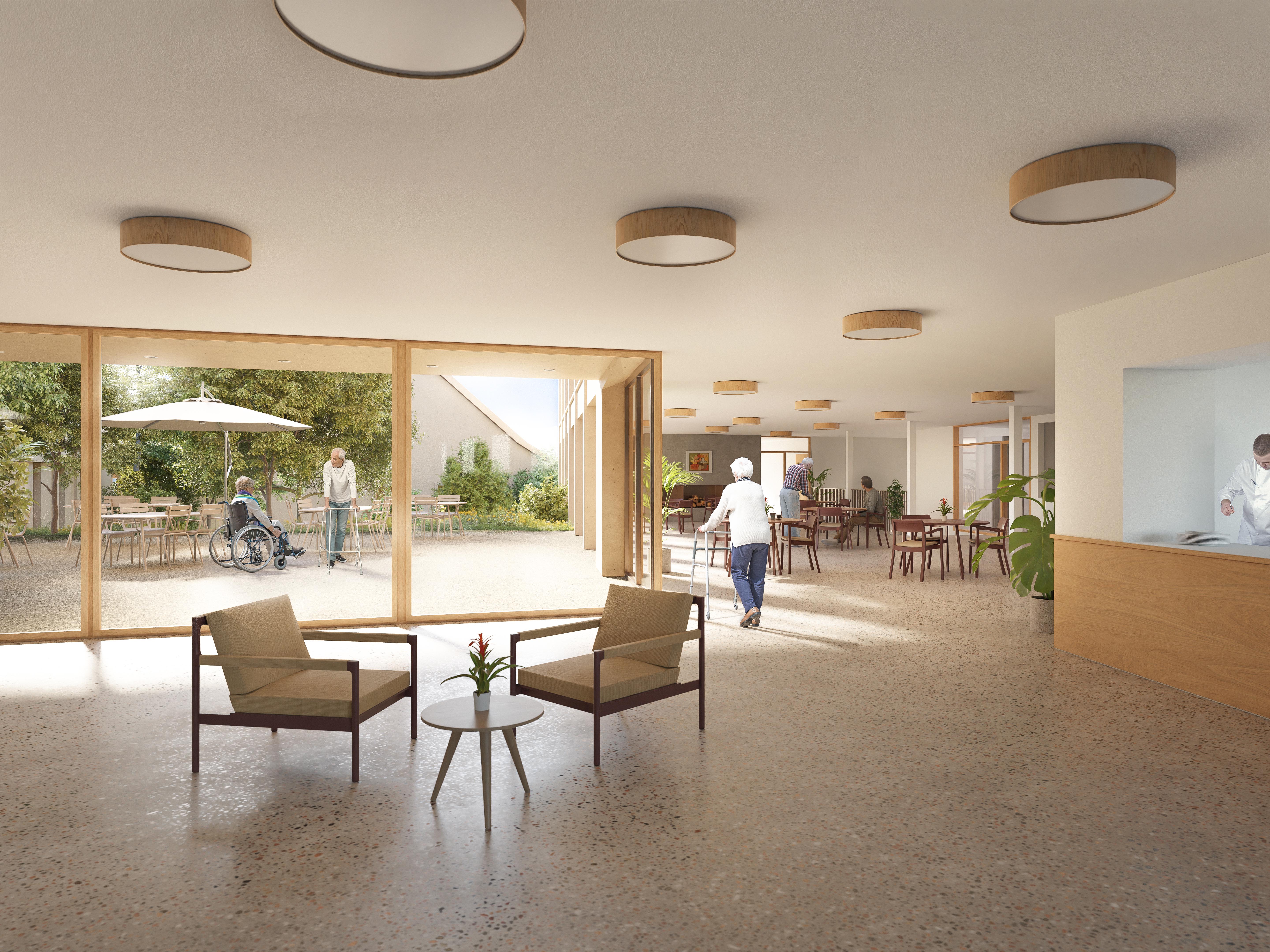 Le bâtiment de l’EMS définit un espace représentatif et doit, par conséquent, être ouvert et assurer le lien entre le quartier de la gare et l’école du Sacré-Coeur ainsi que la cité historique, tout en respectant l’intimité de sa fonction de résidence médicalisée pour anciens, immergée dans un grand parc nouvellement créé. La morphologie proposée, de forme compacte et réduite à l’essentiel, permet de dégager de part et d’autre du site de généreux espaces de jardin et des terrasses qui prolongent les différentes activités des parties communes. L’insertion naturelle dans le terrain en pente permet de dégager un niveau d’entrée situé de plain-pied et un niveau de jardin à l’étage supérieur sur lequel s’ouvrent les locaux les plus publics (restaurant, cafeteria, salle polyvalente, foyer de jour, etc.). Les unités de vie de 30 chambres chacune sont ensuite réparties sur les 3 étages restants. La forme de « 8 » qui résulte de la morphologie proposée permet de réduire l’impact du volume et ses longueurs de façades, tout en gardant à l’intérieur des parcours en boucles pour les résidents.