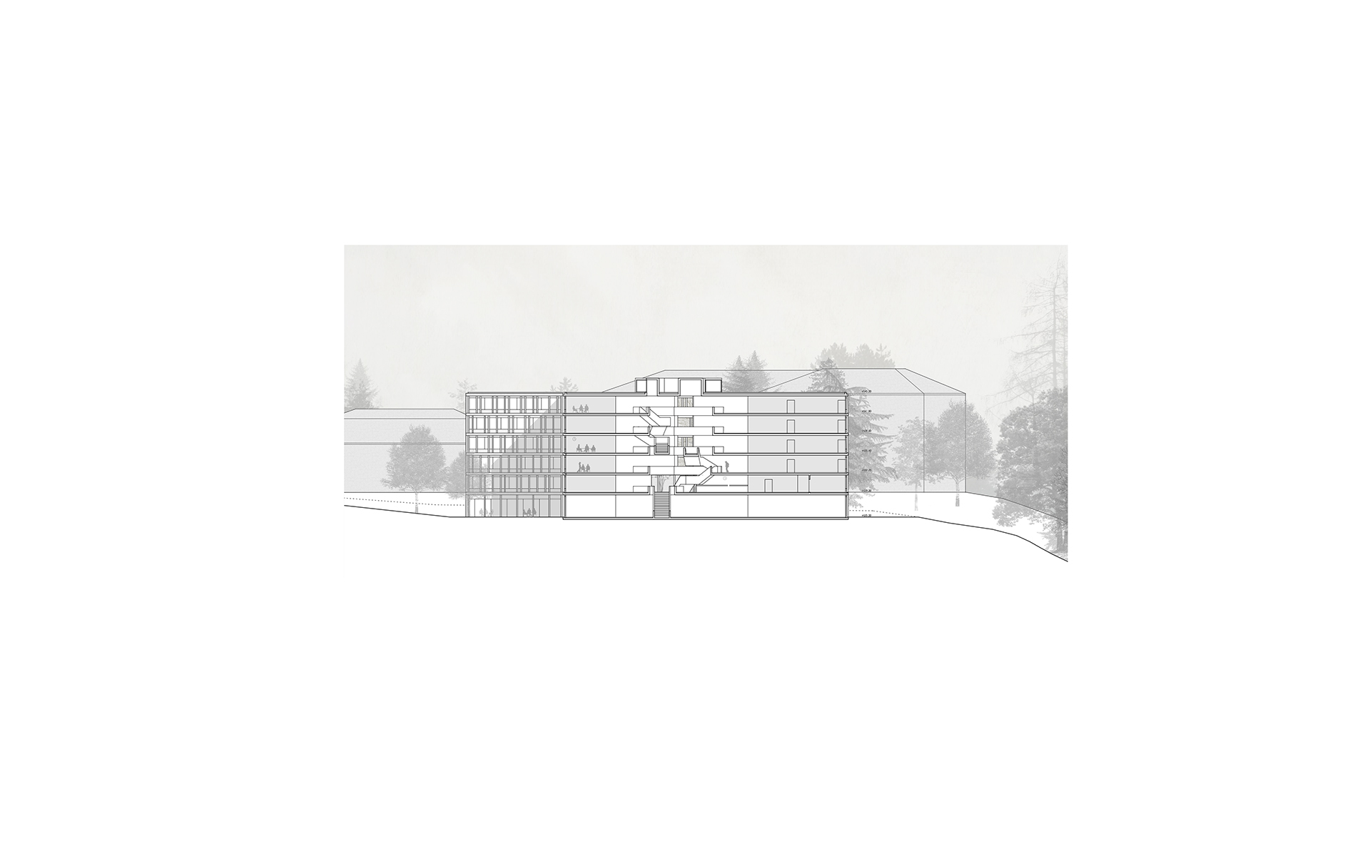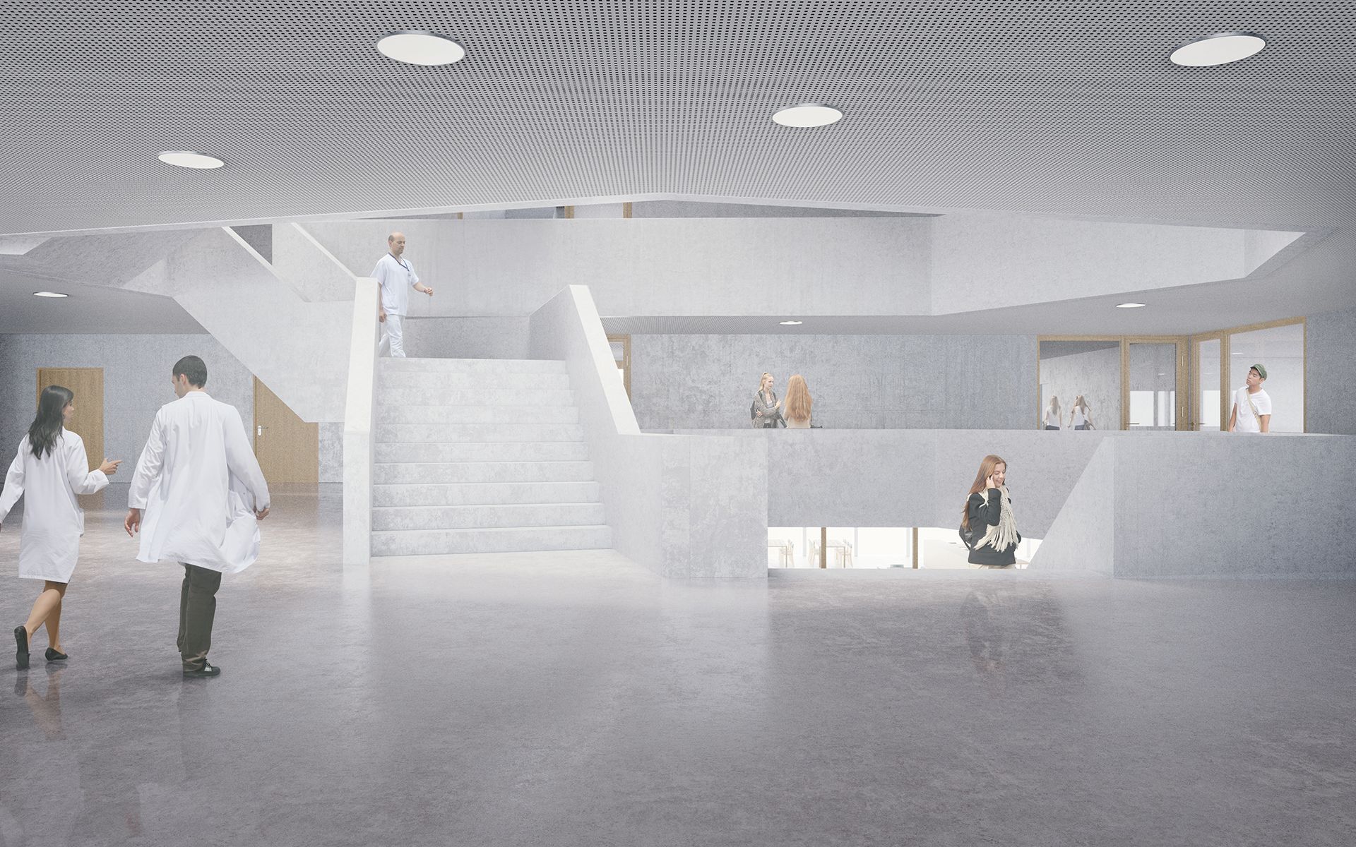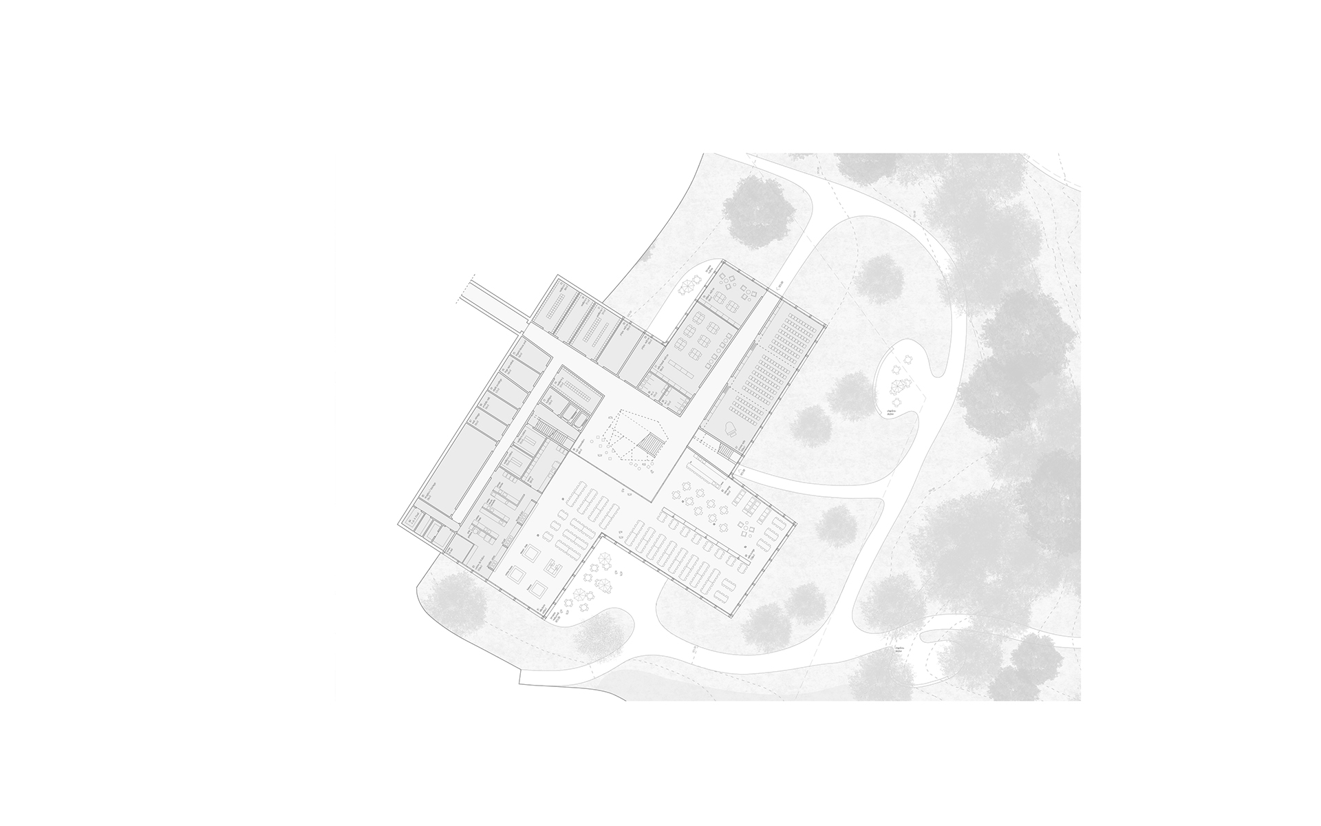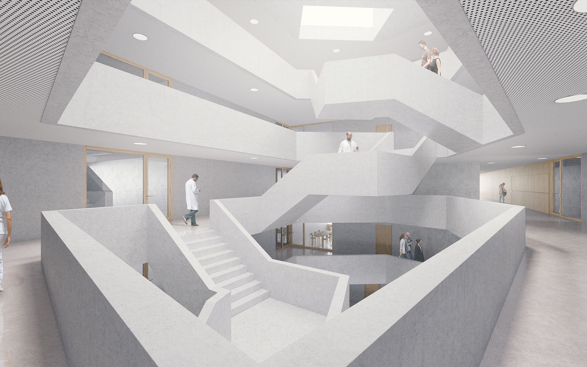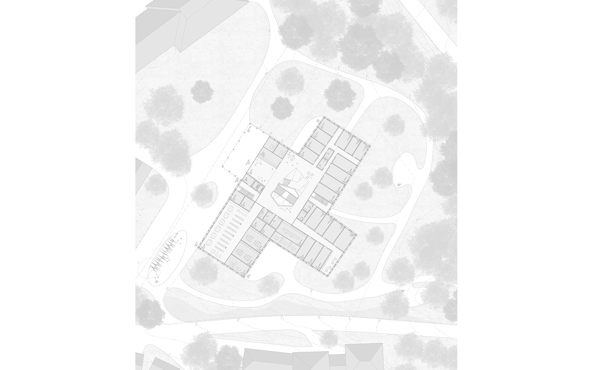 La nouvelle école est implantée en bordure du parc de l’hôpital, à la rupture de pente entre le plateau de l’hôpital et le terrain en contrebas. Une grande place d’accueil sert d’espace de liaison et d’accueil aux cheminements des élèves avant leur entrée dans l’école, que ce soit depuis l’arrêt de bus au nord, depuis les parkings P1 et P2 ou depuis la route d’accès au site. Cette cour d’entrée fait également office de préau. Le volume proposé est volontairement articulé et découpé, créant des espaces extérieurs différenciés permettant de réduire l’échelle du bâtiment dans le contexte bâti. Les décrochements induits par la figure géométrique offrent de petits pans de façades vis à vis du bâti environnant, tandis que les branches déploient des longueurs de façade similaires aux constructions voisines. Le nouvel édifice est conçu sur une base cruciforme : d’un « cœur », le grand atrium contenant les circulations verticales où tout le monde converge, on atteint les « branches » où sont disposés tous les locaux du programme, créant ainsi des sous-unités de plus petite taille. Le projet se développe sur un rez supérieur accueillant le pôle administratif et le pôle documentation (médiathèque) et un rez inférieur accueillant le pôle restauration en contact avec le jardin. Les 4 niveaux supérieurs sont similaires : ils accueillent les salles de classes et les salles spéciales de simulation.
