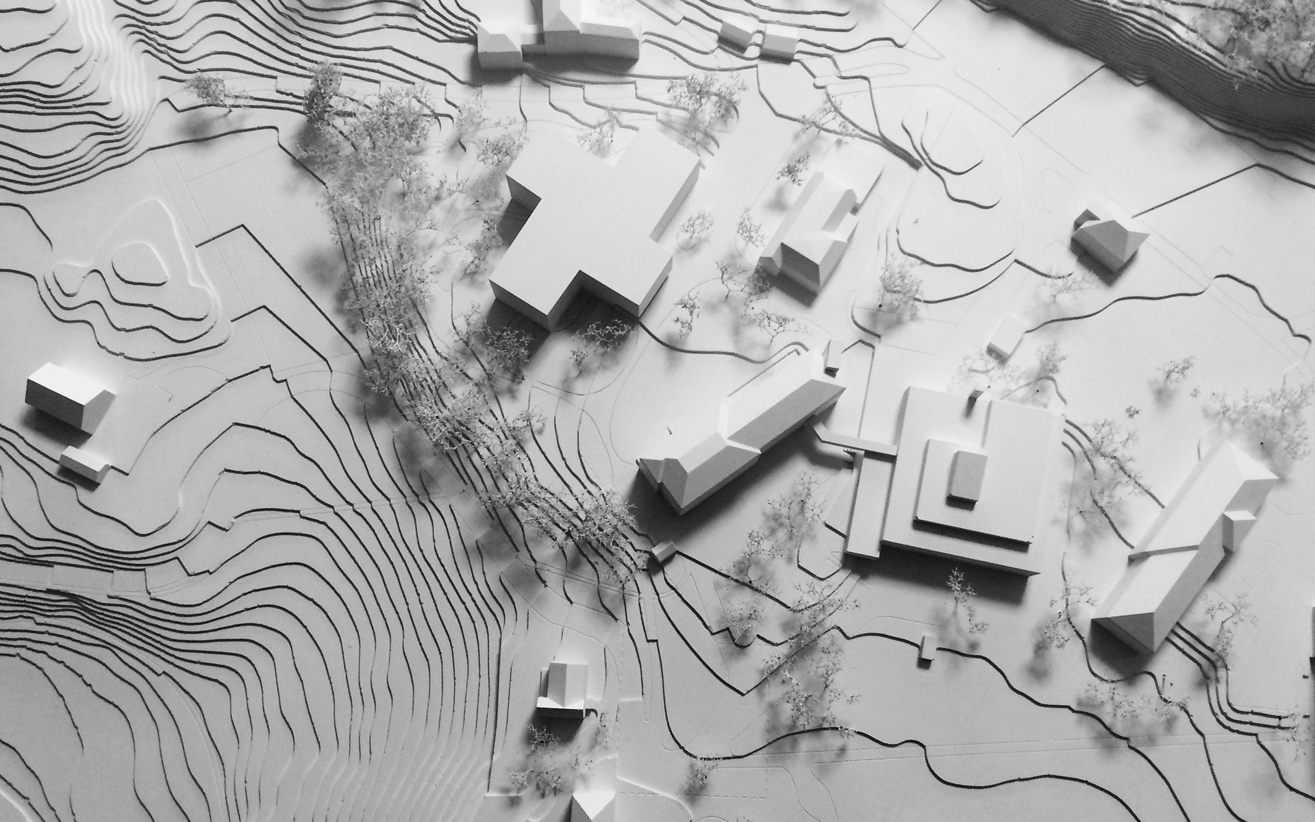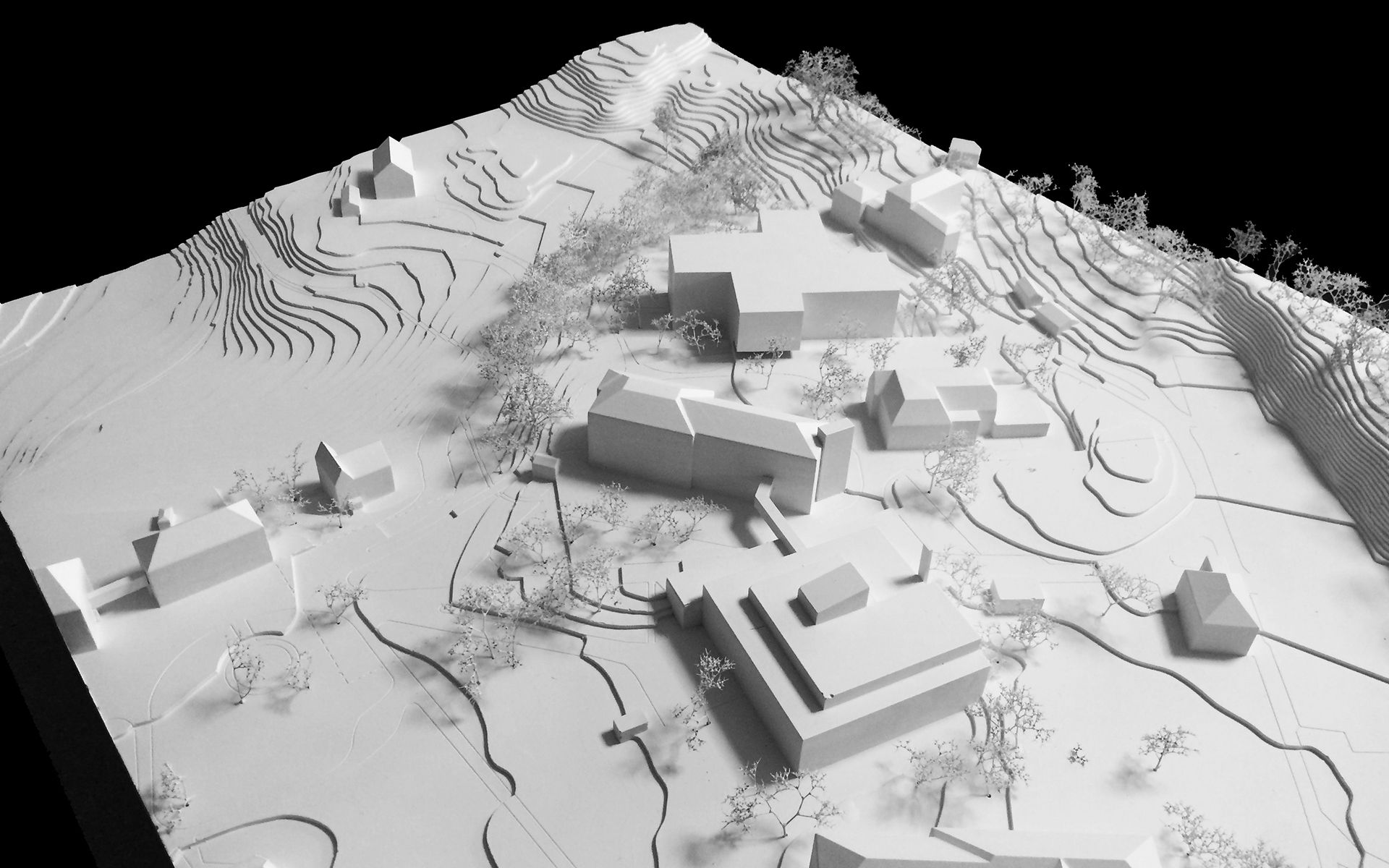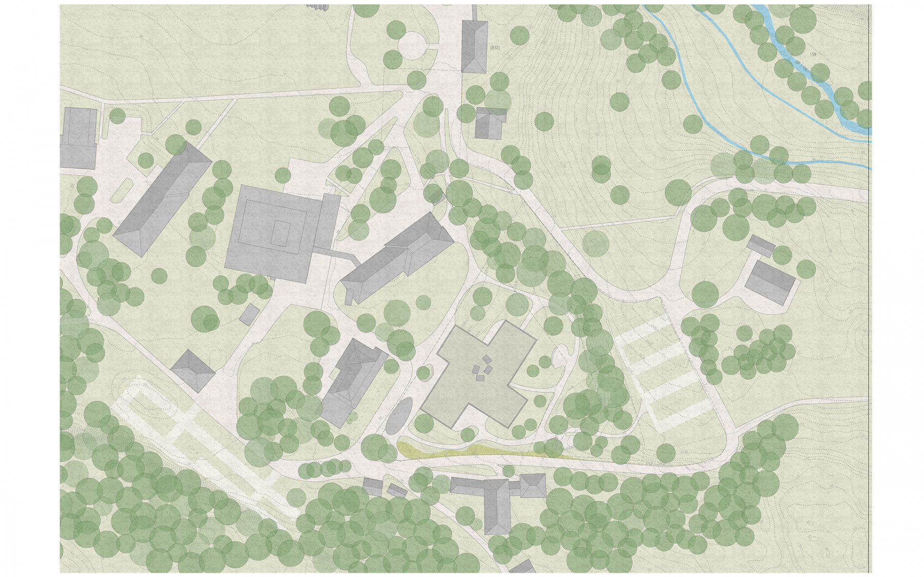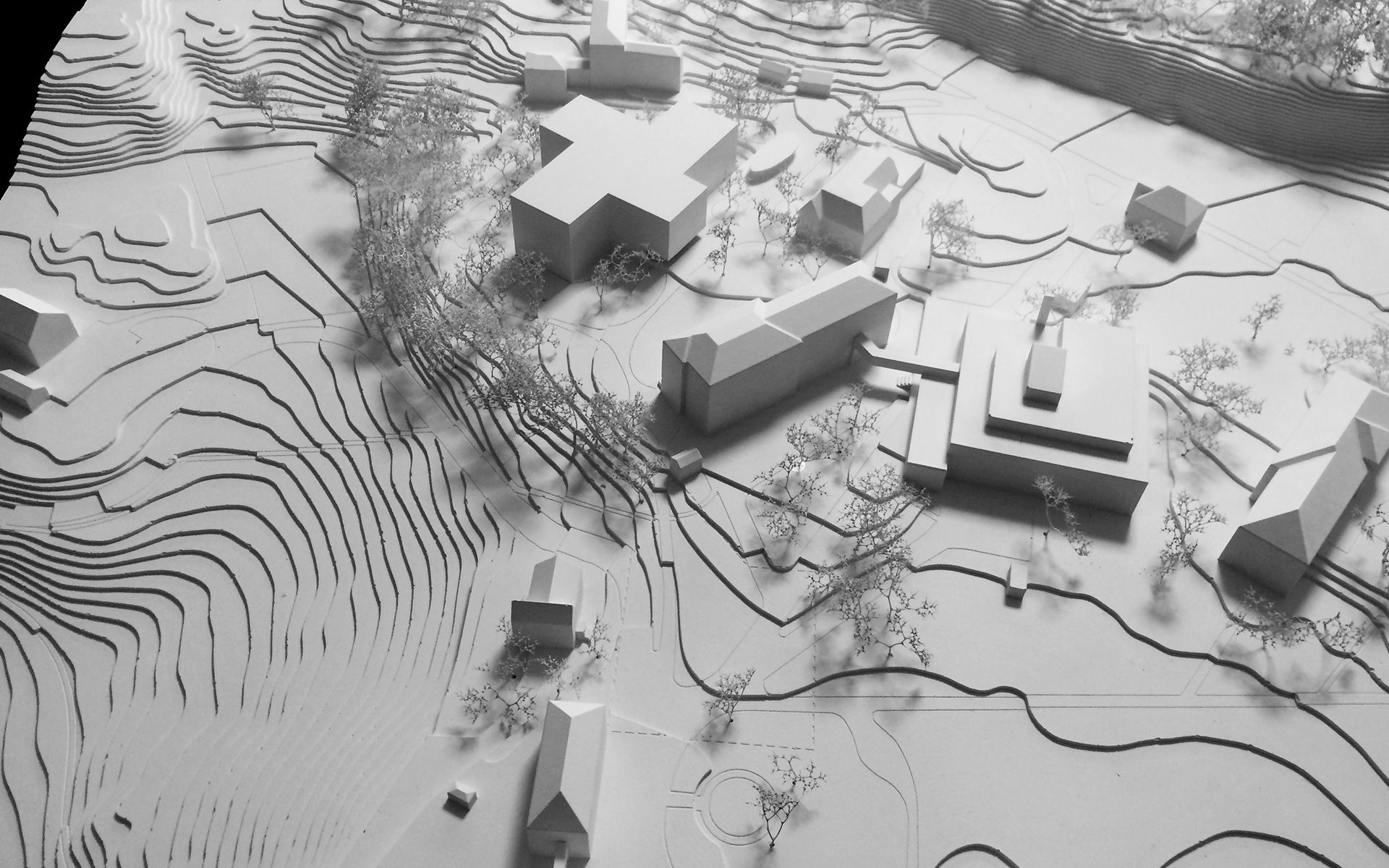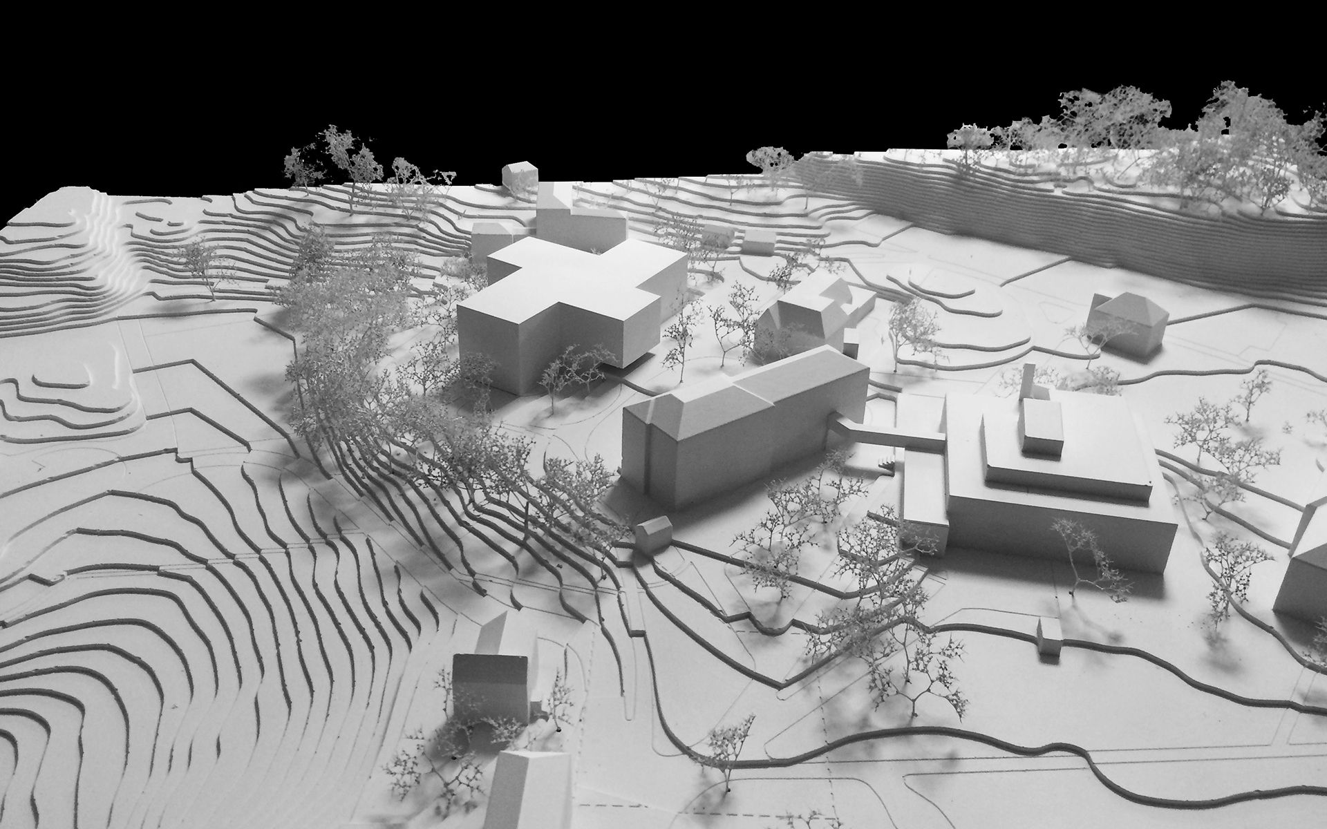 La nouvelle école est implantée en bordure du parc de l’hôpital, à la rupture de pente entre le plateau de l’hôpital et le terrain en contrebas. Une grande place d’accueil sert d’espace de liaison et d’accueil aux cheminements des élèves avant leur entrée dans l’école, que ce soit depuis l’arrêt de bus au nord, depuis les parkings P1 et P2 ou depuis la route d’accès au site. Cette cour d’entrée fait également office de préau. Le volume proposé est volontairement articulé et découpé, créant des espaces extérieurs différenciés permettant de réduire l’échelle du bâtiment dans le contexte bâti. Les décrochements induits par la figure géométrique offrent de petits pans de façades vis à vis du bâti environnant, tandis que les branches déploient des longueurs de façade similaires aux constructions voisines. Le nouvel édifice est conçu sur une base cruciforme : d’un « cœur », le grand atrium contenant les circulations verticales où tout le monde converge, on atteint les « branches » où sont disposés tous les locaux du programme, créant ainsi des sous-unités de plus petite taille. Le projet se développe sur un rez supérieur accueillant le pôle administratif et le pôle documentation (médiathèque) et un rez inférieur accueillant le pôle restauration en contact avec le jardin. Les 4 niveaux supérieurs sont similaires : ils accueillent les salles de classes et les salles spéciales de simulation.