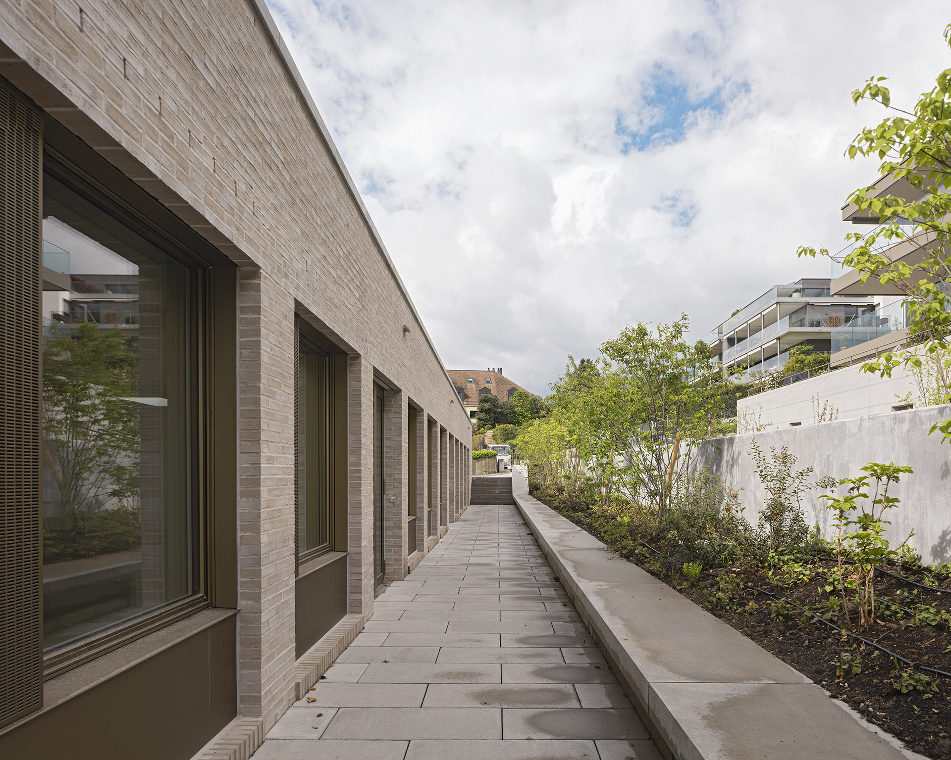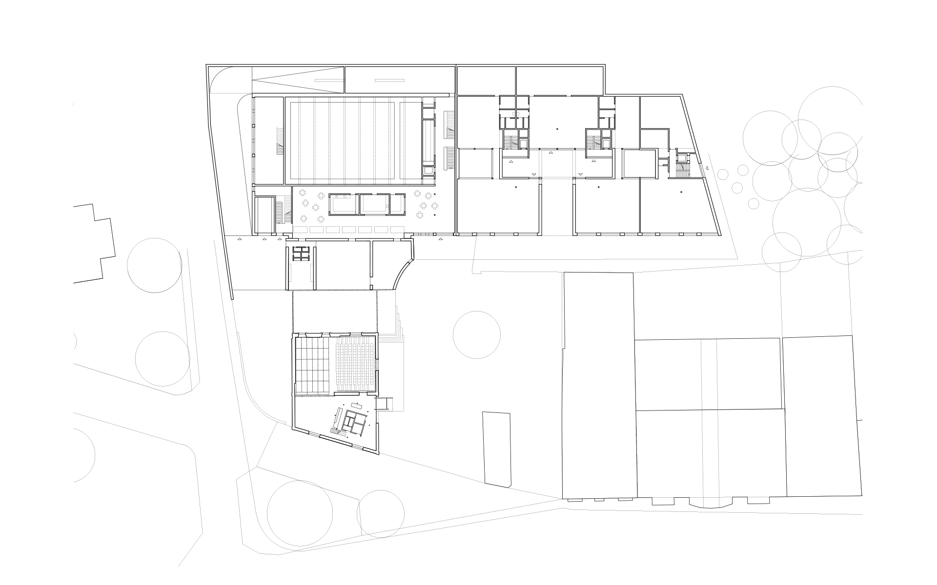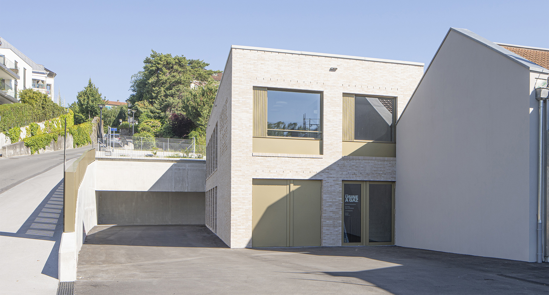 Le plan de quartier «Vy-Creuse-Usine à Gaz-Rive» détermine précisément les possibilités d’implantation volumétrique des constructions, un théâtre et ses annexes à l’ouest, des logements et des surfaces commerciales à l’est, à proximité du lac. La nouvelle place publique en légère pente conduit à l’entrée du nouveau théâtre. Le foyer de la nouvelle salle ainsi que les loges, les dépôts, l’administration et la salle de répétition se distribuent dans l’interstice entre les bâtiments du théâtre existant et la nouvelle salle, permettant de relier les locaux actuels au futur complexe. La salle du théâtre est orthogonale, simple et fonctionnelle. Un accès pour les livraisons et les professionnels du théâtre sont situés à l’ouest du bâtiment, en liaison avec la rue de la Vy-Creuse. Les logements pour artistes et des surfaces de bureaux prennent place au-dessus du théâtre et sont accessibles par une rue de desserte. Dans la partie est, le rez est dévolu à des surfaces commerciales.