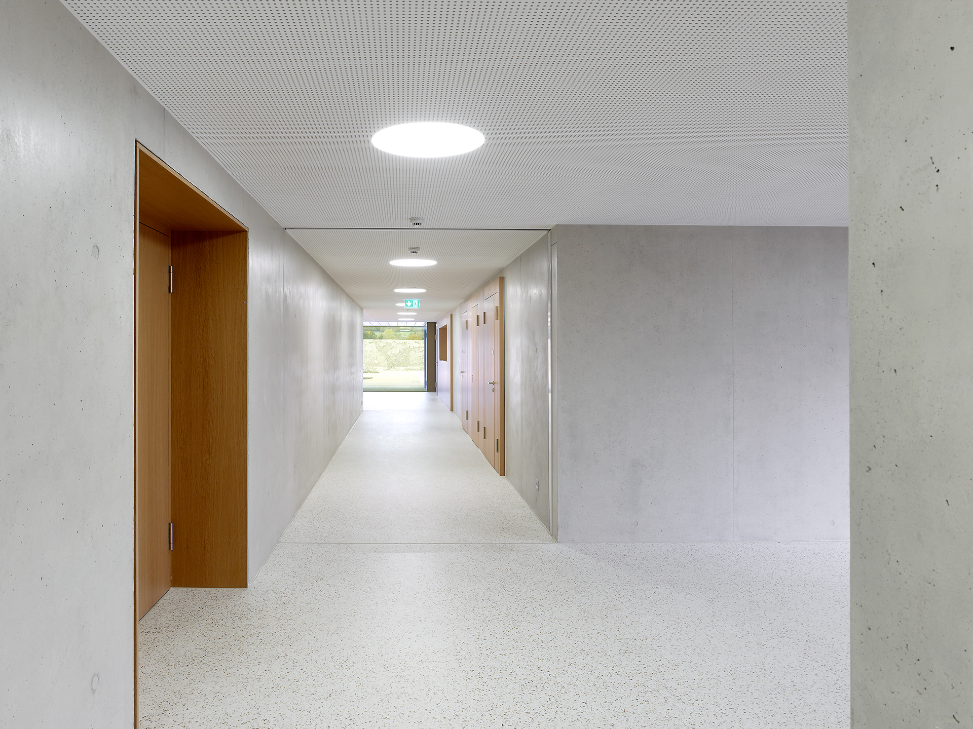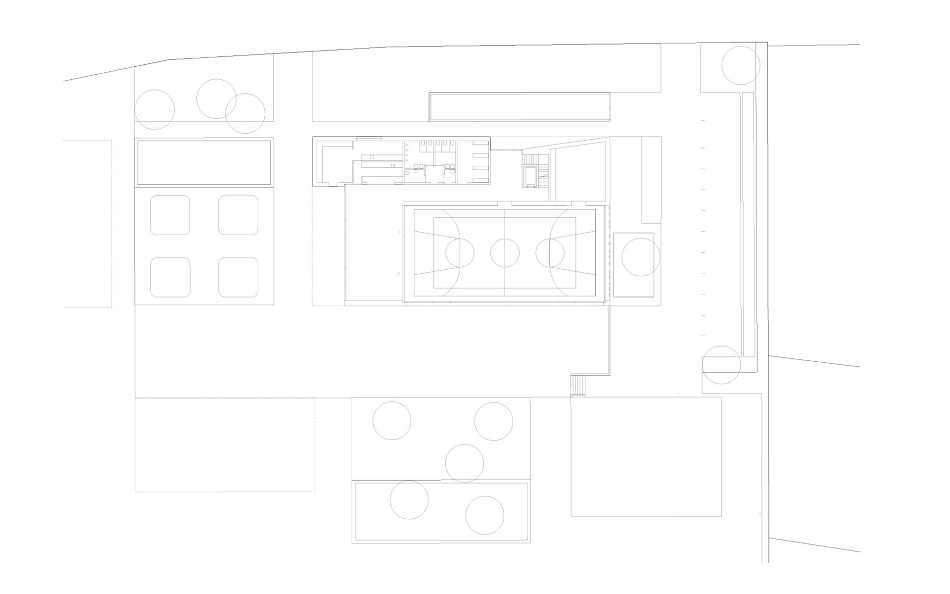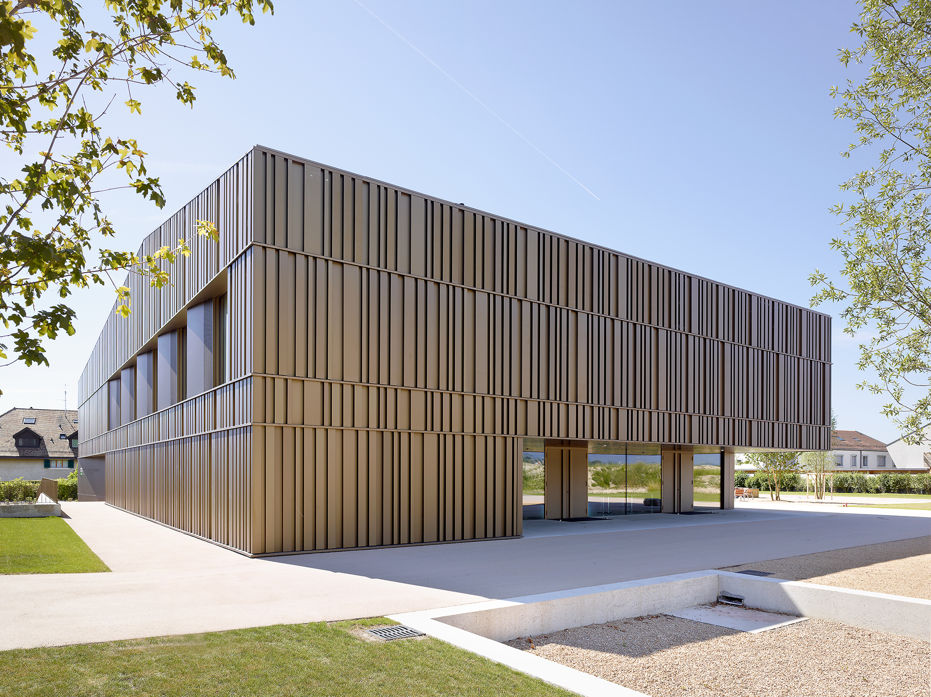 Le site accueillant un bâtiment communal et une crèche est caractérisé par la présence d’un abri enterré de protection civile. D’autres constructions pourraient à l’avenir compléter ces deux équipements publics regroupés autour d’une nouvelle centralité villageoise. L’implantation en quinconce de ces différents bâtiments crée des espaces extérieurs de formes et de caractères variés qui coulissent les uns par rapport aux autres. Le bâtiment communal s’implante sur une partie de l’abri de protection civile existant. Le plan du bâtiment communal est réalisé de manière à ne pas charger la dalle de l’abri. Au rez-de-chaussée, le foyer se prolonge par un large couvert donnant sur la place du village et ouvert sur le Jura, tandis que la salle polyvalente s’ouvre sur une place orientée au sud. Un accès aux bureaux de l’administration communale situés à l’étage est possible par le nord.