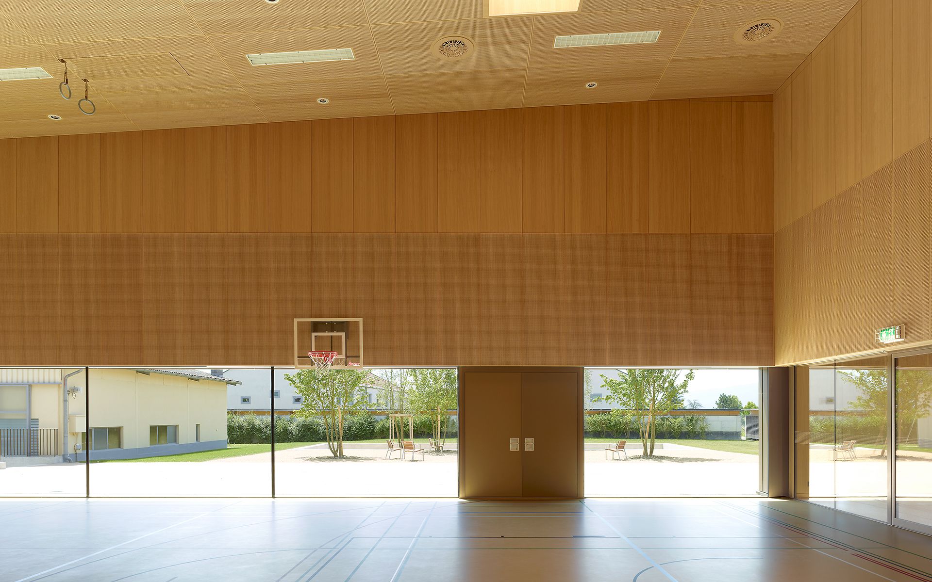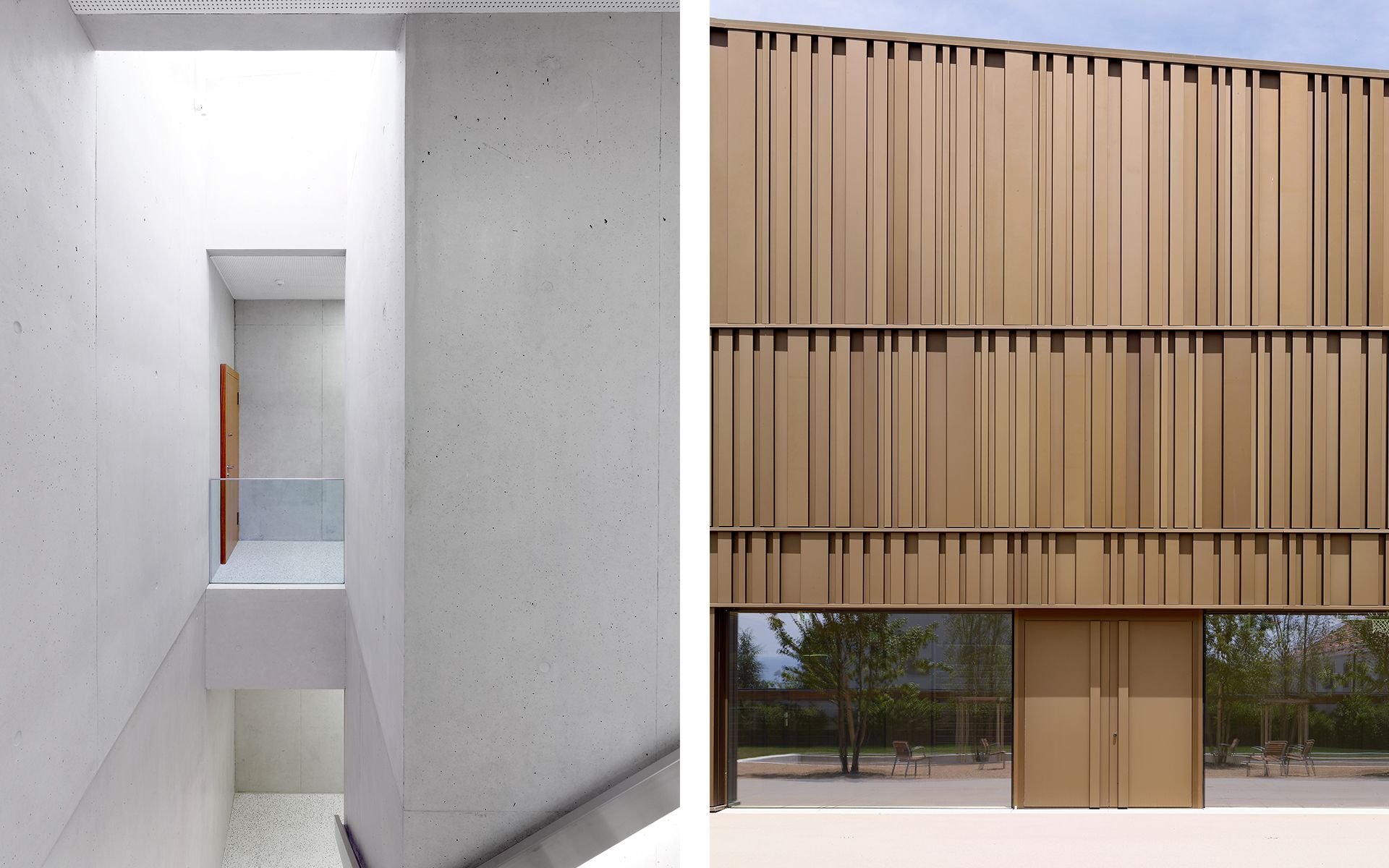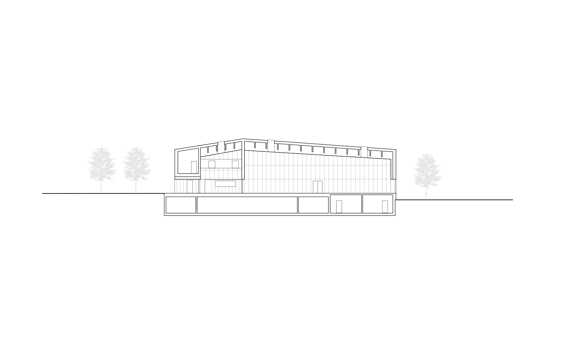 Le site accueillant un bâtiment communal et une crèche est caractérisé par la présence d’un abri enterré de protection civile. D’autres constructions pourraient à l’avenir compléter ces deux équipements publics regroupés autour d’une nouvelle centralité villageoise. L’implantation en quinconce de ces différents bâtiments crée des espaces extérieurs de formes et de caractères variés qui coulissent les uns par rapport aux autres. Le bâtiment communal s’implante sur une partie de l’abri de protection civile existant. Le plan du bâtiment communal est réalisé de manière à ne pas charger la dalle de l’abri. Au rez-de-chaussée, le foyer se prolonge par un large couvert donnant sur la place du village et ouvert sur le Jura, tandis que la salle polyvalente s’ouvre sur une place orientée au sud. Un accès aux bureaux de l’administration communale situés à l’étage est possible par le nord.