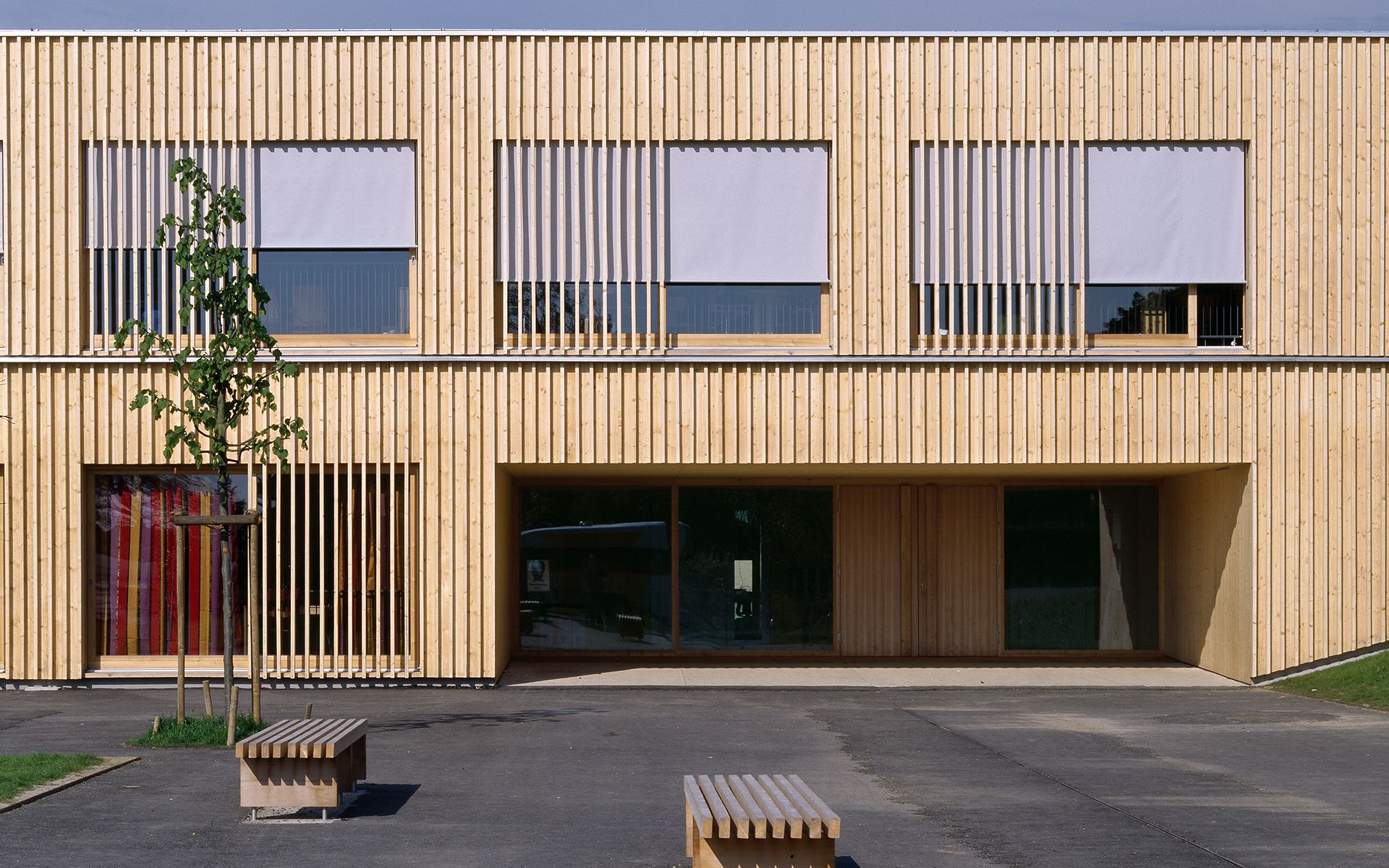 La réalisation de cette école en bois se veut simple et modeste, à la manière des granges et des constructions agricoles environnantes. Les couvres-joints fixés entre les lames en bois du bardage de façade créent un jeu d’ombre et de lumière qui donne une texture particulière et une épaisseur à la façade, se transformant en claires-voie devant les baies vitrées des salles de classe.