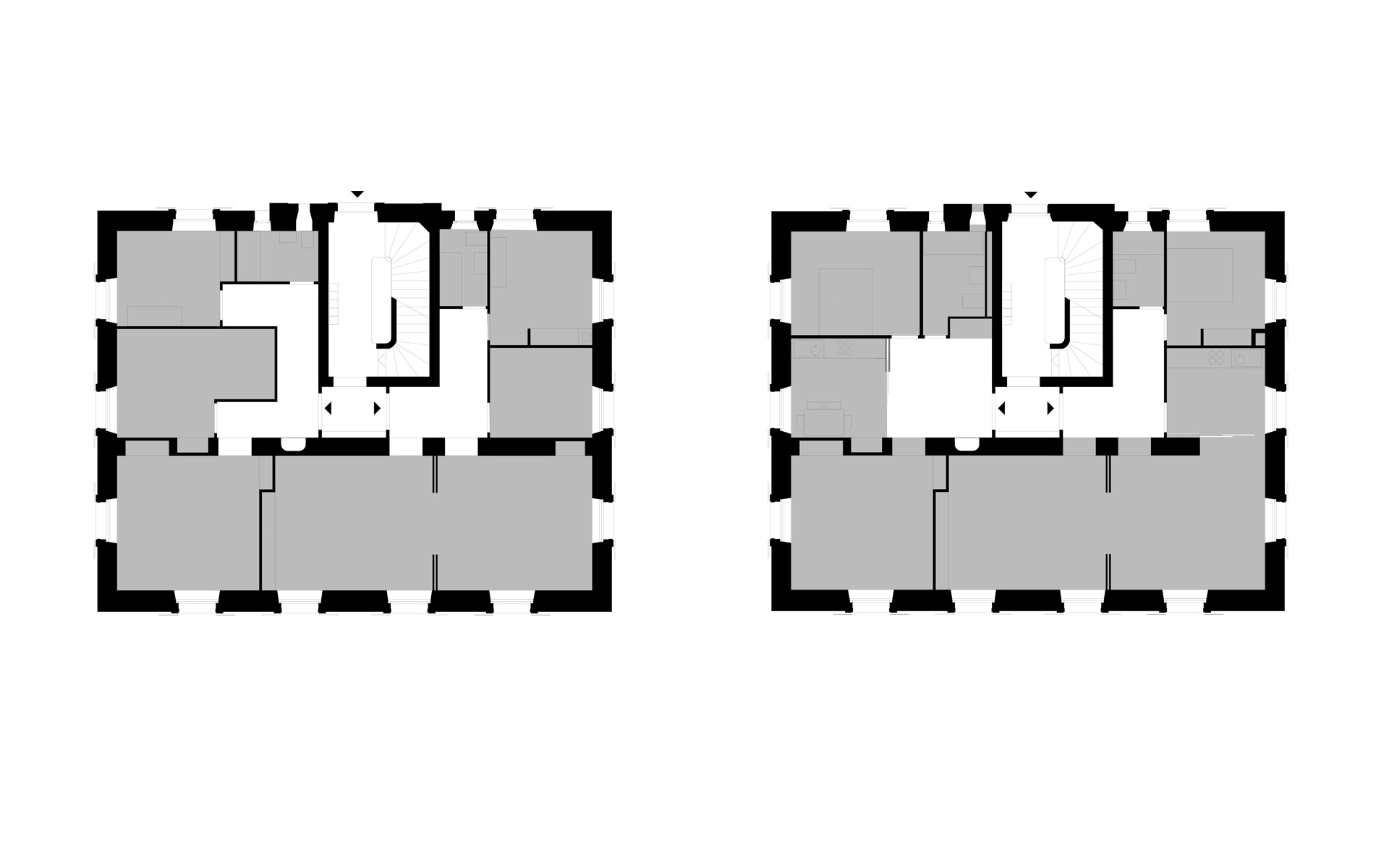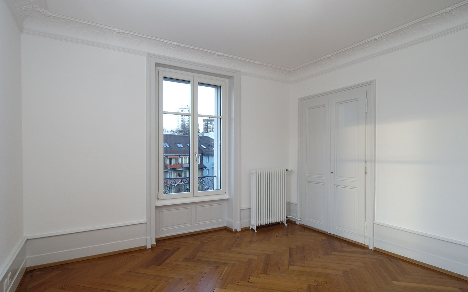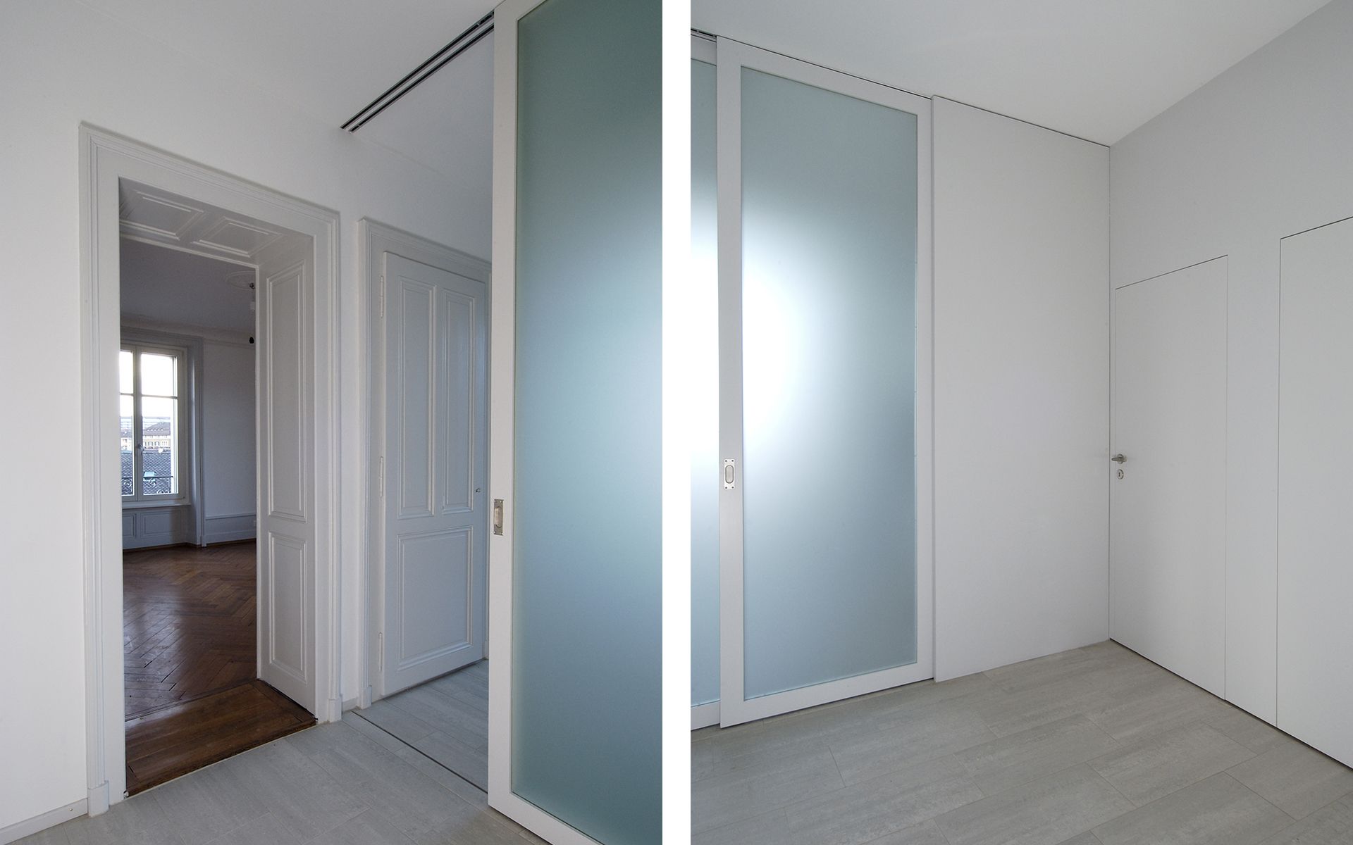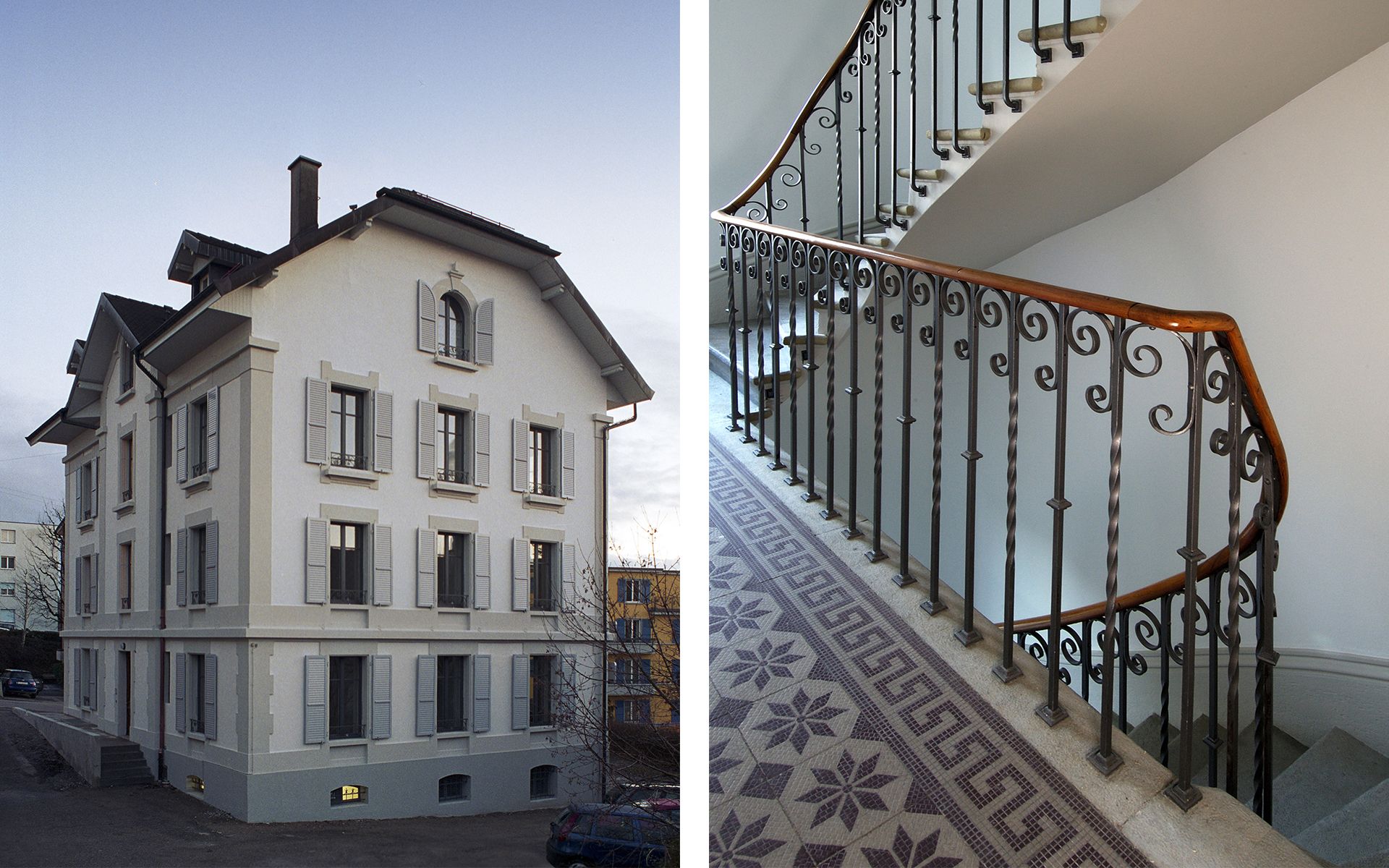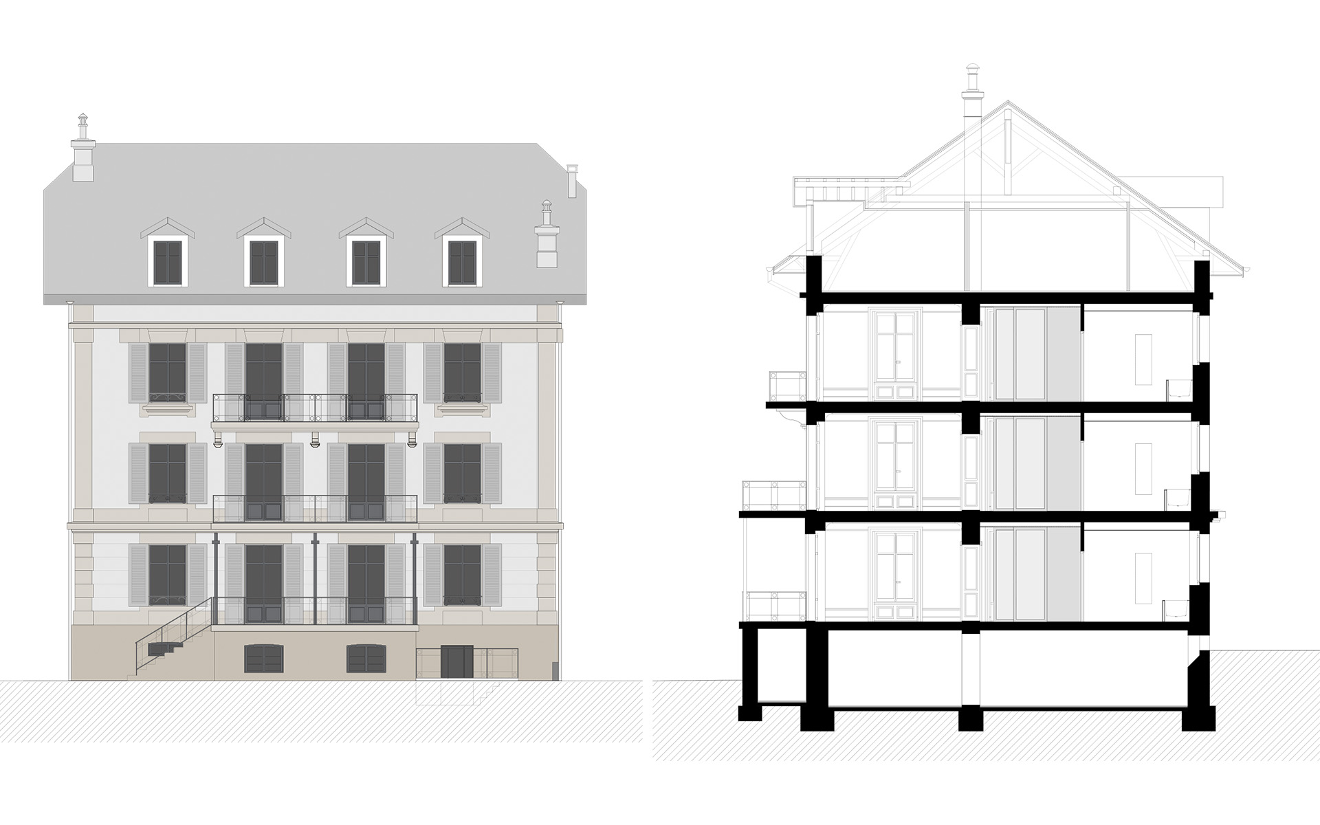 Cet immeuble construit en 1900 a fait l’objet de lourdes transformations de l’enveloppe extérieure et du sous-sol, de la cage d’escalier, ainsi que des appartements de l’aile ouest. Outre la rénovation des appartements, ces derniers souffraient également d’une distribution malaisée des différentes pièces: le séjour était coupé de la cuisine par une chambre biscornue, la surface et la longueur du couloir trop grande, le dégagement de l’entrée trop petit. La transformation visait donc à changer radicalement cette disposition.
