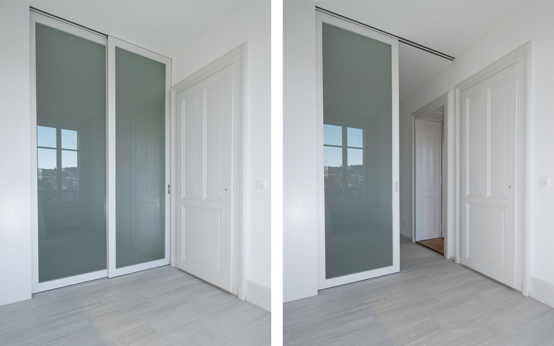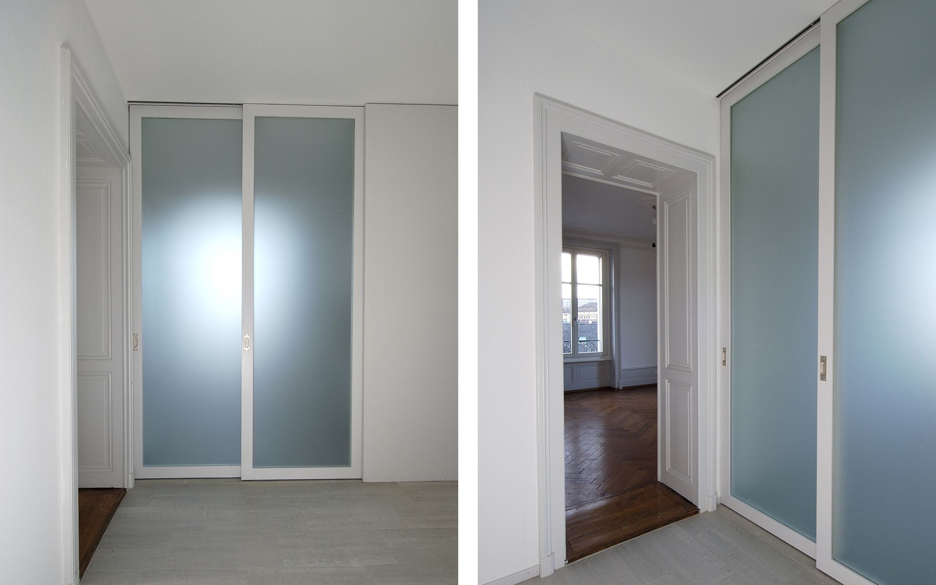 Le projet modifie l’emplacement de la cuisine et de la chambre, en supprimant le couloir sinueux existant. Un hall central distribue toutes les pièces du logement. Dans le prolongement de la cuisine, il offre à celle-ci un dégagement supplémentaire, par l’ouverture de portes vitrées coulissantes. Ces dernières permettent à la lumière de pénétrer jusqu’au coeur de l’appartement, sitôt la porte d’entrée franchie. La paroi de séparation entre la chambre, la salle de bain et le hall est traitée de manière contemporaine comme une grande surface lisse, en bois peint, par contraste avec les boiseries et les moulures existantes.