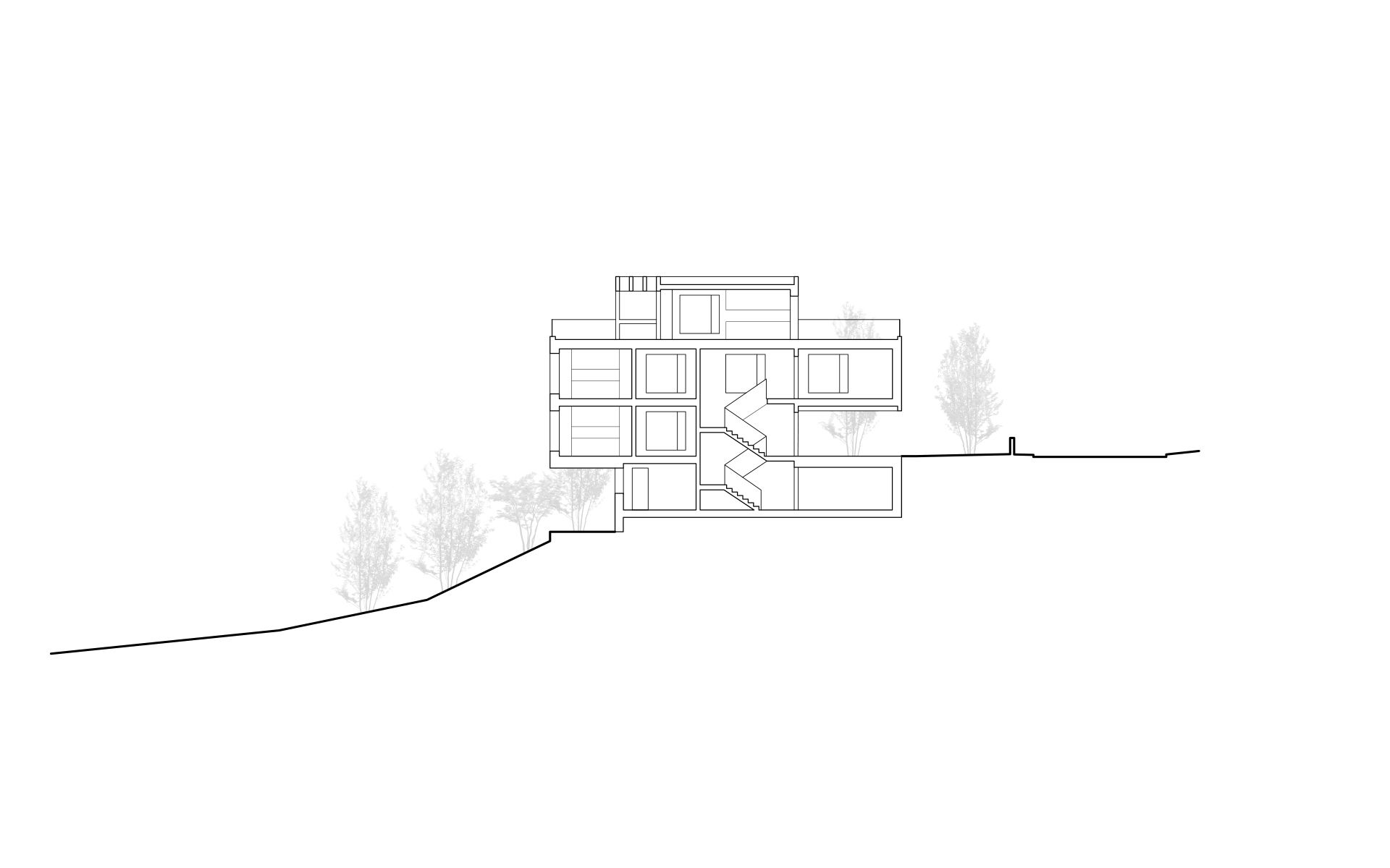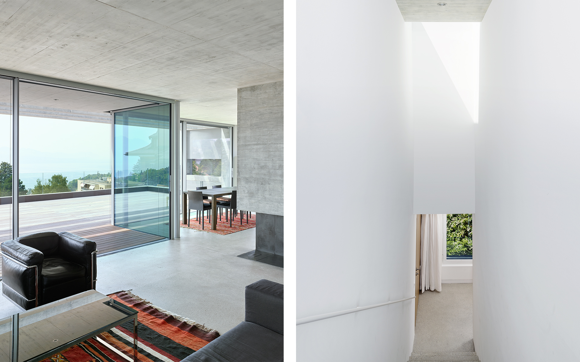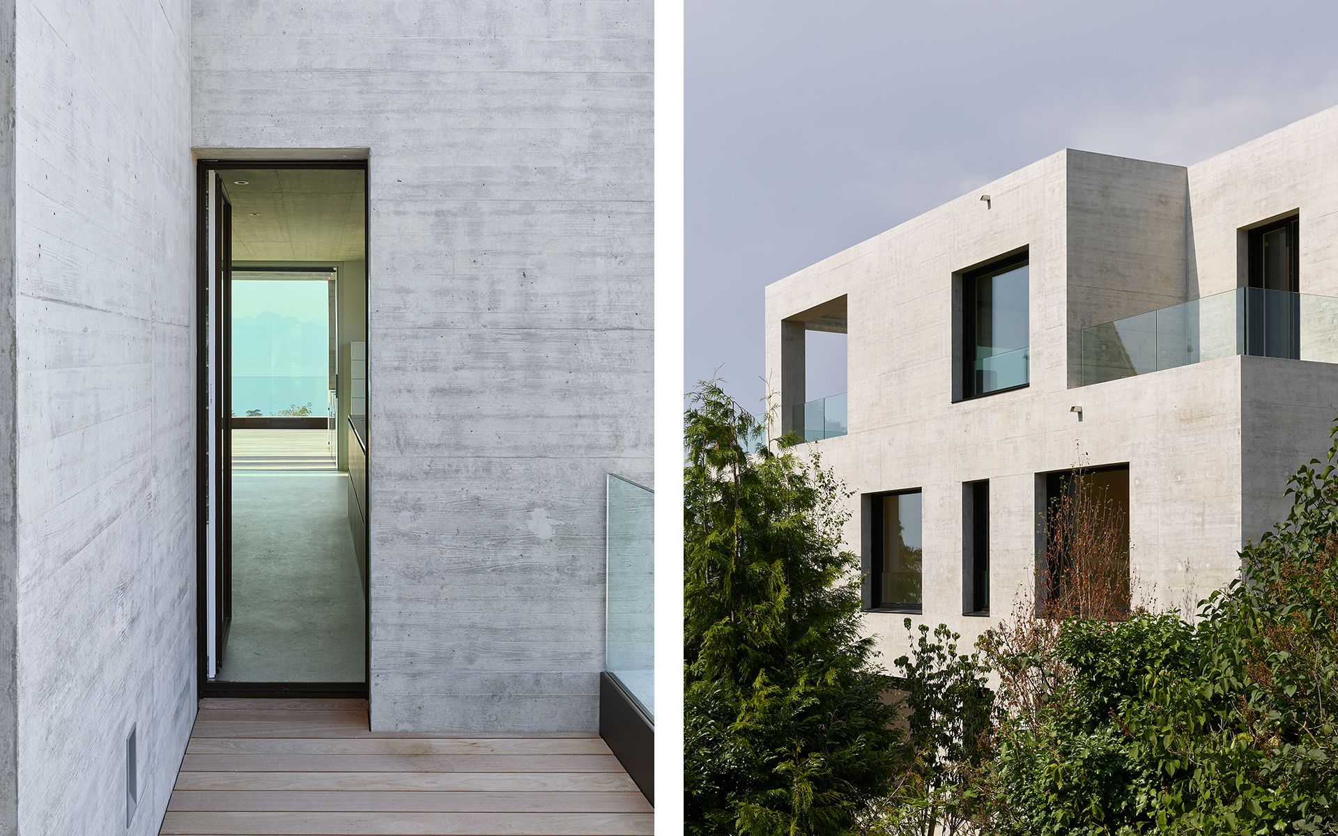 Inséré dans un tissu urbain hétéroclite, le nouveau bâtiment en béton brut apparent se présente comme un monolithe minéral surgissant de la végétation, dans lequel sont creusées des terrasses, des loggias et des couverts. La parcelle en forte déclivité s’ouvre en direction du sud et offre de beaux dégagements vers le lac et les montagnes. Une cage d’escalier éclairée en façade distribue trois appartements de surfaces similaires: 2 appartements sur un niveau et 1 appartement d’attique en duplex. Les appartements s’organisent de manière fluide en réduisant les espaces de circulation au profit des espaces de vie. La cuisine et le séjour s’articulent autour d’une grande loggia ou d’une terrasse ouverte au sud et à la vue. Chaque appartement bénéficie de trois ou quatre orientations. Les murs extérieurs en béton sont porteurs. Les fenêtres sont conçues comme de grandes ouvertures sur le paysage et le contexte bâti environnant. Elles se décomposent en deux parties: un volet plein pour la ventilation et une partie vitrée pour la vue et la lumière. Le jardin paysagé est constitué de terrasses qui s’étagent dans la pente, parfois minérales, parfois végétales, créant des ambiances spécifiques qui en agrémentent l’usage.