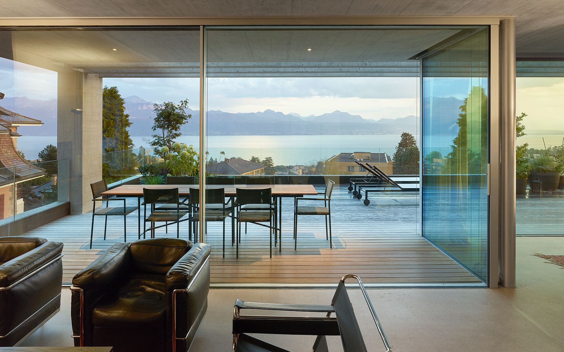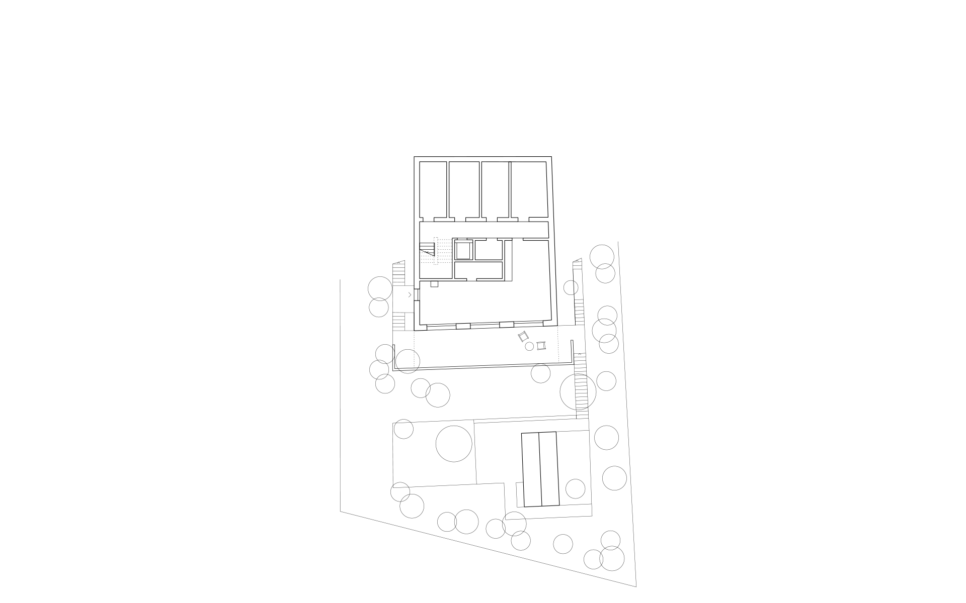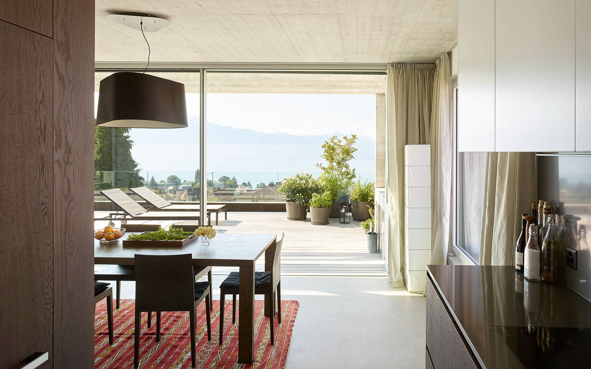 Inséré dans un tissu urbain hétéroclite, le nouveau bâtiment en béton brut apparent se présente comme un monolithe minéral surgissant de la végétation, dans lequel sont creusées des terrasses, des loggias et des couverts. La parcelle en forte déclivité s’ouvre en direction du sud et offre de beaux dégagements vers le lac et les montagnes. Une cage d’escalier éclairée en façade distribue trois appartements de surfaces similaires: 2 appartements sur un niveau et 1 appartement d’attique en duplex. Les appartements s’organisent de manière fluide en réduisant les espaces de circulation au profit des espaces de vie. La cuisine et le séjour s’articulent autour d’une grande loggia ou d’une terrasse ouverte au sud et à la vue. Chaque appartement bénéficie de trois ou quatre orientations. Les murs extérieurs en béton sont porteurs. Les fenêtres sont conçues comme de grandes ouvertures sur le paysage et le contexte bâti environnant. Elles se décomposent en deux parties: un volet plein pour la ventilation et une partie vitrée pour la vue et la lumière. Le jardin paysagé est constitué de terrasses qui s’étagent dans la pente, parfois minérales, parfois végétales, créant des ambiances spécifiques qui en agrémentent l’usage.