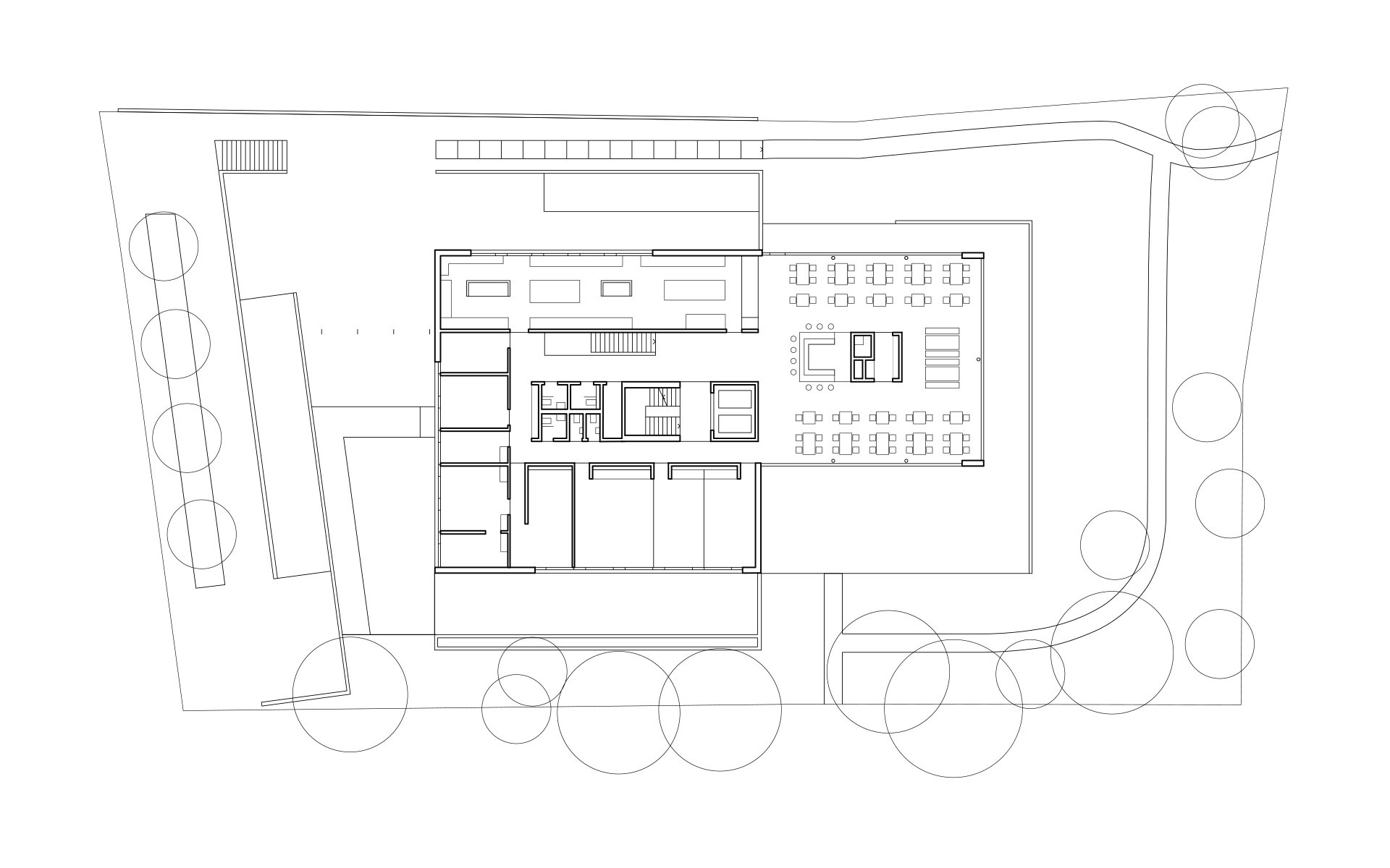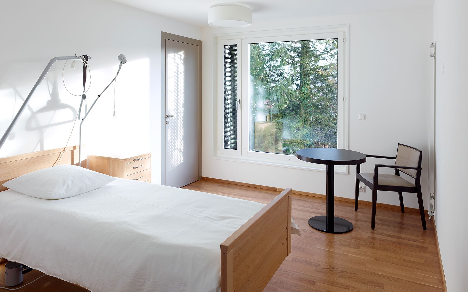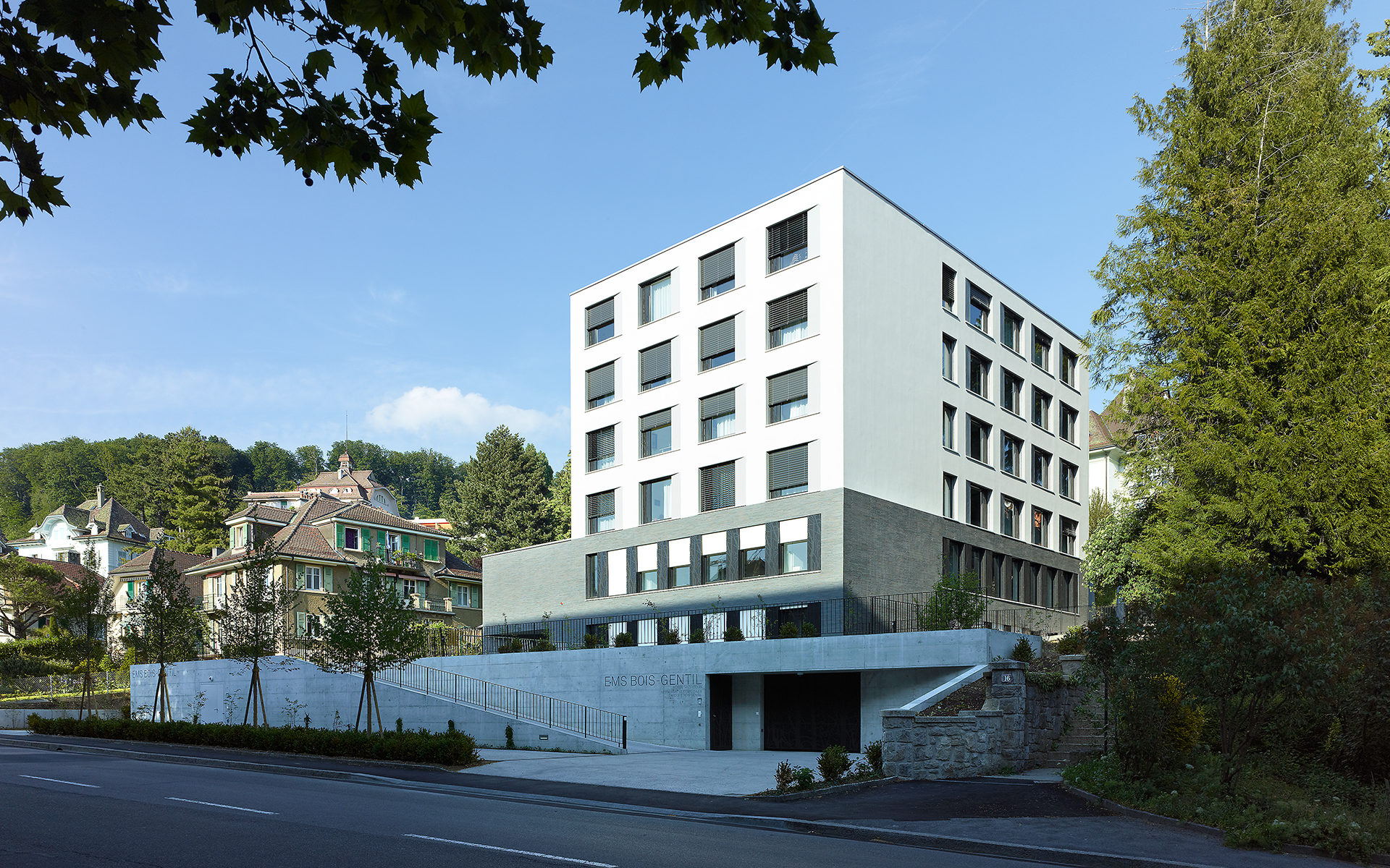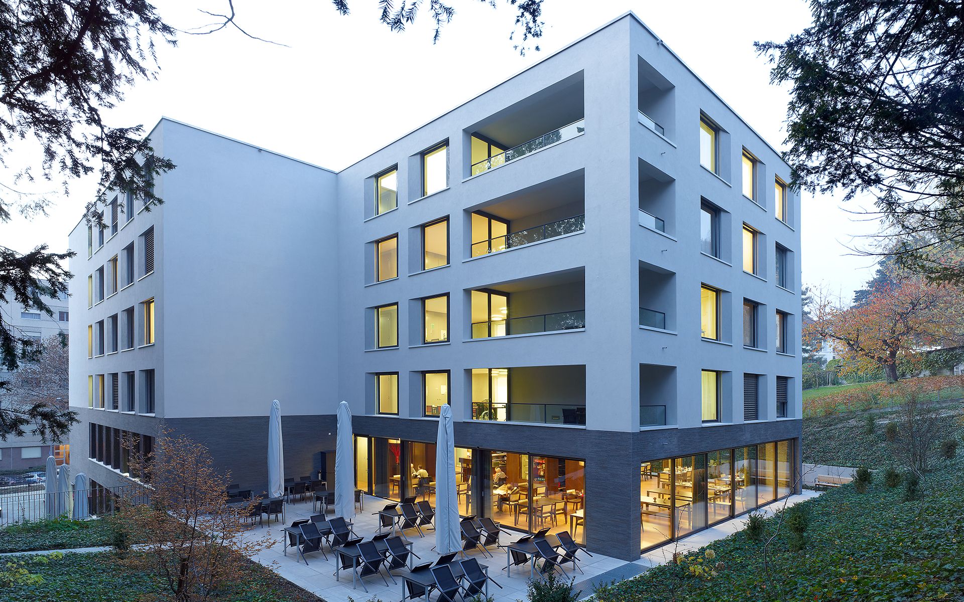 Le bâtiment s’articule en deux volumes décalés en plan, lui conférant une échelle en rapport avec les bâtiments voisins, tout en permettant à ceux-ci de conserver un bon dégagement sur le paysage environnant. Un socle pris dans la pente contient toutes les activités communes de l’EMS, bureaux, salles communes, cuisine, restaurant. Dans le prolongement du restaurant, une terrasse s’ouvre vers le sud, en relation avec le jardin. L`arborisation caractérisant cet ancien parc est conservée.