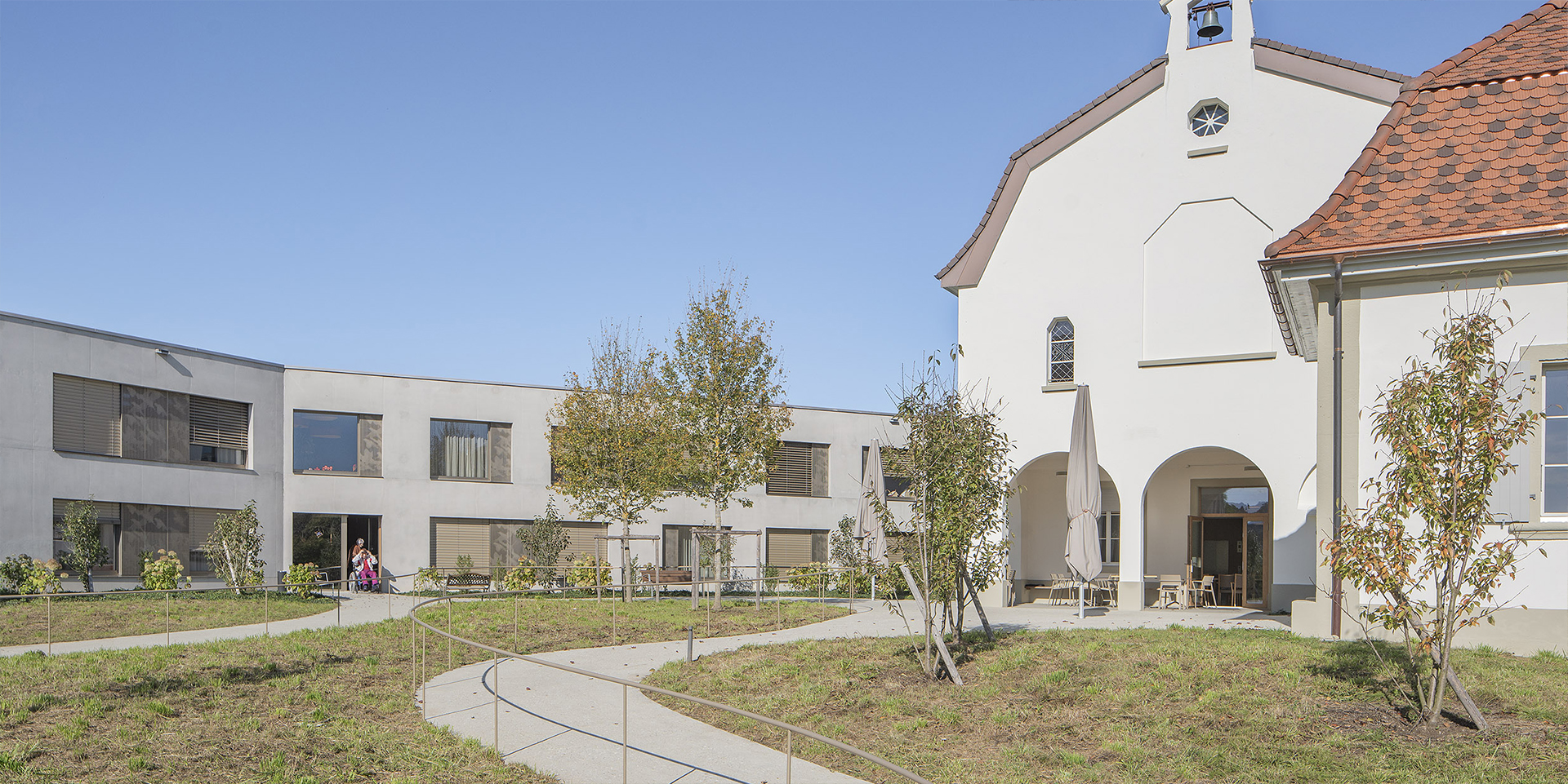Les façades à pans brisés permettent d’ouvrir toutes les chambres à la vue, en évitant les vis-à-vis gênants avec les constructions existantes proches. La mémoire du jardin à la française et son ancien belvédère sont rétablis et mis en relation avec un nouveau jardin paysager, dont les courbes des chemins et des places se déploient de manière naturelle dans la pente du terrain pour favoriser la détente ou la promenade des résidents.