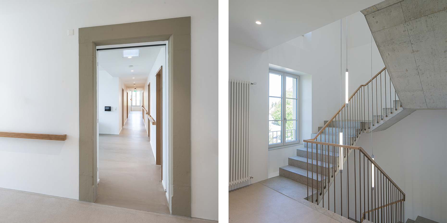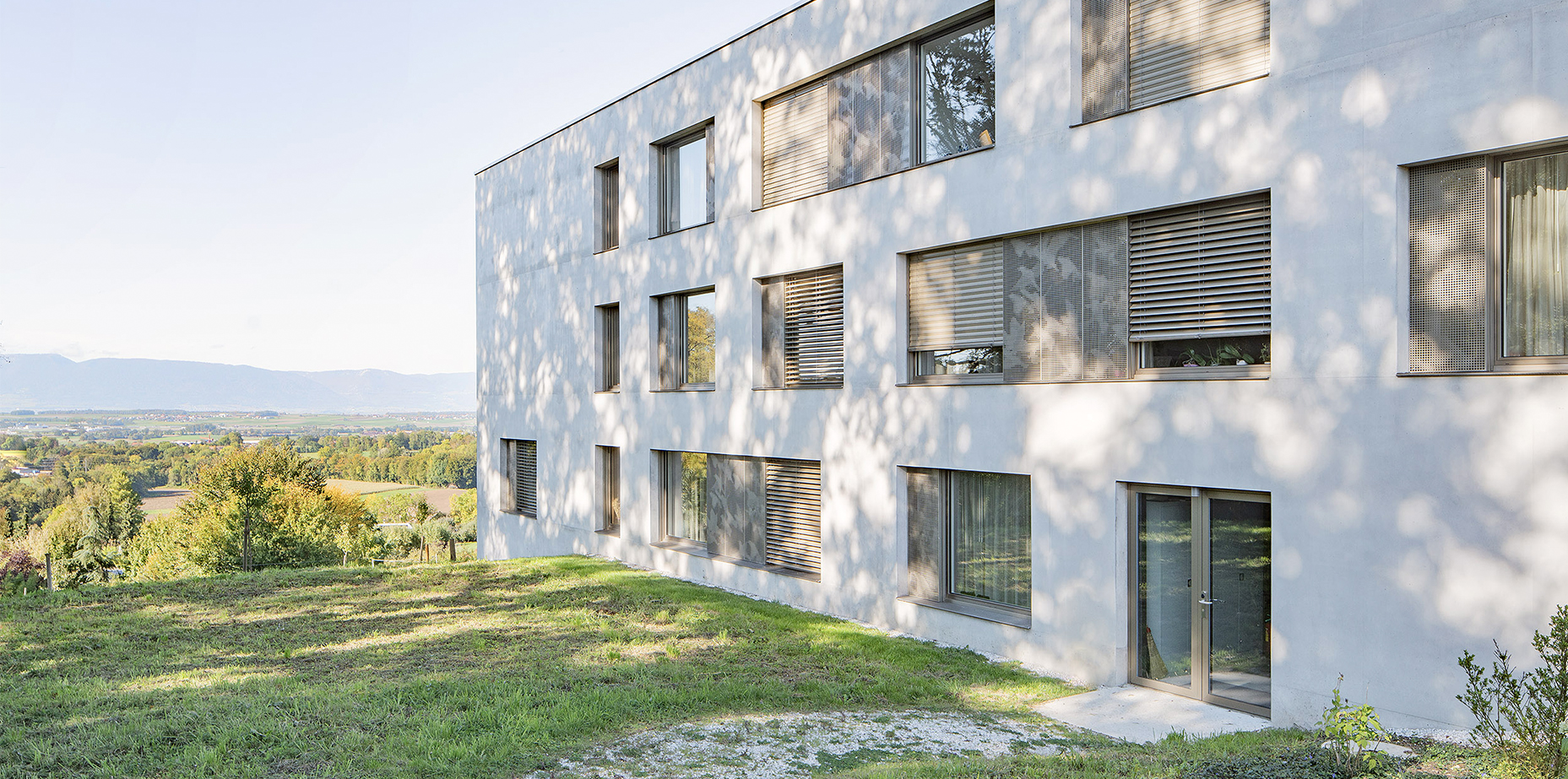 L’EMS des Fauvettes se situe sur une colline dominant la plaine de la Broye fribourgeoise et le Jura à l’ouest, les préalpes fribourgeoises et la plaine de la Sarine à l’est. Les bâtiments existants se développent en forme d’équerre autour d’un ancien jardin à la française ouvert sur le grand paysage au sud. Une grande cour permet d’accéder à l’entrée principale depuis la route conduisant au village de Montagny-la-Ville. Les lignes brisées du nouveau bâtiment se connectent à l’espace de liaison des bâtiments existants, un ancien orphelinat et une chapelle. Les bâtiments existants abritent toutes les fonctions communes. Les 60 chambres du programme sont organisées en 3 unités de vie regroupées autour d’un grand espace commun central.