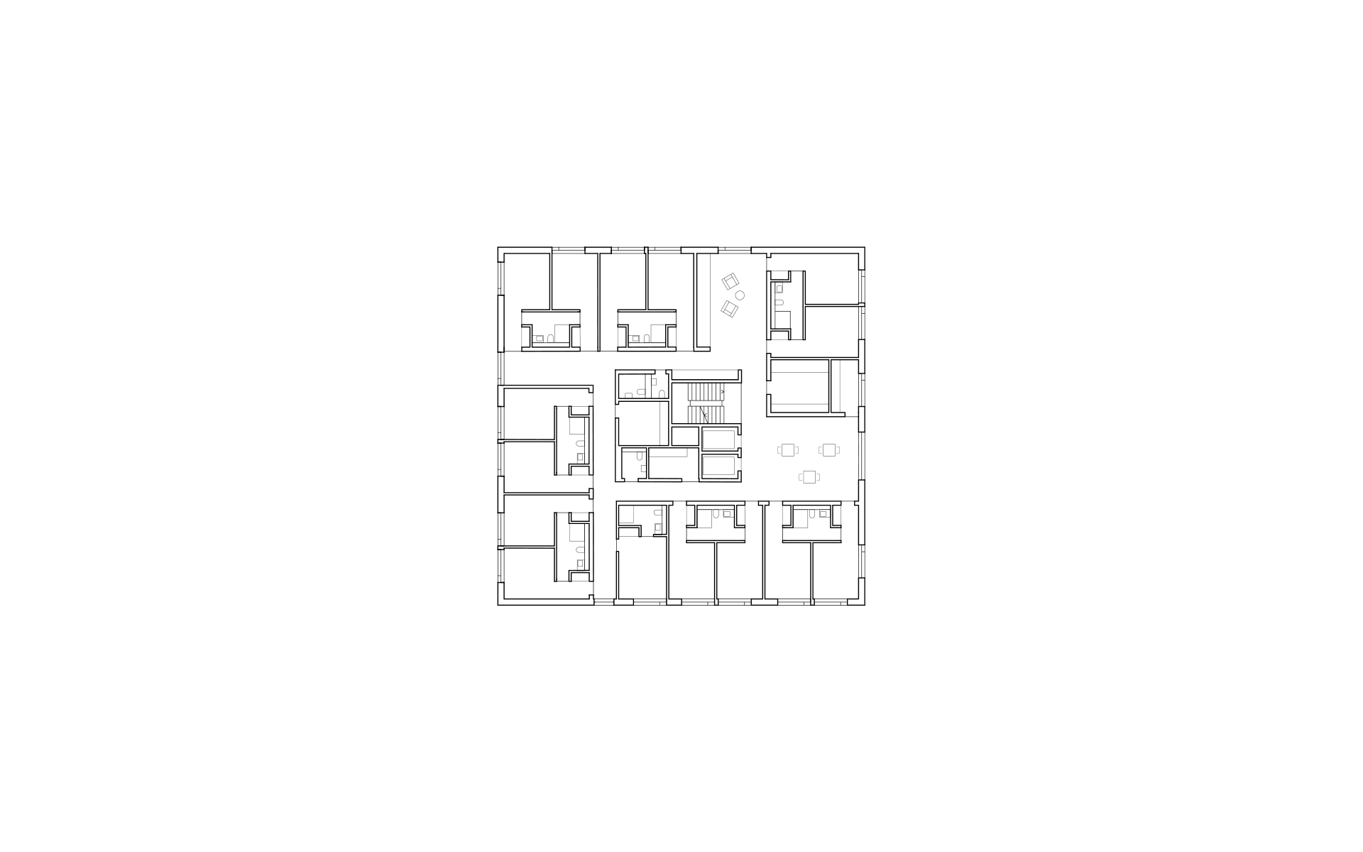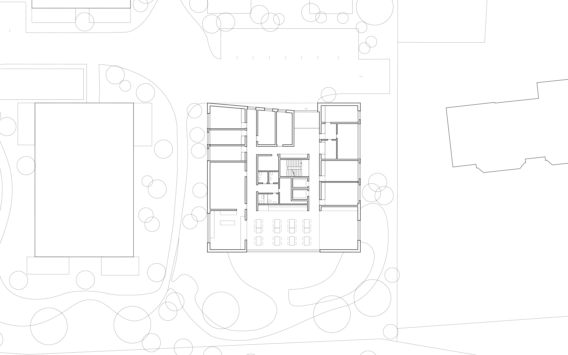 La construction de l’EMS Pré-Fleuri s’installe dans l’angle sud-ouest de la parcelle, à l’intérieur d’un plan d’aménagement comprenant 4 autres immeubles de logements. L’EMS comprend 53 lits répartis en 47 chambres individuelles et 3 chambres doubles, ainsi que les locaux d’accompagnement nécessaires au fonctionnement de la mission psychogératrique de l’institution. Les différents espaces s’organisent sur 1 niveau enterré et 5 niveaux hors sol, dont le dernier étage en attique. Le rez-de-chaussée comprend les espaces communs et administratifs de l'EMS. Le restaurant se prolonge à l’extérieur sur une terrasse. Au sous-sol se trouvent tous les locaux techniques et un parking enterré. A l’étage, le plan organise les chambres en façade, disposant au centre les locaux de service et les circulations. Ces dernières s’ouvrent en façade par l’intermédiaire de petits séjours ou d’espaces de dégagement, permettant une vue sur l’extérieur et un apport de lumière dans les espaces de circulation. Les zones communes sont disposées de manière à offrir aux résidents plusieurs espaces de dimensions et d’orientation diverses, avec des aménagements particulier pour chacun. L’étage de l’attique comprend 5 chambres et des espaces communs pour l’ensemble de l’institution.