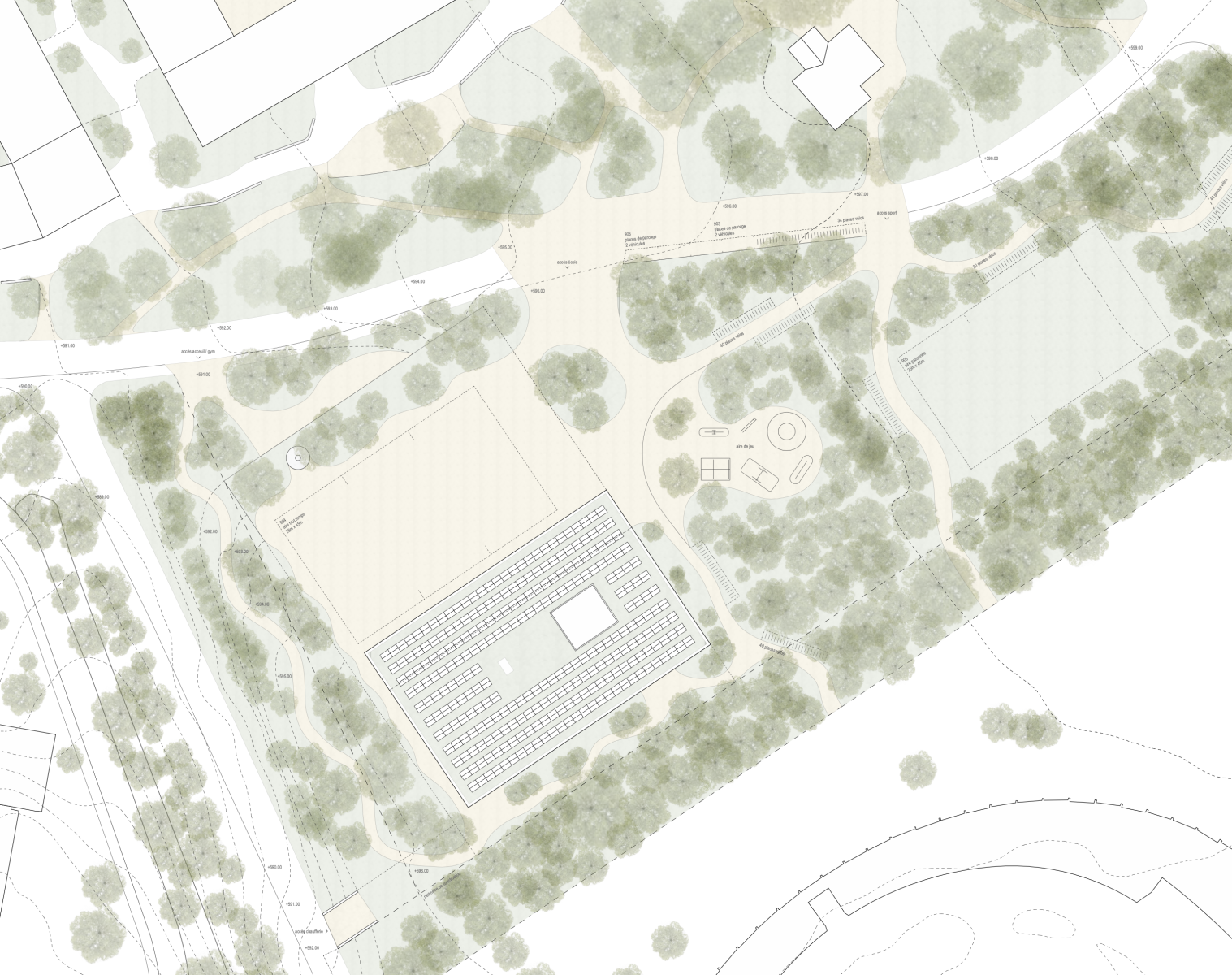 L’esplanade de l’école est accessible de plain-pied depuis le chemin du Vélodrome. Les écoliers et les utilisateurs accèdent à l’école par un vaste couvert ouvert sur le préau principal de l’école. Ce dernier offre de nombreux espaces aux potentiels multiples pour le quartier pendant et en dehors des horaires scolaires, qui servent autant comme préau scolaire que de lieu public ouvert à toutes et tous. On y trouve de vastes zones arborées qui offrent des ilôts d’ombre et de fraîcheur, favorisant la détente et la rencontre, tout en étant un gage de sécurité pour les enfants. Le dessin général de l’ensemble favorise la sécurité des enfants et s'inscrit dans la continuité urbaine des parcours qui relient le promontoire de l’école avec le parc du Vélodrome et le reste du plateau de la Pontaise.