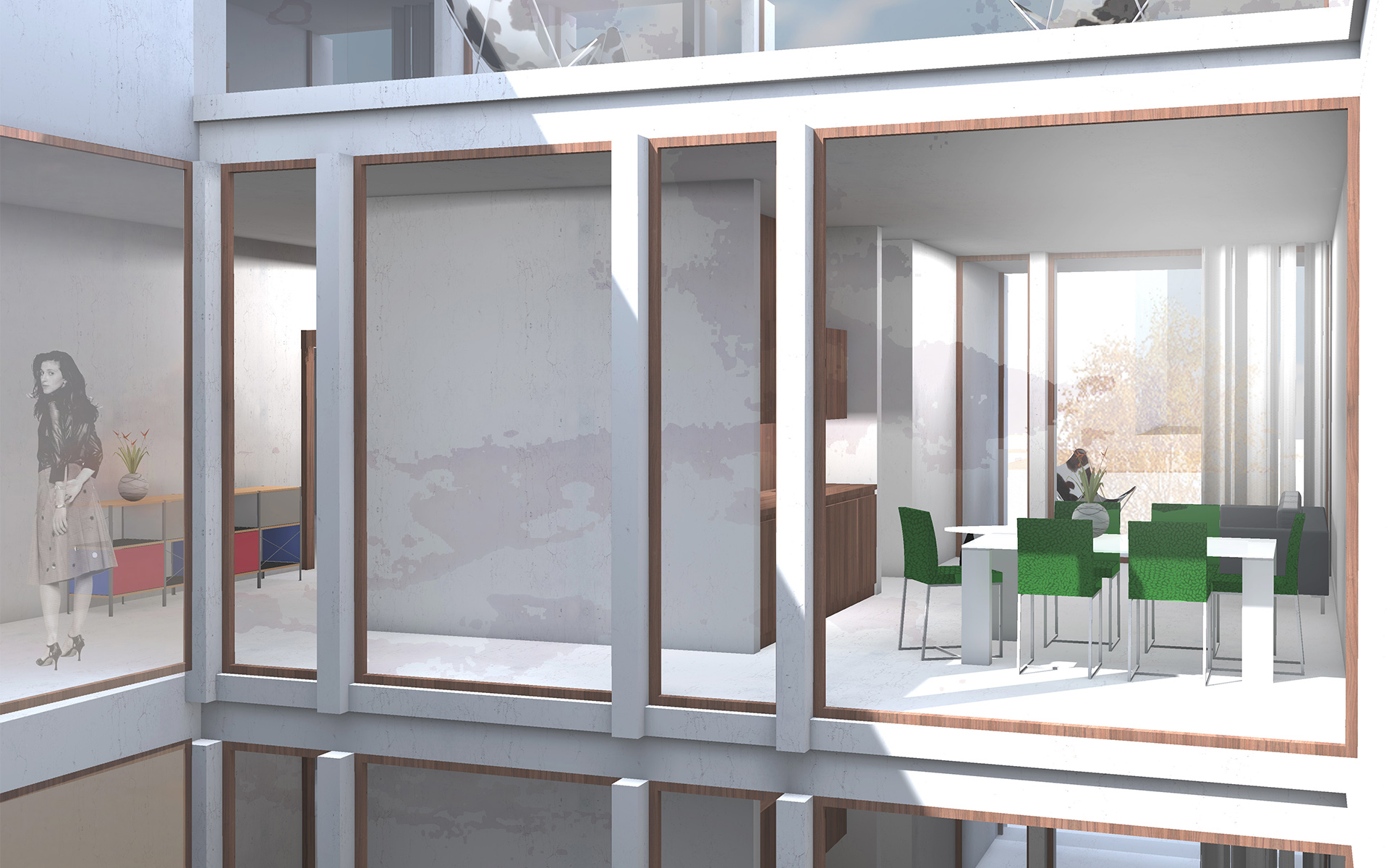 Le plan de quartier «Vy-Creuse-Usine à Gaz-Rive» détermine précisément les possibilités d’implantation volumétrique des constructions, un théâtre et ses annexes à l’ouest, des logements et des surfaces commerciales à l’est, à proximité du lac. La nouvelle place publique en légère pente conduit à l’entrée du nouveau théâtre. Le foyer de la nouvelle salle ainsi que les loges, les dépôts, l’administration et la salle de répétition se distribuent dans l’interstice entre les bâtiments du théâtre existant et la nouvelle salle, permettant de relier les locaux actuels au futur complexe. La salle du théâtre est orthogonale, simple et fonctionnelle. Un accès pour les livraisons et les professionnels du théâtre sont situés à l’ouest du bâtiment, en liaison avec la rue de la Vy-Creuse. Les logements pour artistes et des surfaces de bureaux prennent place au-dessus du théâtre et sont accessibles par une rue de desserte. Dans la partie est, le rez est dévolu à des surfaces commerciales.