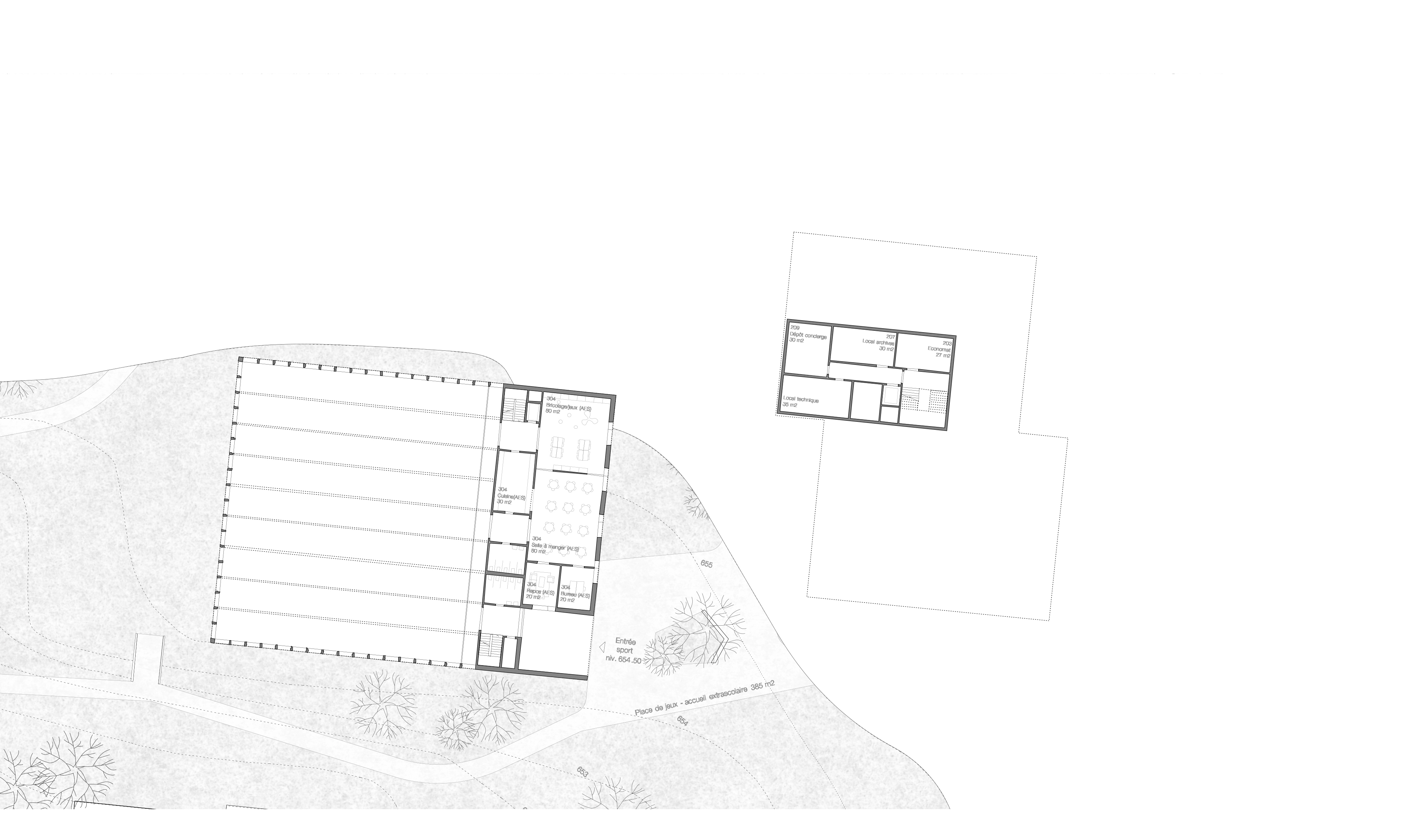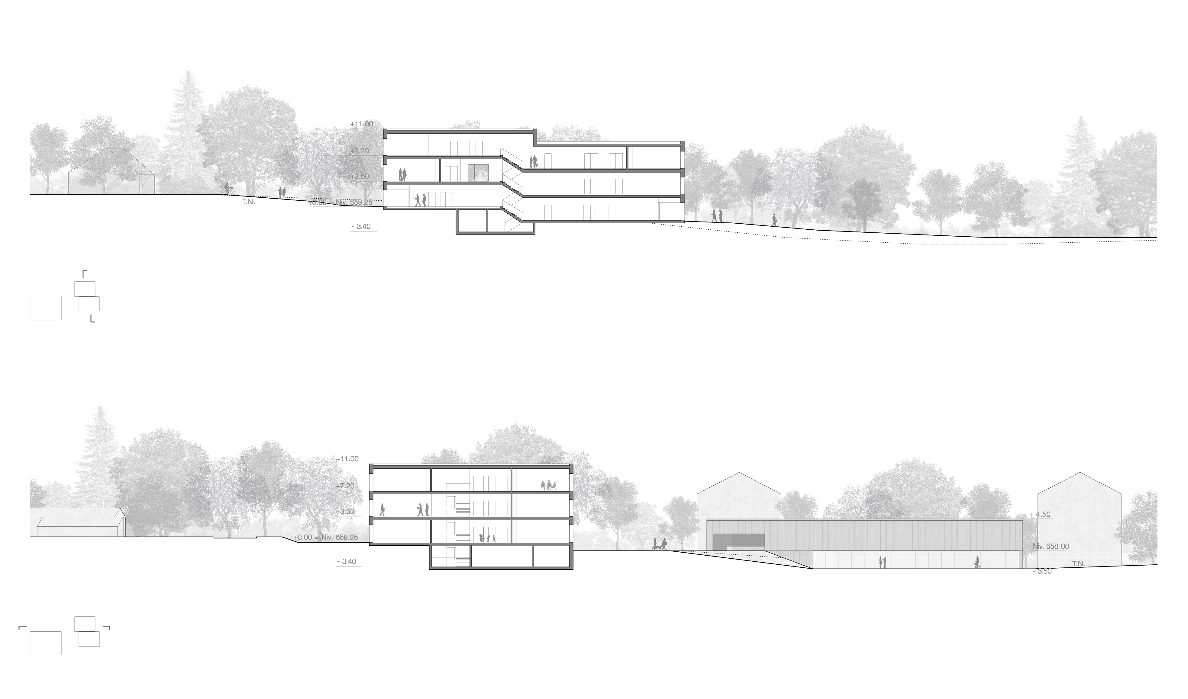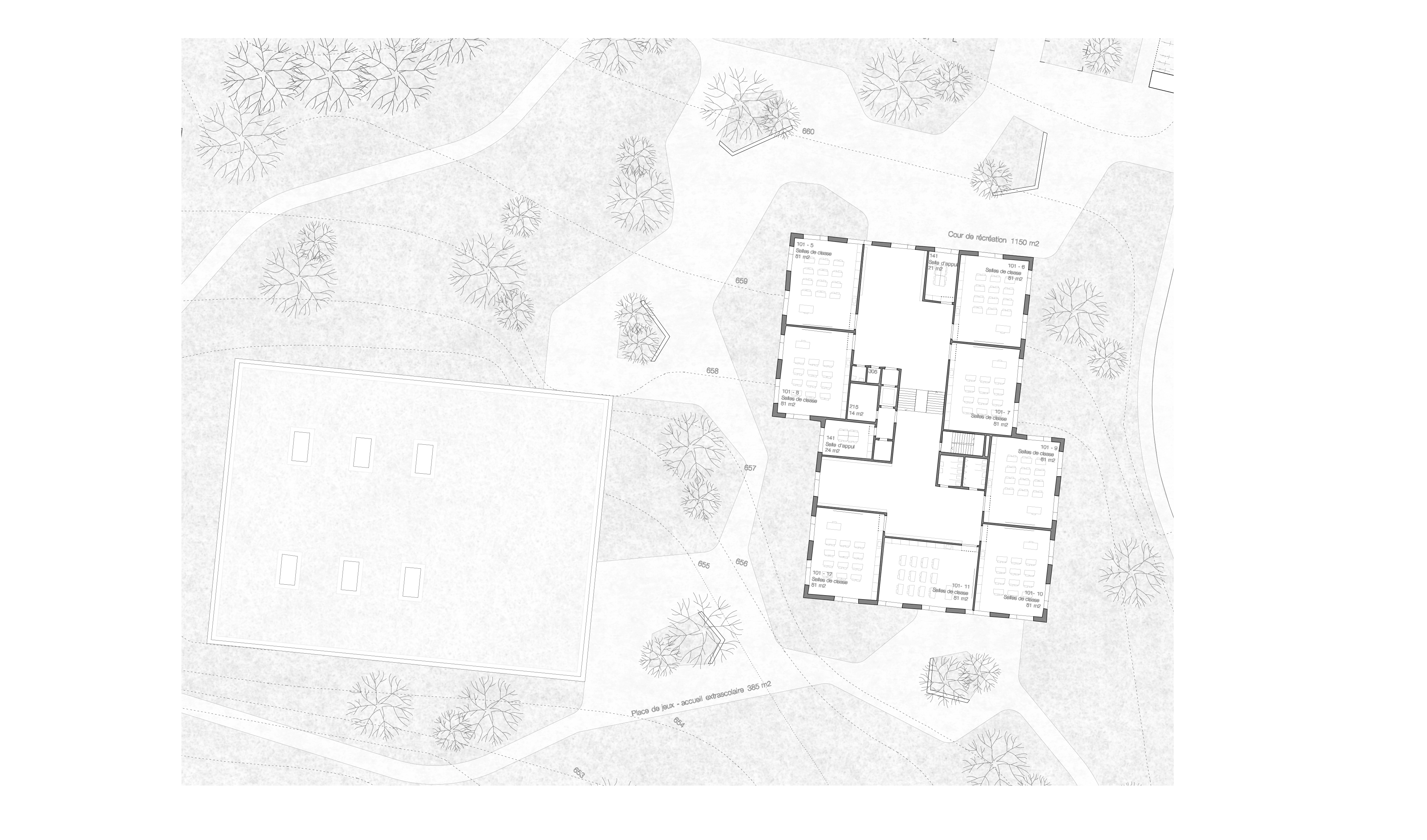 Le bâtiment des salles de classe épouse le relief du terrain en articulant 2 volumes qui s’étagent dans la pente, décalés l’un de l’autre d’un demi-niveau réduisant au minimum les excavations et déplacement de terre coûteux. Le volume unitaire des salles de sport s’oriente perpendiculairement à celui de l’école, de manière à former avec ce dernier une série de dégagements reliés les uns avec les autres par des cheminements. Le mode de distribution permet de séparer de manière simple et efficace les différentes parties du programme réparties dans deux volumes distincts. Dans le volume des salles de classe, les classes enfantines se situent au rez-de-chaussée inférieur, avec un prolongement extérieur séparé du préau principal. Les salles de classe à l’étage s’organisent autour de vastes halls de distribution, décalés en quinconce autour d’un escalier central. Des vues droites et diagonales découpent ces dégagements en plusieurs séquences spatiales qui s’ouvrent à la lumière naturelle par de larges baies vitrées s'orientant sur le paysage. On trouve au centre les parties communes (ascenseur, toilettes, espace photocopie, local nettoyage, etc) et un escalier à double volée reliant les étages par demi-niveau. L'emplacement de l'escalier au centre permet des vues diagonales et des mises en relations ouvertes entre les étages. Le volume des salles de sport accueille à l’étage supérieur la salle polyvalente avec ses locaux annexes (cuisine, sanitaires, dépôts); elle est accessible depuis un vaste couvert en relation directe avec l’esplanade principale. Cet accès permet aussi d’atteindre la salle de sport et les vestiaires. L'accueil parascolaire se situe à l’étage inférieur, accessible lui aussi par un vaste couvert