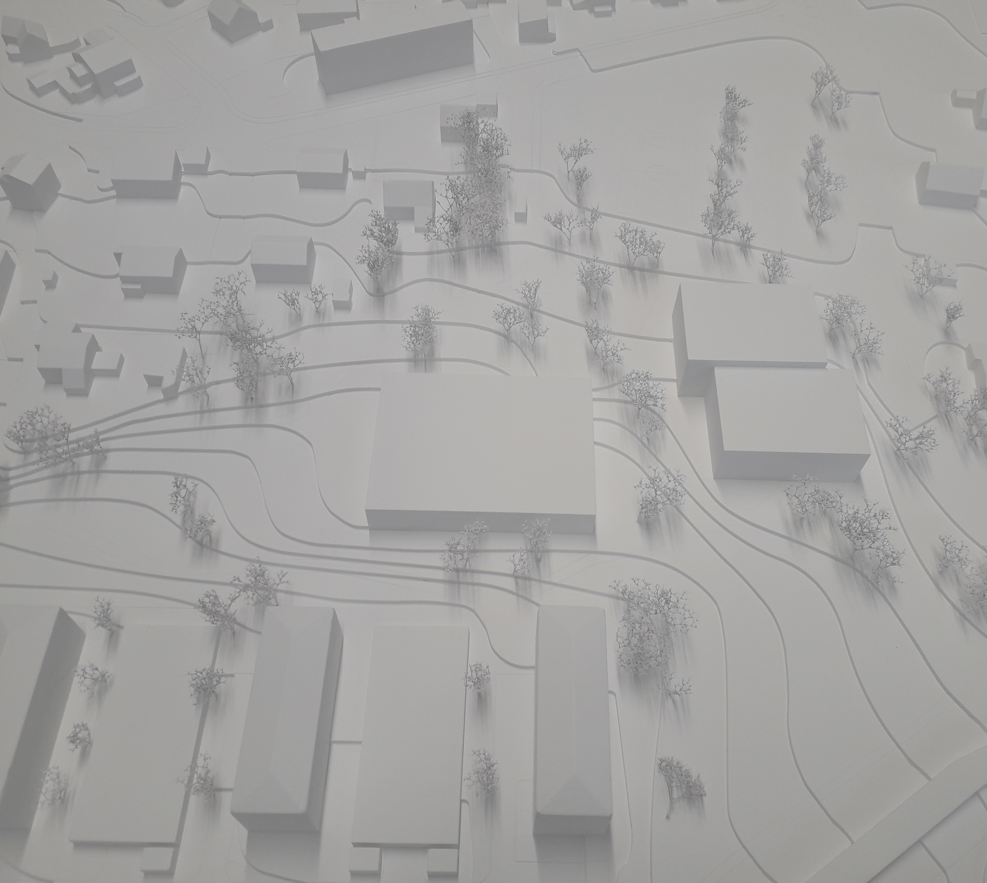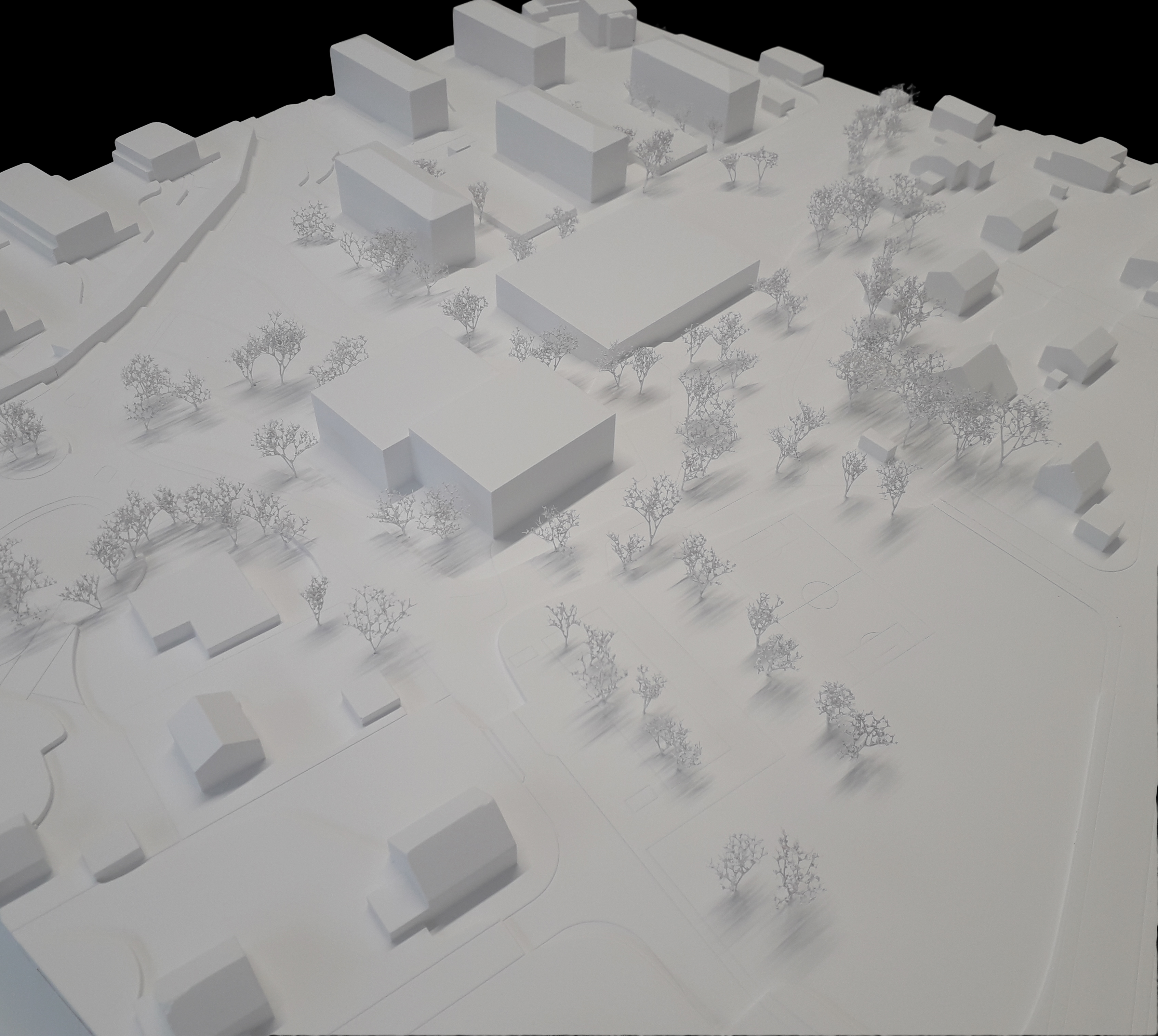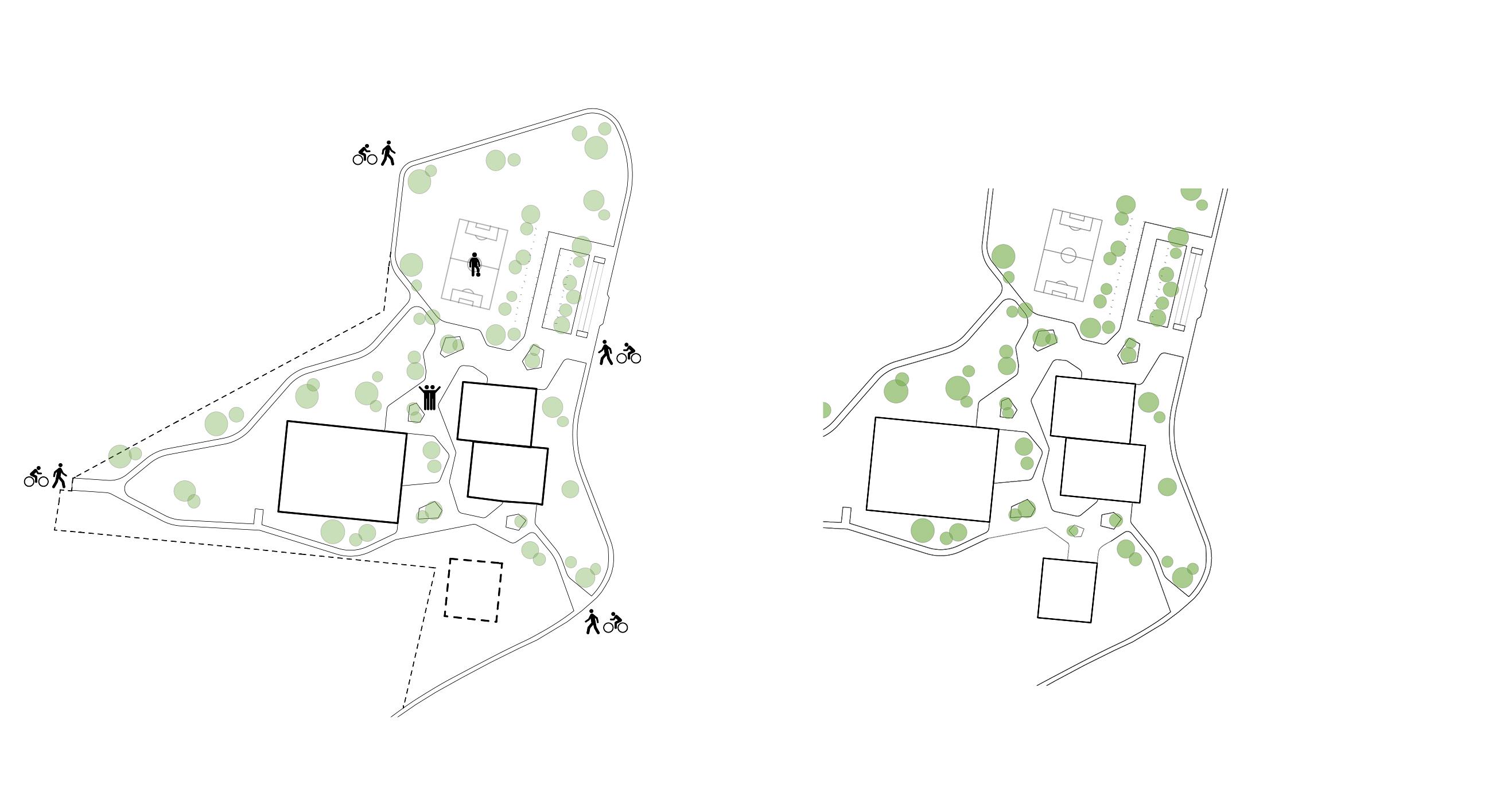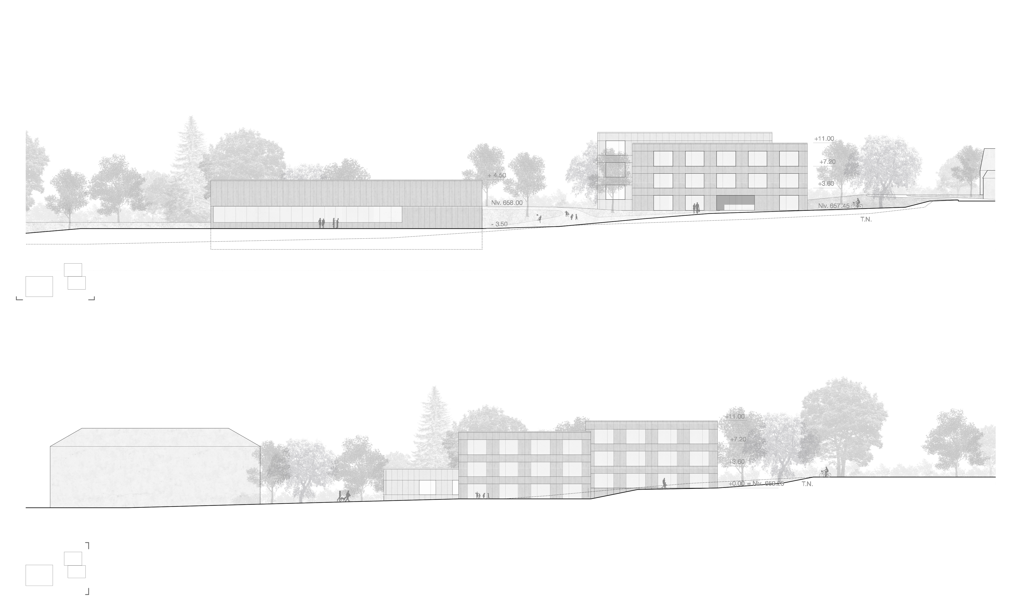 Le bâtiment des salles de classe épouse le relief du terrain en articulant 2 volumes qui s’étagent dans la pente, décalés l’un de l’autre d’un demi-niveau réduisant au minimum les excavations et déplacement de terre coûteux. Le volume unitaire des salles de sport s’oriente perpendiculairement à celui de l’école, de manière à former avec ce dernier une série de dégagements reliés les uns avec les autres par des cheminements. Le mode de distribution permet de séparer de manière simple et efficace les différentes parties du programme réparties dans deux volumes distincts. Dans le volume des salles de classe, les classes enfantines se situent au rez-de-chaussée inférieur, avec un prolongement extérieur séparé du préau principal. Les salles de classe à l’étage s’organisent autour de vastes halls de distribution, décalés en quinconce autour d’un escalier central. Des vues droites et diagonales découpent ces dégagements en plusieurs séquences spatiales qui s’ouvrent à la lumière naturelle par de larges baies vitrées s'orientant sur le paysage. On trouve au centre les parties communes (ascenseur, toilettes, espace photocopie, local nettoyage, etc) et un escalier à double volée reliant les étages par demi-niveau. L'emplacement de l'escalier au centre permet des vues diagonales et des mises en relations ouvertes entre les étages. Le volume des salles de sport accueille à l’étage supérieur la salle polyvalente avec ses locaux annexes (cuisine, sanitaires, dépôts); elle est accessible depuis un vaste couvert en relation directe avec l’esplanade principale. Cet accès permet aussi d’atteindre la salle de sport et les vestiaires. L'accueil parascolaire se situe à l’étage inférieur, accessible lui aussi par un vaste couvert