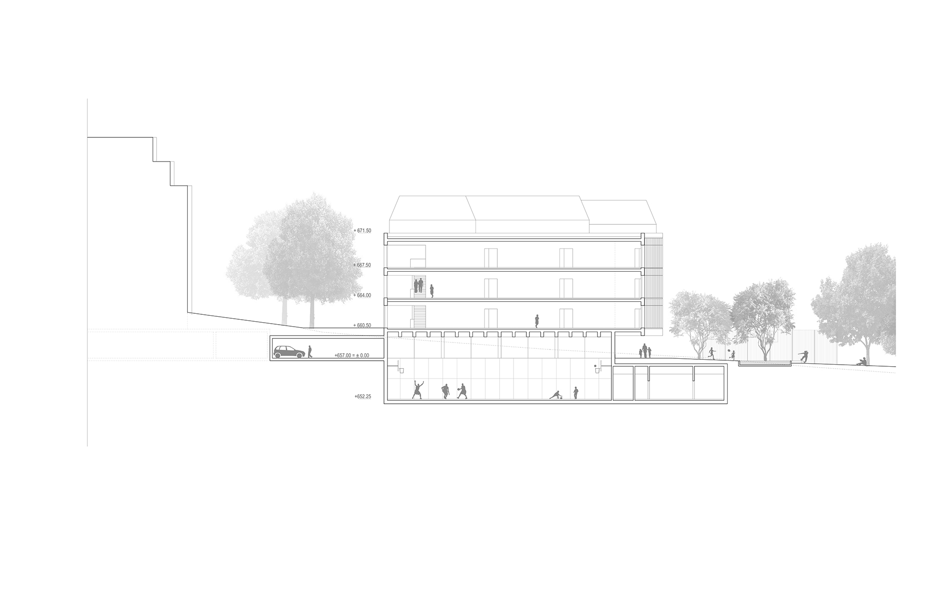 Le collège vient s'implanter en bordure sud-est du nouveau quartier d'habitations des Fiches, le long de la route de Berne. Le préau de l’école devient une nouvelle esplanade de convergence pour le quartier. Elle accueille le centre de vie enfantine existant, le nouvel APEMS et le terrain tous temps. L'école vient s'implanter en bordure de cette esplanade, sur la partie en amont de la parcelle. Elle profite de la déclivité du terrain pour offrir des accès à des niveaux différents: au nord l'entrée "administrative", au sud, l'entrée principale reliée aux préaux et aux terrains de jeux, hors circulation automobile. La liaison transversale souhaitée pour la mobilité douce d'est en ouest passe par l'esplanade et le préau scolaire. L'école se développe sur trois niveaux, la salle de sport se situe en partie basse, semi-enterrée. L'APEMS, plus petit en surface, cherche à se mettre en rapport avec la volumétrie du bâtiment scolaire historique de Petit Vennes, point de référence dans cette partie de l’esplanade.