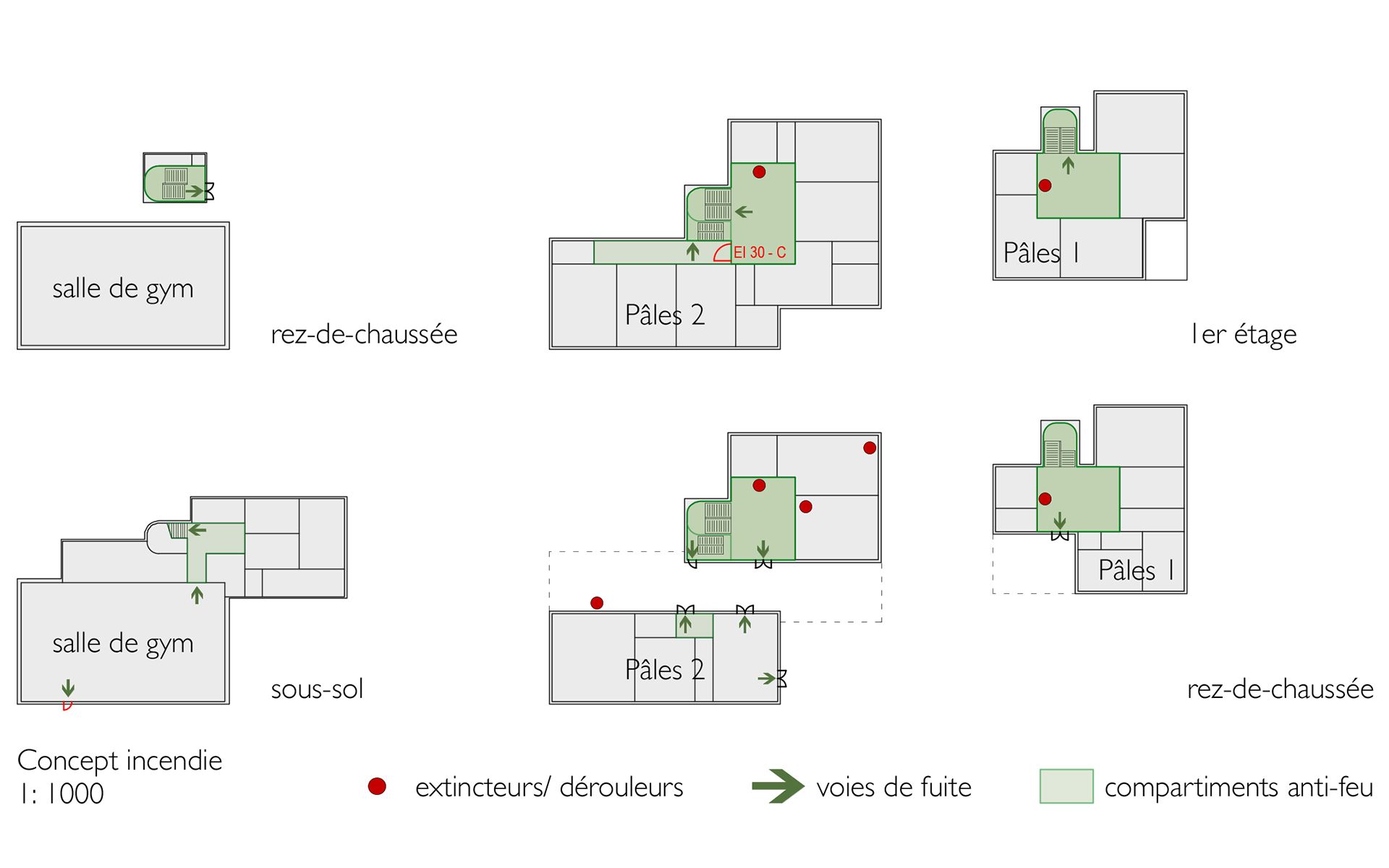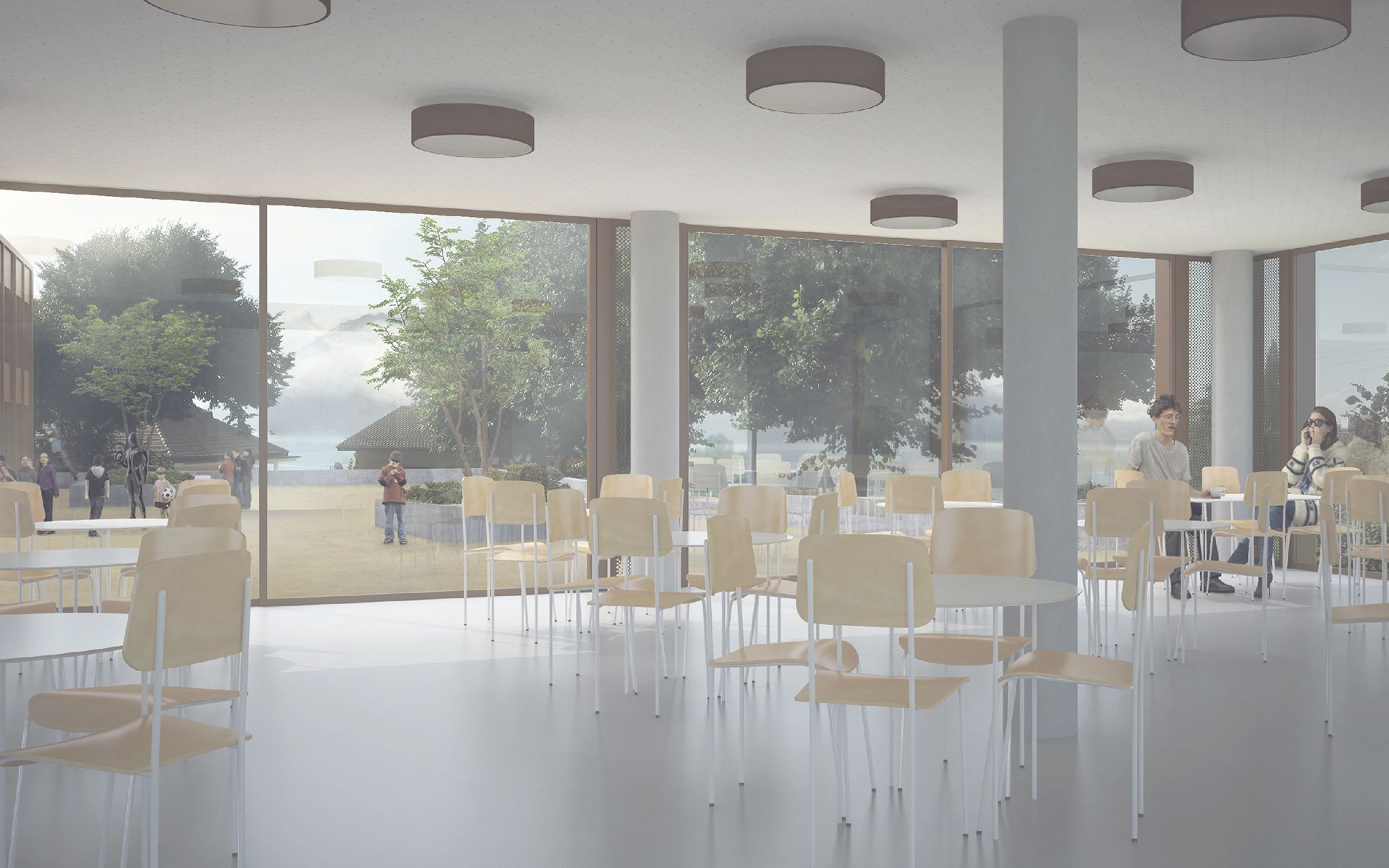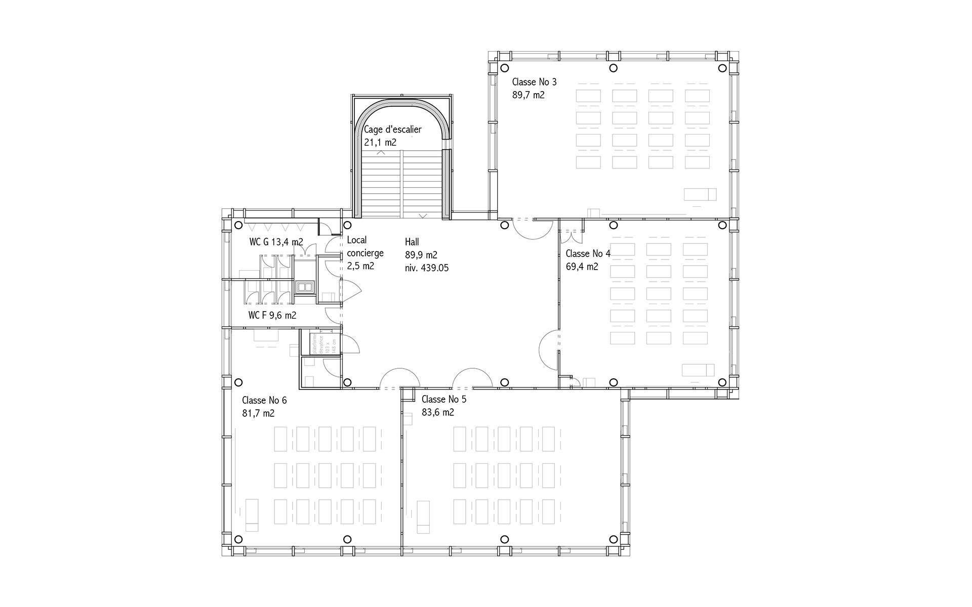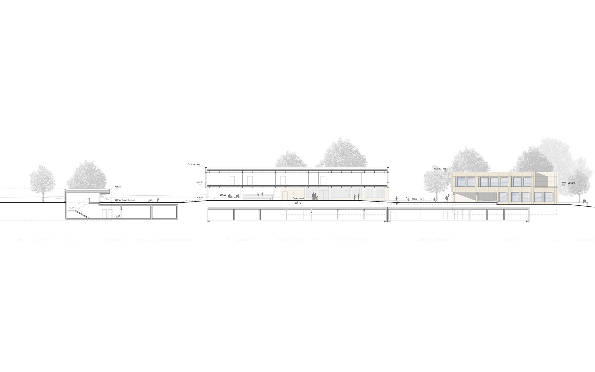 Le projet d’agrandissement consiste à intervenir ponctuellement en quelques endroits stratégiques. Le nouveau réfectoire scolaire est créé dans l’extension du volume existant au sud et profite ainsi du dégagement vers le paysage lémanique. Les autres interventions visent à mettre en conformité parasismique et de protection incendie les bâtiments existants (salle de sport, salles de classe, bureaux administratifs). L’enveloppe des bâtiments répond aux nouveaux standards énergétiques. Le système constructif de type CROCS est conservé dans son essence et sa matérialité. Les aménagements extérieurs sont remaniés pour supprimer les barrières architecturales existantes.