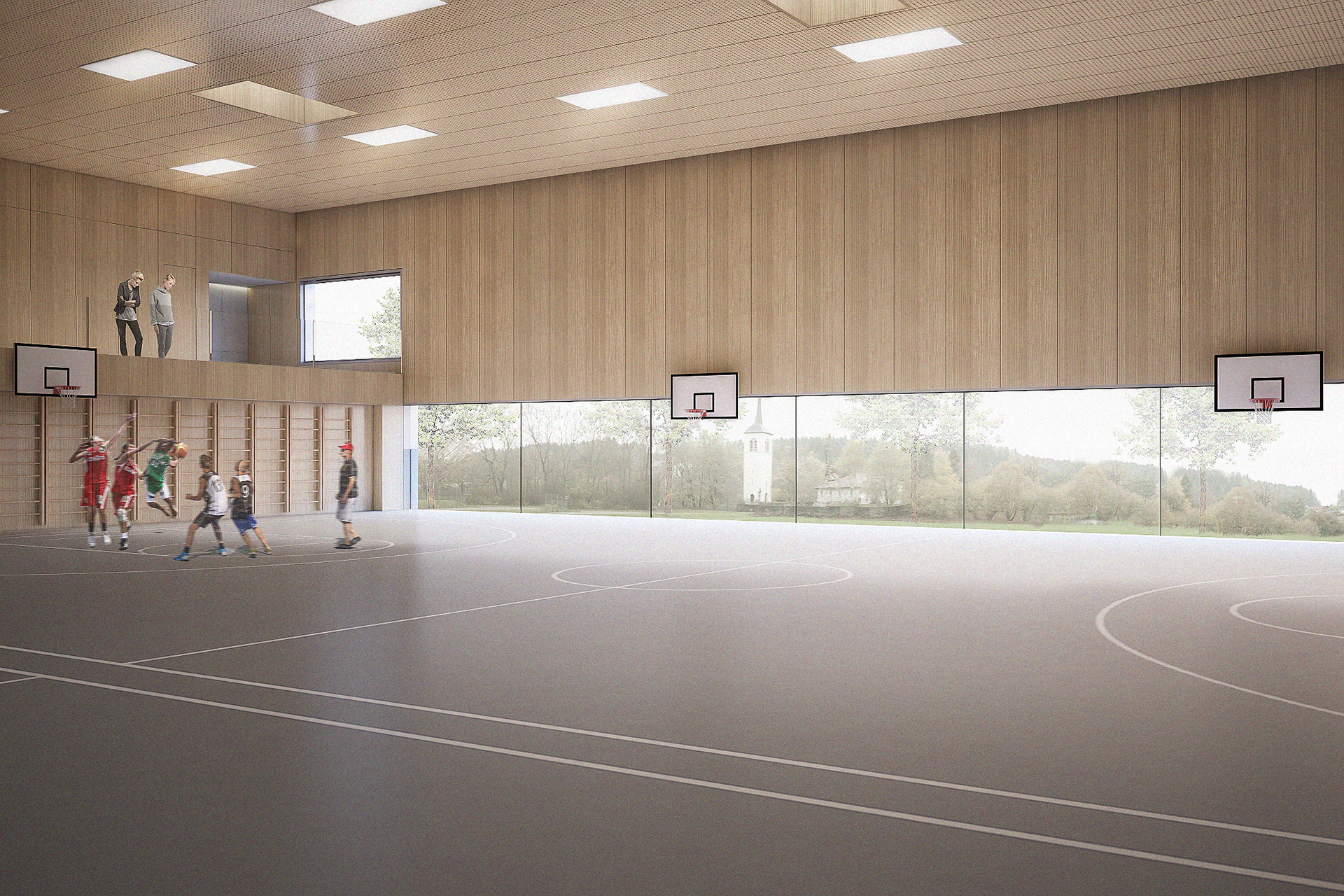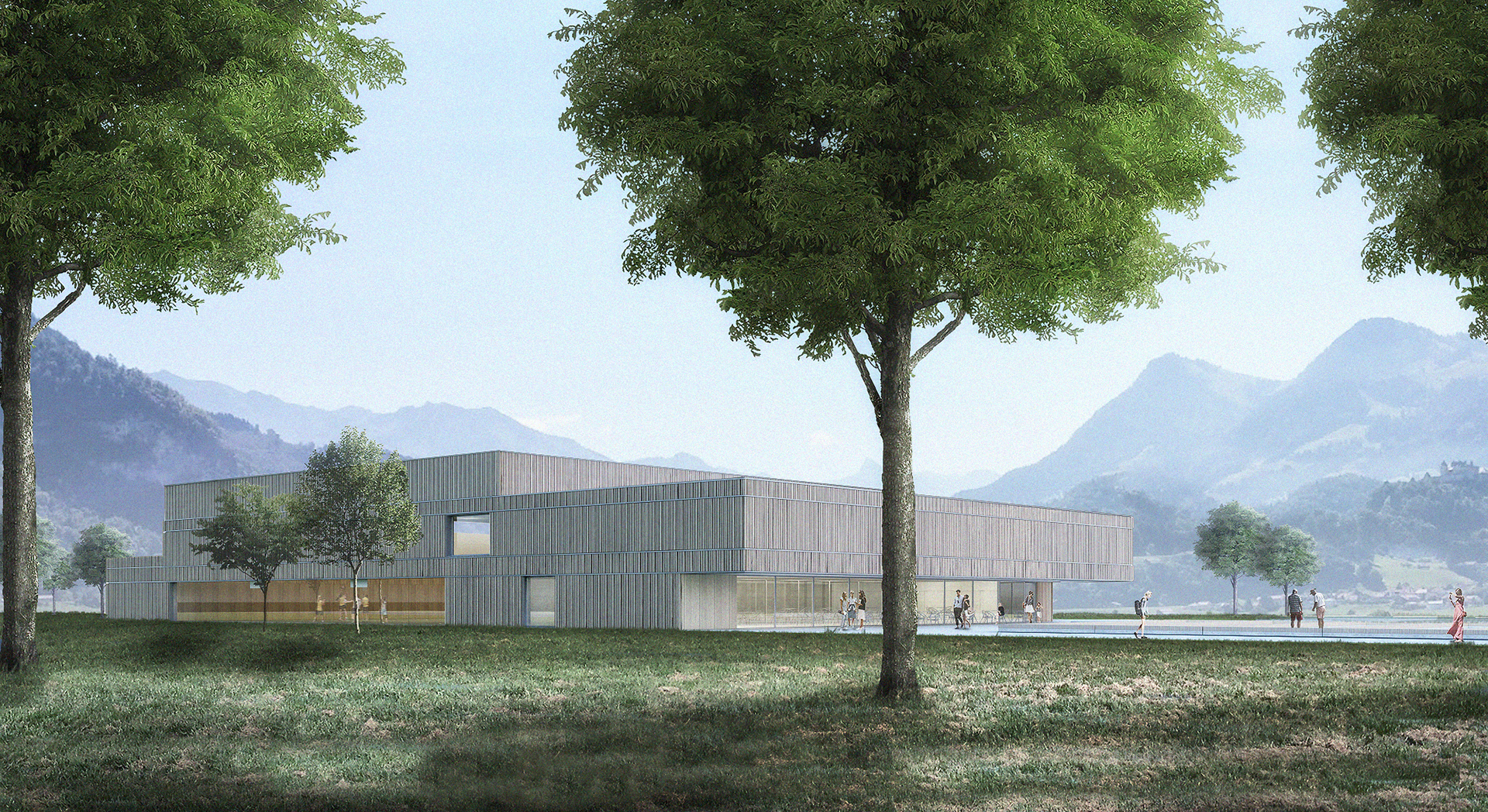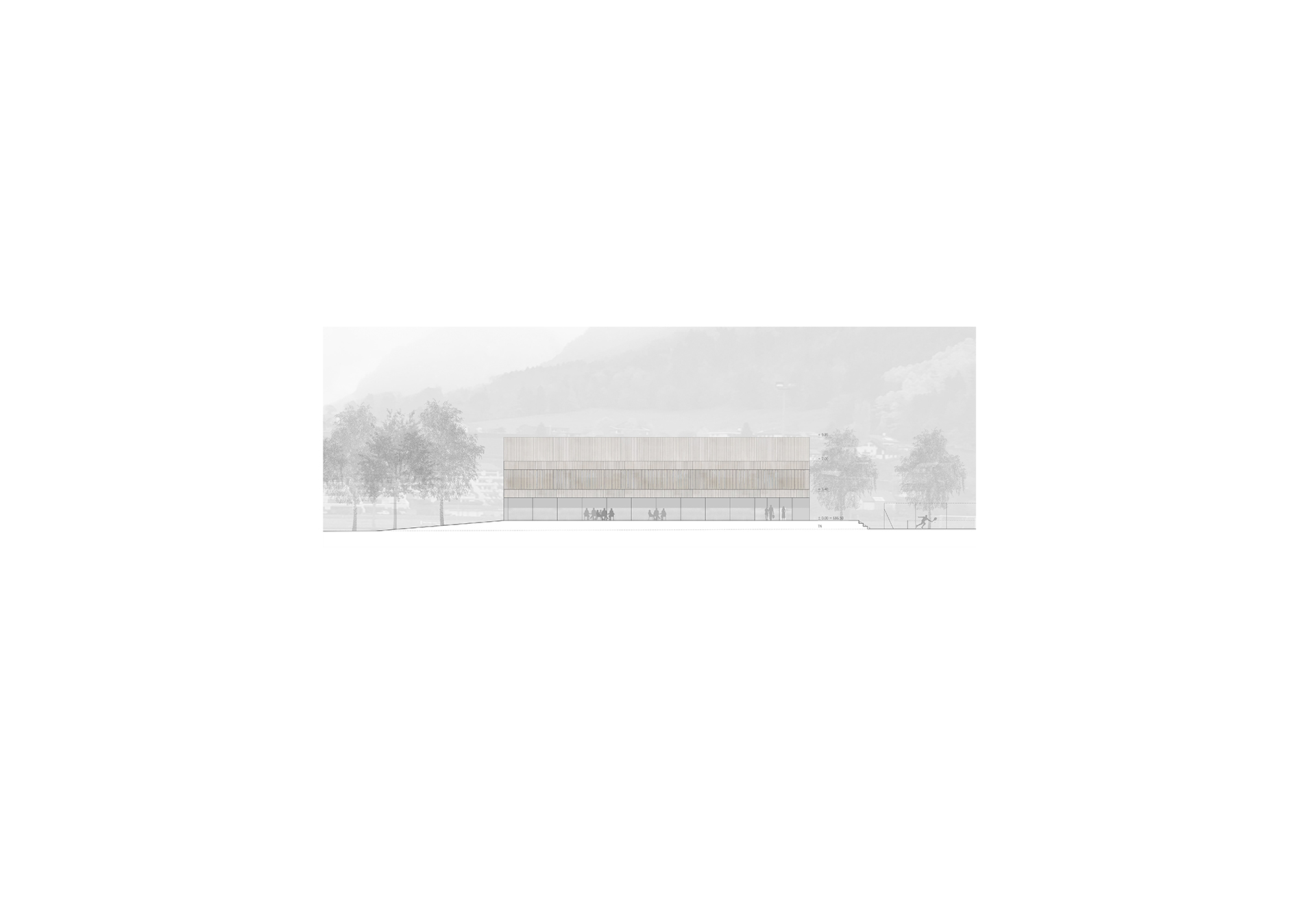Le site réservé pour développer le complexe sportif de la plaine des Marches est d’une qualité exceptionnelle : entre les collines qui annoncent les préalpes fribourgeoises, au sud du lac de la Gruyère, le village de Broc se développe sur la hauteur. Le projet s’implante parallèlement aux terrains de football et en bordure de la nouvelle plate-forme qui se termine en gradins en direction des terrains de tennis et de football. La buvette et sa terrasse couverte sont placées à côté de l’entrée, offrant aux utilisateurs autant une facilité d’accès qu’un regard sur la place de jeux ou les autres terrains de sport (tennis, multisport, football). La salle double s’ouvre généreusement à l’est comme à l’ouest sur le paysage. Des fenêtres en hauteur, aussi bien au nord qu’au sud, viennent compléter l’éclairage naturel à l’intérieur de la salle. La façade est constituée de panneaux sandwichs isolés en bois, recouverts d’un bardage en bois plus ou moins ajouré. Celui-ci est pré-traité, imprégné, pour avoir dès la construction un aspect brun foncé qui ne variera pas dans la durée et surtout gardera une teinte uniforme.