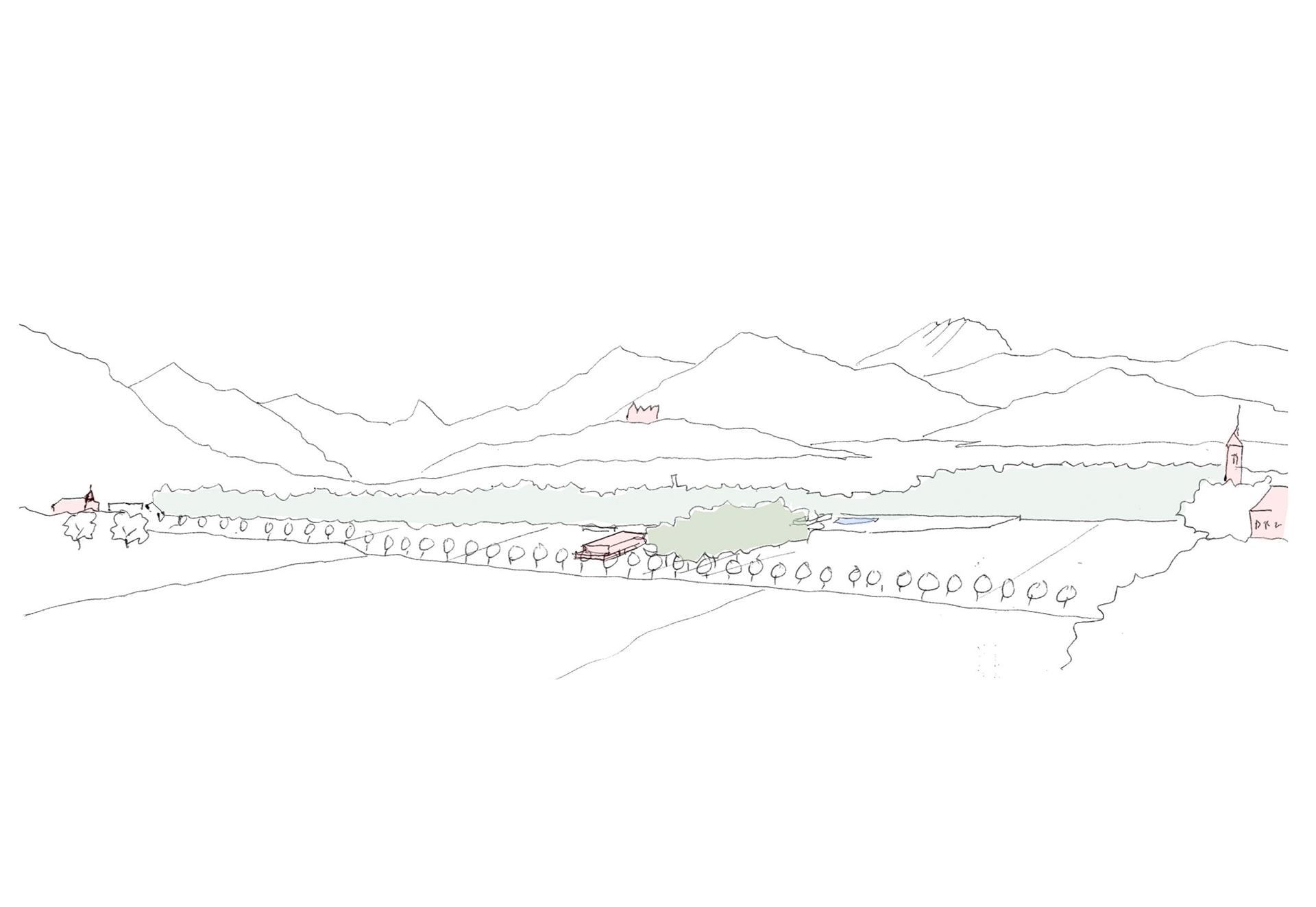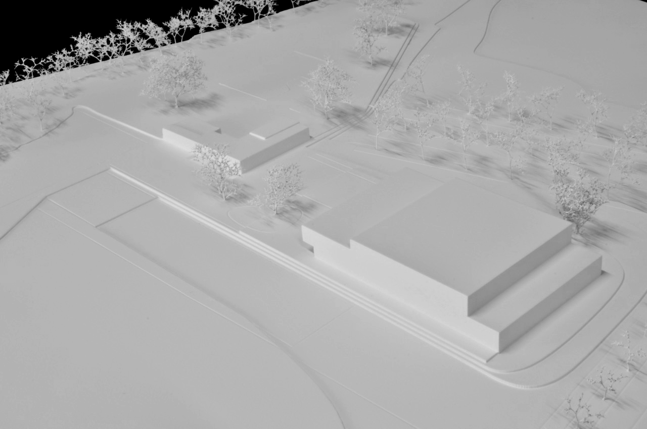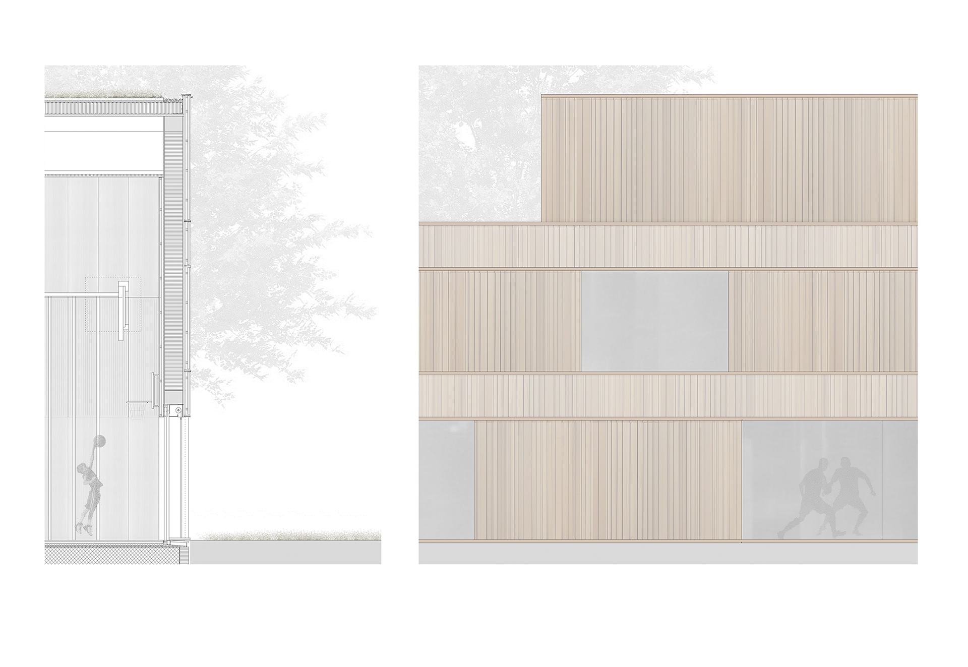 Le site réservé pour développer le complexe sportif de la plaine des Marches est d’une qualité exceptionnelle : entre les collines qui annoncent les préalpes fribourgeoises, au sud du lac de la Gruyère, le village de Broc se développe sur la hauteur. Le projet s’implante parallèlement aux terrains de football et en bordure de la nouvelle plate-forme qui se termine en gradins en direction des terrains de tennis et de football. La buvette et sa terrasse couverte sont placées à côté de l’entrée, offrant aux utilisateurs autant une facilité d’accès qu’un regard sur la place de jeux ou les autres terrains de sport (tennis, multisport, football). La salle double s’ouvre généreusement à l’est comme à l’ouest sur le paysage. Des fenêtres en hauteur, aussi bien au nord qu’au sud, viennent compléter l’éclairage naturel à l’intérieur de la salle. La façade est constituée de panneaux sandwichs isolés en bois, recouverts d’un bardage en bois plus ou moins ajouré. Celui-ci est pré-traité, imprégné, pour avoir dès la construction un aspect brun foncé qui ne variera pas dans la durée et surtout gardera une teinte uniforme.