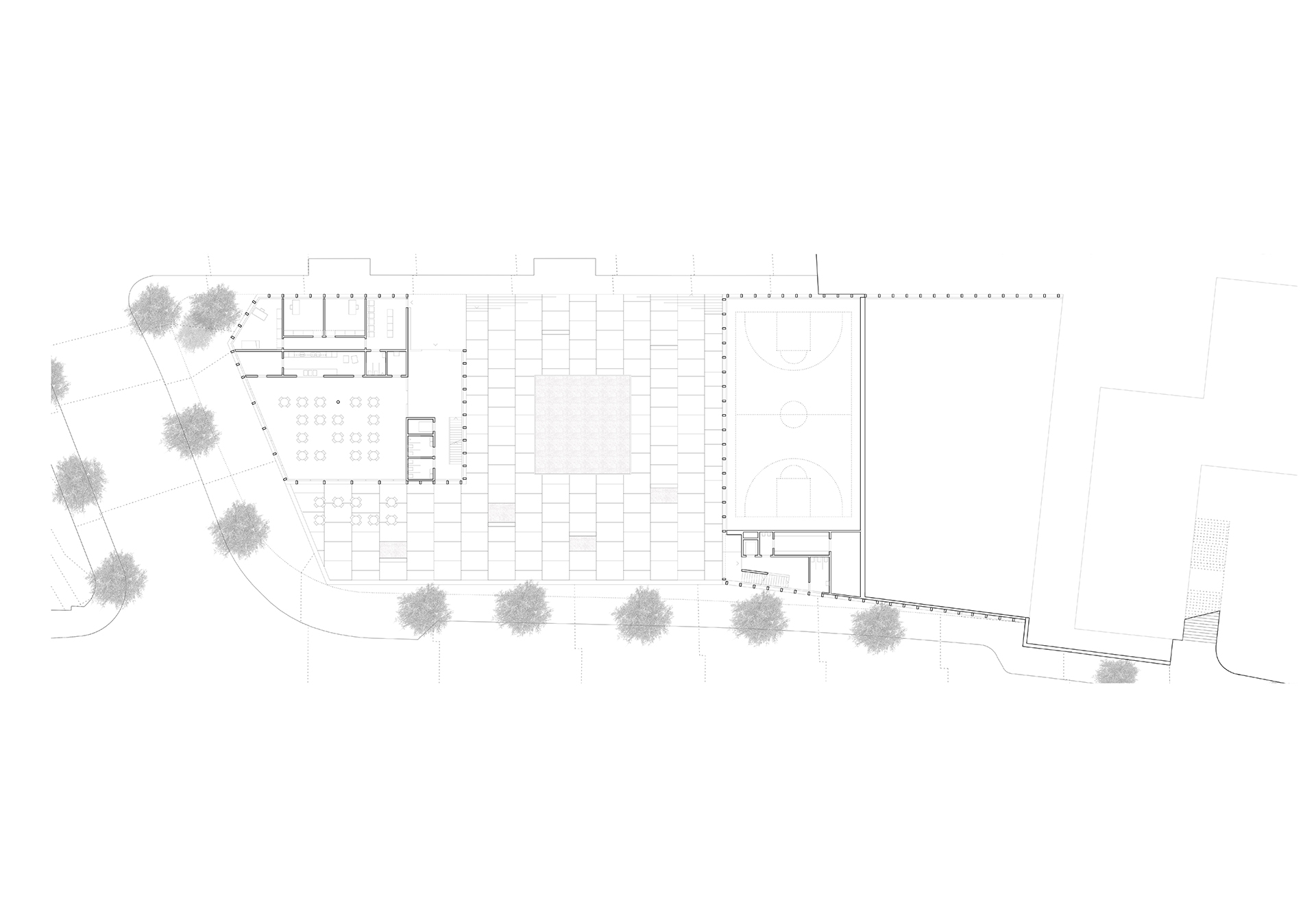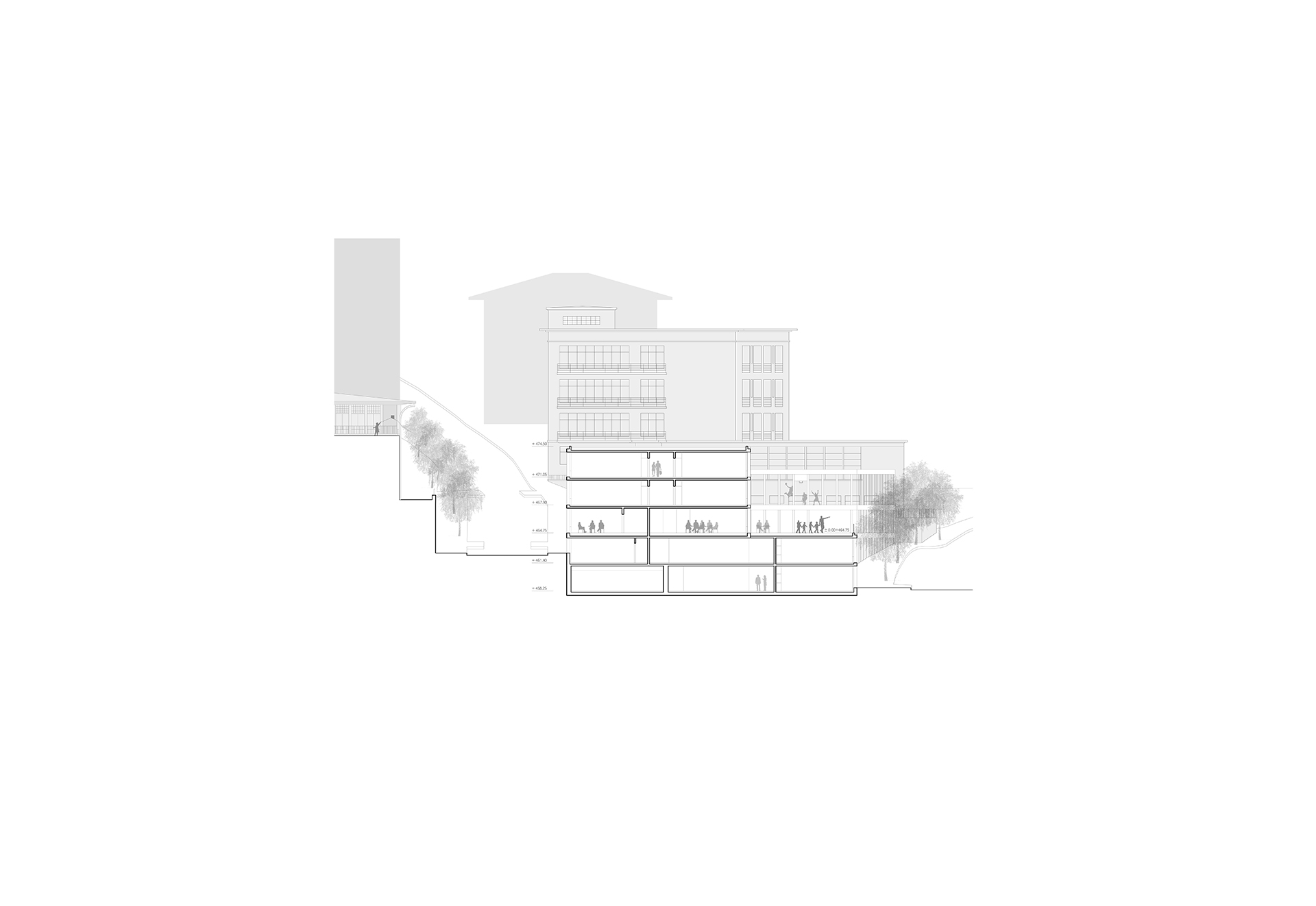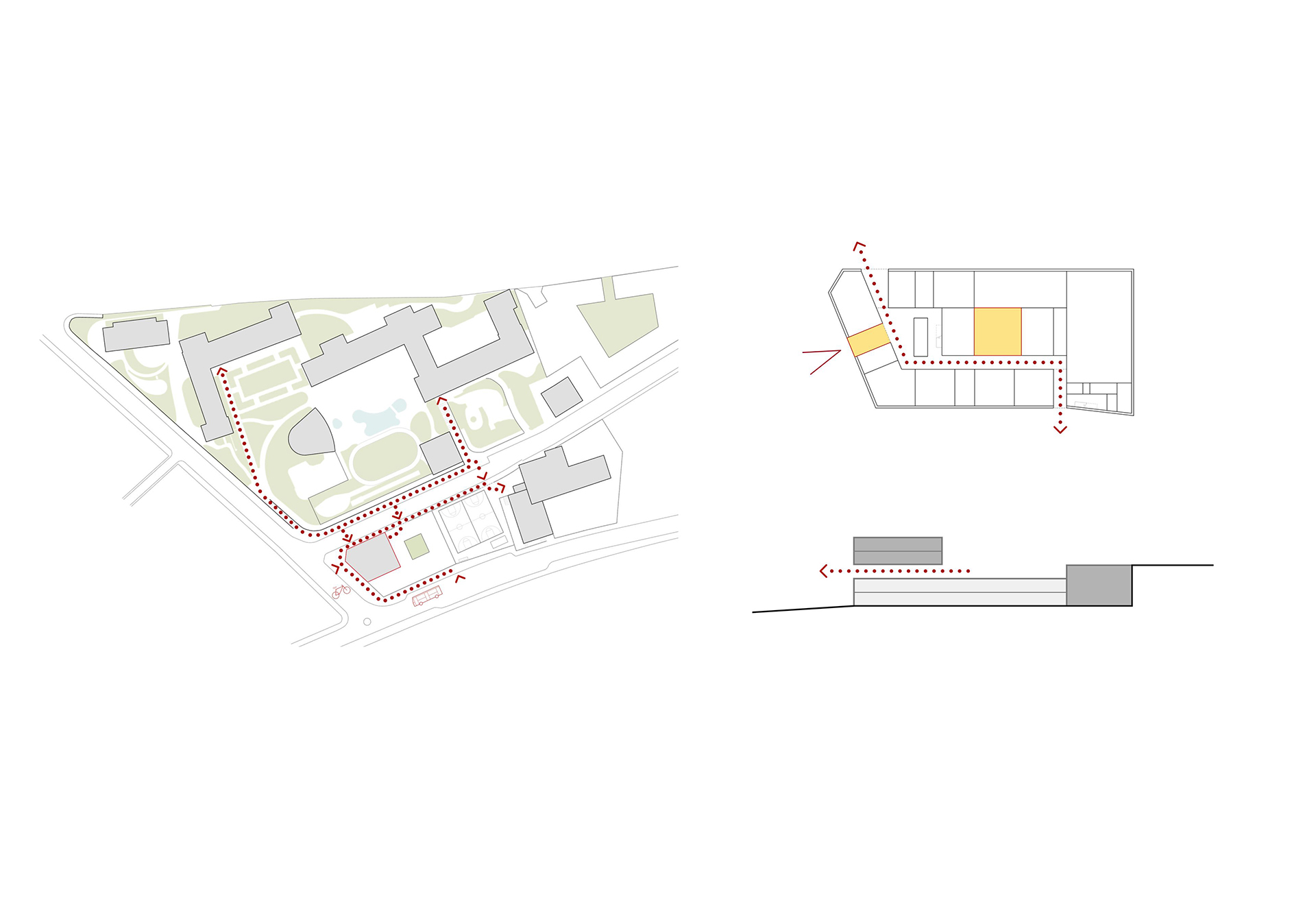Le bâtiment est relié à son environnement par des accès distincts qui suivent la déclivité des trois rues qui le bordent. Ces accès séparés et indépendants répondent à la demande du Maître d’ouvrage de distinguer et répartir le flux des élèves selon les programmes ou l’utilisation des locaux en dehors des horaires scolaires. L’accès principal de l’école se trouve au niveau de l’esplanade et fait « pendant » à l’entrée du collège des Croix-Rouges. La typologie et l’organisation de l’école est relativement simple : elle tire parti du site et des rues en pente qui la bordent, ainsi que des dégagements sur le paysage urbain et lacustre. Les salles de classes spéciales installées dans le socle s’organisent en « couronne » sur le pourtour du bâtiment autour d’un noyau de circulation verticale et d’un patio. Les salles de classe situées dans la tête émergente s’organisent simplement de part et d’autre d’un couloir central. Les circulations sont réduites à l’essentiel et ponctuées de lumière naturelle pour minimiser l’utilisation de l’éclairage artificiel. Elles sont également pourvues de dégagements sur l’extérieur pour faciliter l’orientation dans le bâtiment et offrir des vues sur le paysage. Cette organisation modulaire permet des rocades entre les différents locaux si le MO le souhaite, sans que le concept de base n'en soit modifié.