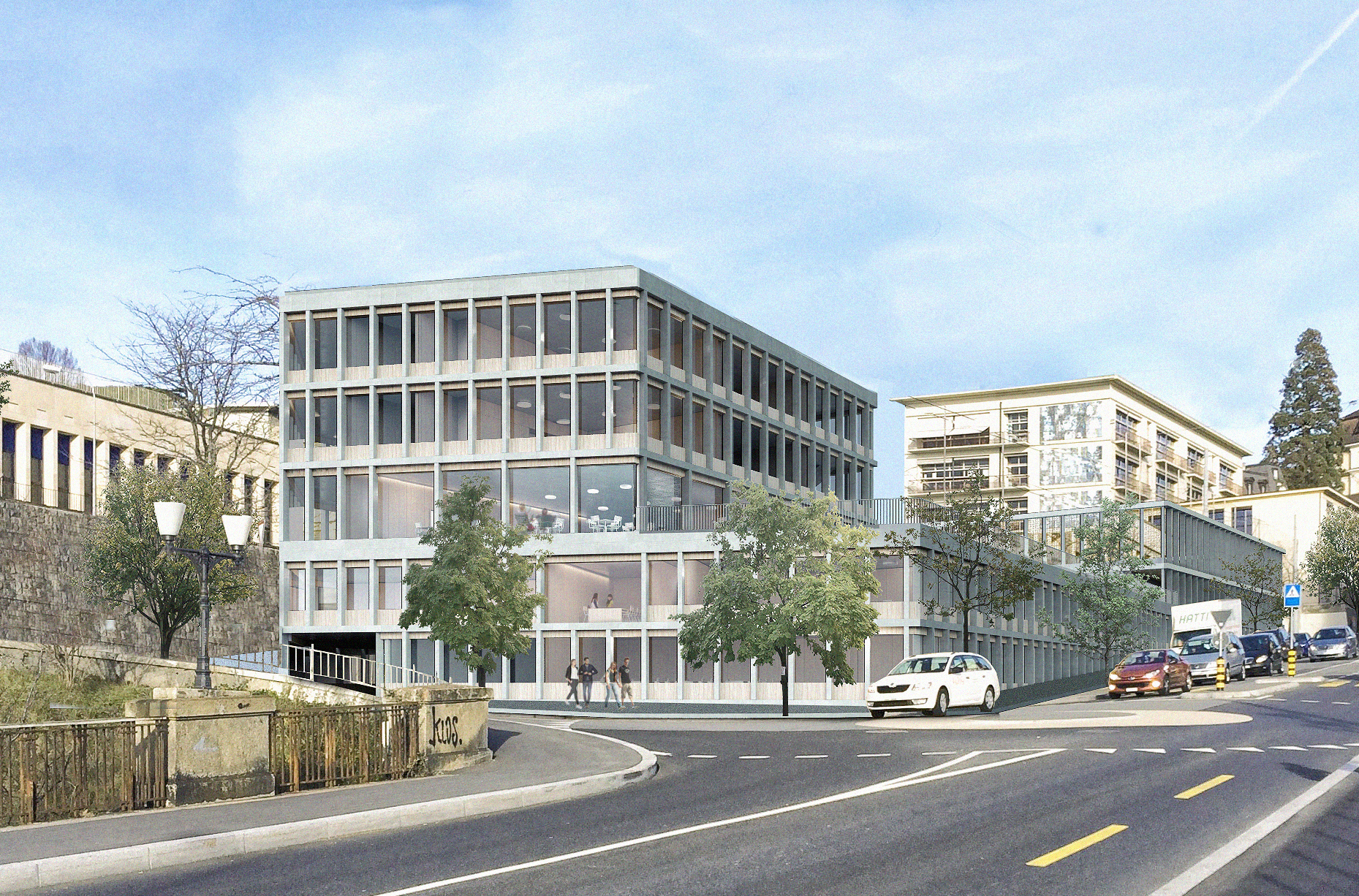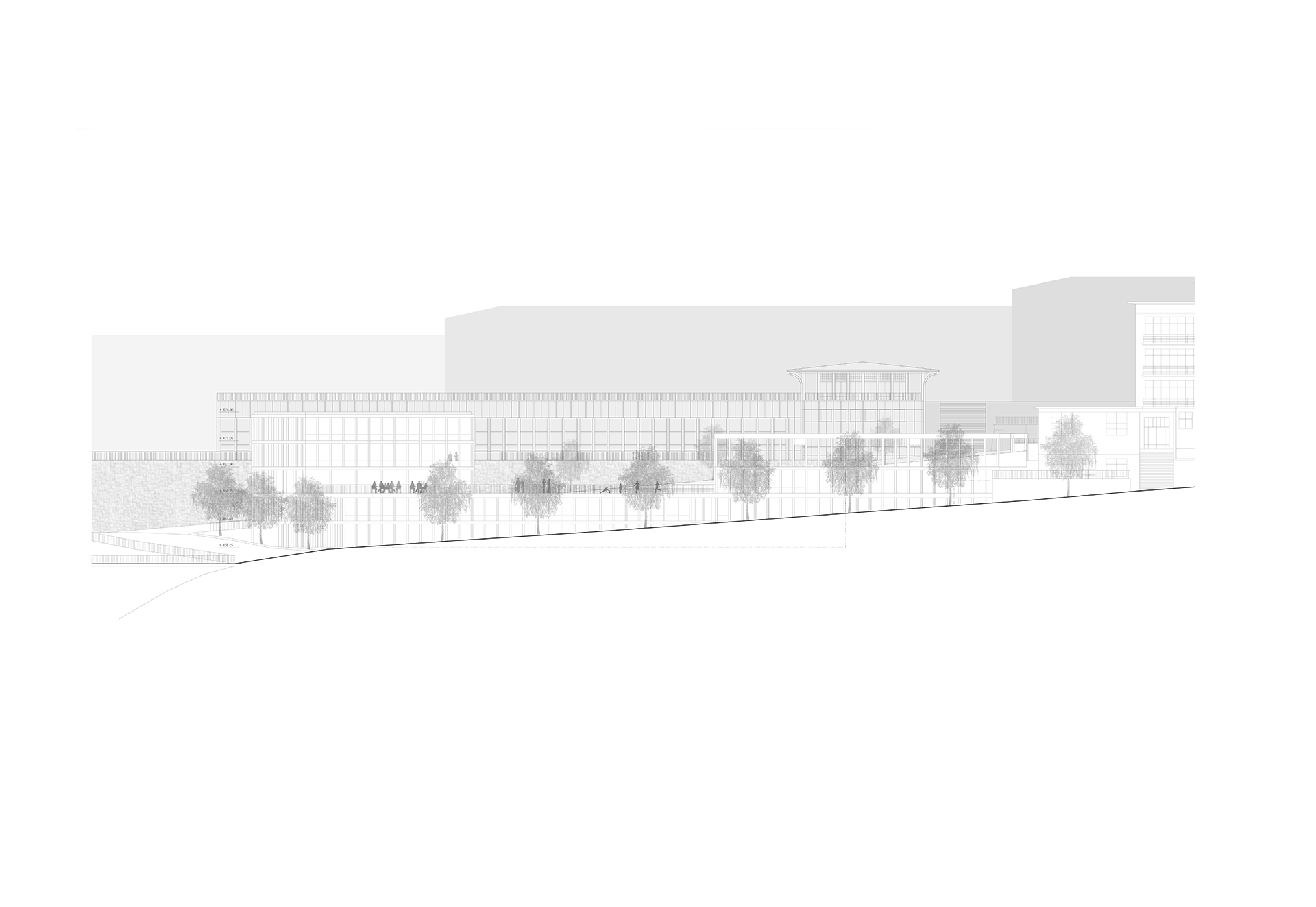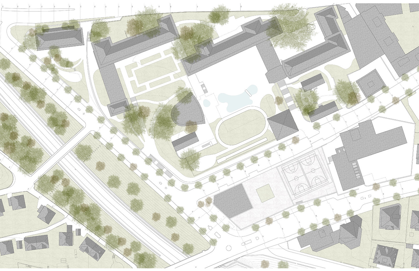 Le bâtiment est relié à son environnement par des accès distincts qui suivent la déclivité des trois rues qui le bordent. Ces accès séparés et indépendants répondent à la demande du Maître d’ouvrage de distinguer et répartir le flux des élèves selon les programmes ou l’utilisation des locaux en dehors des horaires scolaires. L’accès principal de l’école se trouve au niveau de l’esplanade et fait « pendant » à l’entrée du collège des Croix-Rouges. La typologie et l’organisation de l’école est relativement simple : elle tire parti du site et des rues en pente qui la bordent, ainsi que des dégagements sur le paysage urbain et lacustre. Les salles de classes spéciales installées dans le socle s’organisent en « couronne » sur le pourtour du bâtiment autour d’un noyau de circulation verticale et d’un patio. Les salles de classe situées dans la tête émergente s’organisent simplement de part et d’autre d’un couloir central. Les circulations sont réduites à l’essentiel et ponctuées de lumière naturelle pour minimiser l’utilisation de l’éclairage artificiel. Elles sont également pourvues de dégagements sur l’extérieur pour faciliter l’orientation dans le bâtiment et offrir des vues sur le paysage. Cette organisation modulaire permet des rocades entre les différents locaux si le MO le souhaite, sans que le concept de base n'en soit modifié.