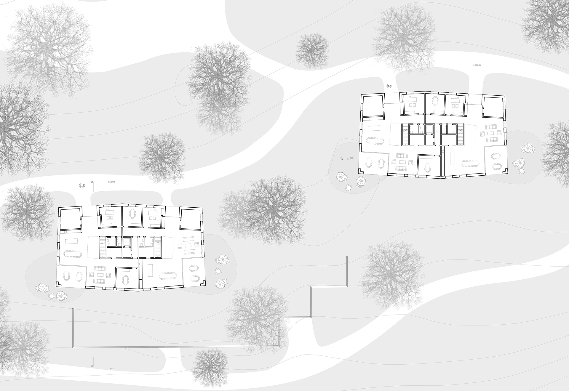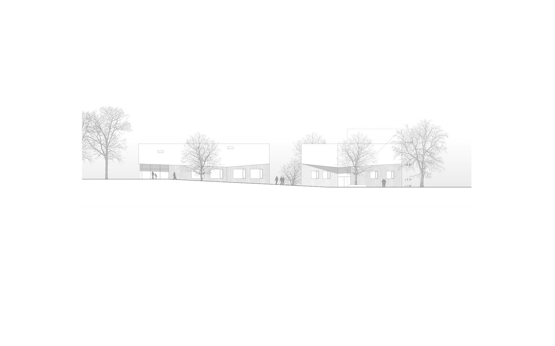 L’implantation stricte et linéaire des bâtiments actuels est remplacée par une disposition plus libre laissant plus de place entre les différents bâtiments, dans un contexte paysager et arboré. Les bâtiments sont reliés entre eux par des parcours qui serpentent au milieu d’un grand jardin recomposé, où l’arborisation existante est maintenue et complétée par de nouvelles essences. Les voitures se concentrent à l’entrée du site pour en préserver le caractère naturel et paysager. Le programme se répartit dans 3 groupes distincts de bâtiments situés à chaque extrémité du site. Les bâtiments en rapport avec l’accueil (administration, direction et bureaux des thérapeutes) et l’apprentissage (cuisine, salle polyvalente, salles de classe) sont disposés en quinconce l’un par rapport à l’autre. Ils définissent deux espaces distincts et communicants entre eux qui tirent parti des différences de niveau du terrain. Les bâtiments contenant les quatre groupes éducatifs sont disposés dans un grand jardin à l’autre extrémité du site, dans une zone plus calme et retirée. Le bâtiment des salles de classe se trouve entre ces deux pôles, relié aux nouvelles salles de classe par un préau scolaire commun.