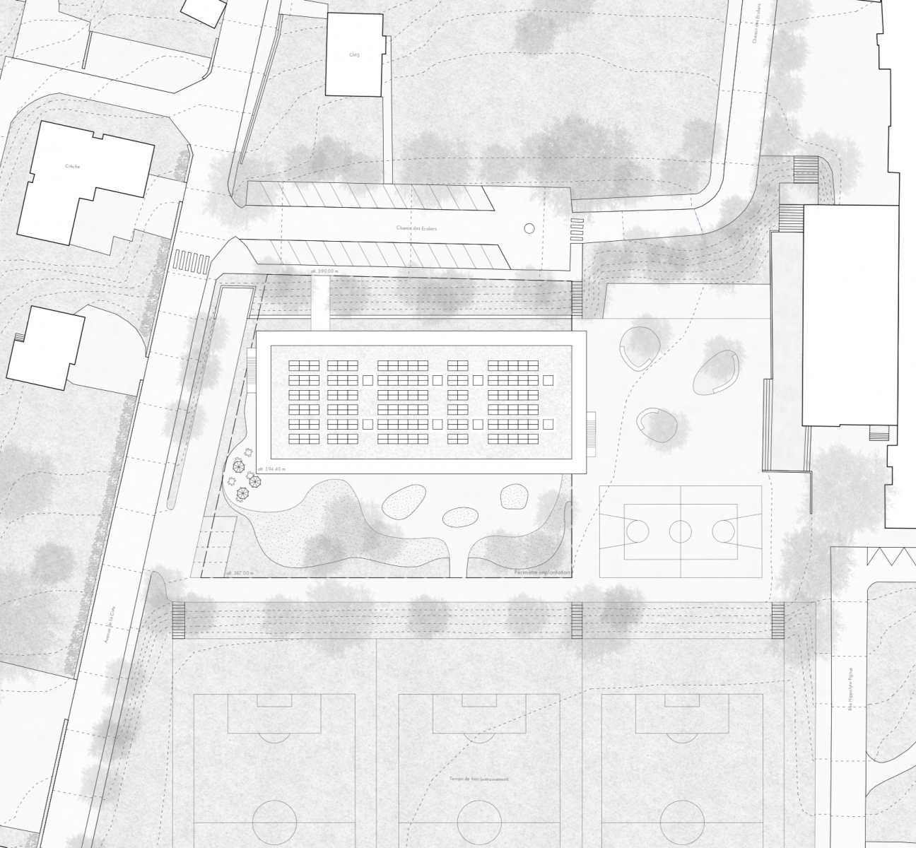 Le nouveau bâtiment met en relation la partie haute du site située le long du chemin des Ecoliers avec la partie basse accueillant le préau scolaire, au moyen d’une passerelle, d’un ascenseur et d’escaliers facilement atteignables par des coursives entourant le bâtiment. On trouve au rez-de-chaussée la nurserie, à l’extrémité ouest, qui bénéficie d’une extension extérieure sécurisée et arborée, ainsi que l’UAPE à l’autre extrémité, en relation directe avec l’école et les terrains de sport voisins, tout en préservant son autonomie spatiale. Le bâtiment est entièrement conçu en structure porteuse bois, à l’exception des coursives et de la cage d’ascenseur en béton armé, qui servent de contreventement à l’ensemble. Les dalles sont constituées de plancher mixtes bois-béton préfabriqués en usine, qui permettent l’usage du bois local et une grande rapidité de mise en œuvre, tout en garantissant le confort acoustique nécessaire pour une structure d’accueil de l’enfance. Les grandes coursives en béton créent d’importants avant-toits, permettant la régulation optimale de la lumière en fonction des saisons. Le bois est également utilisé pour la fabrication des fenêtres ou de tous les panneaux de remplissage ou de doublage des murs intérieurs ou de façade.