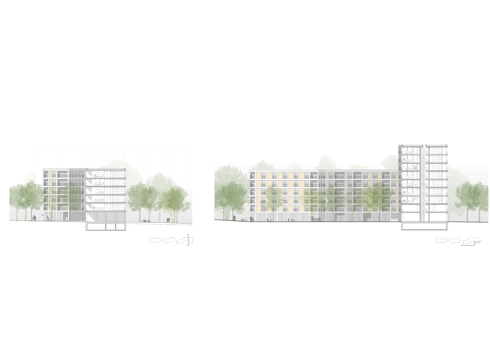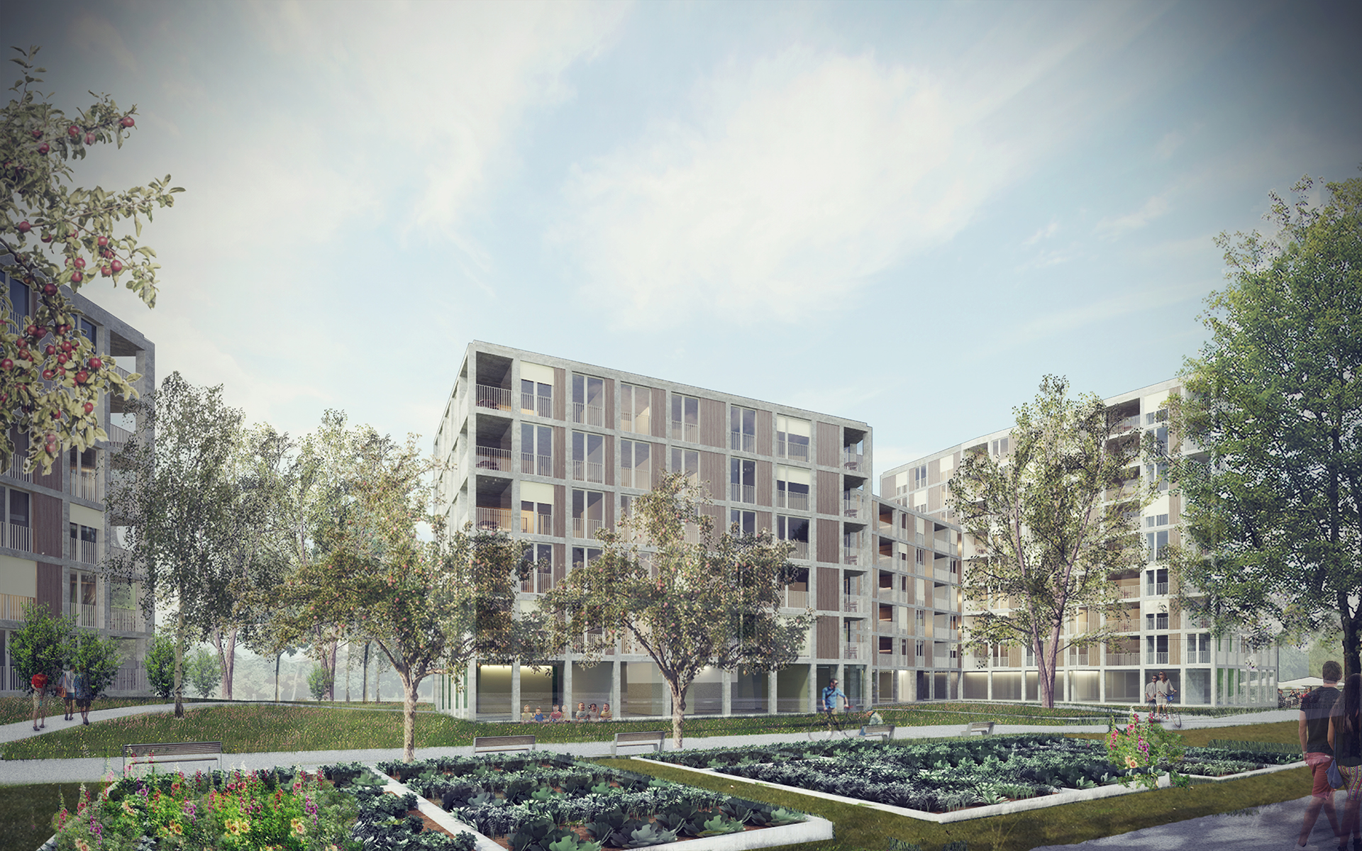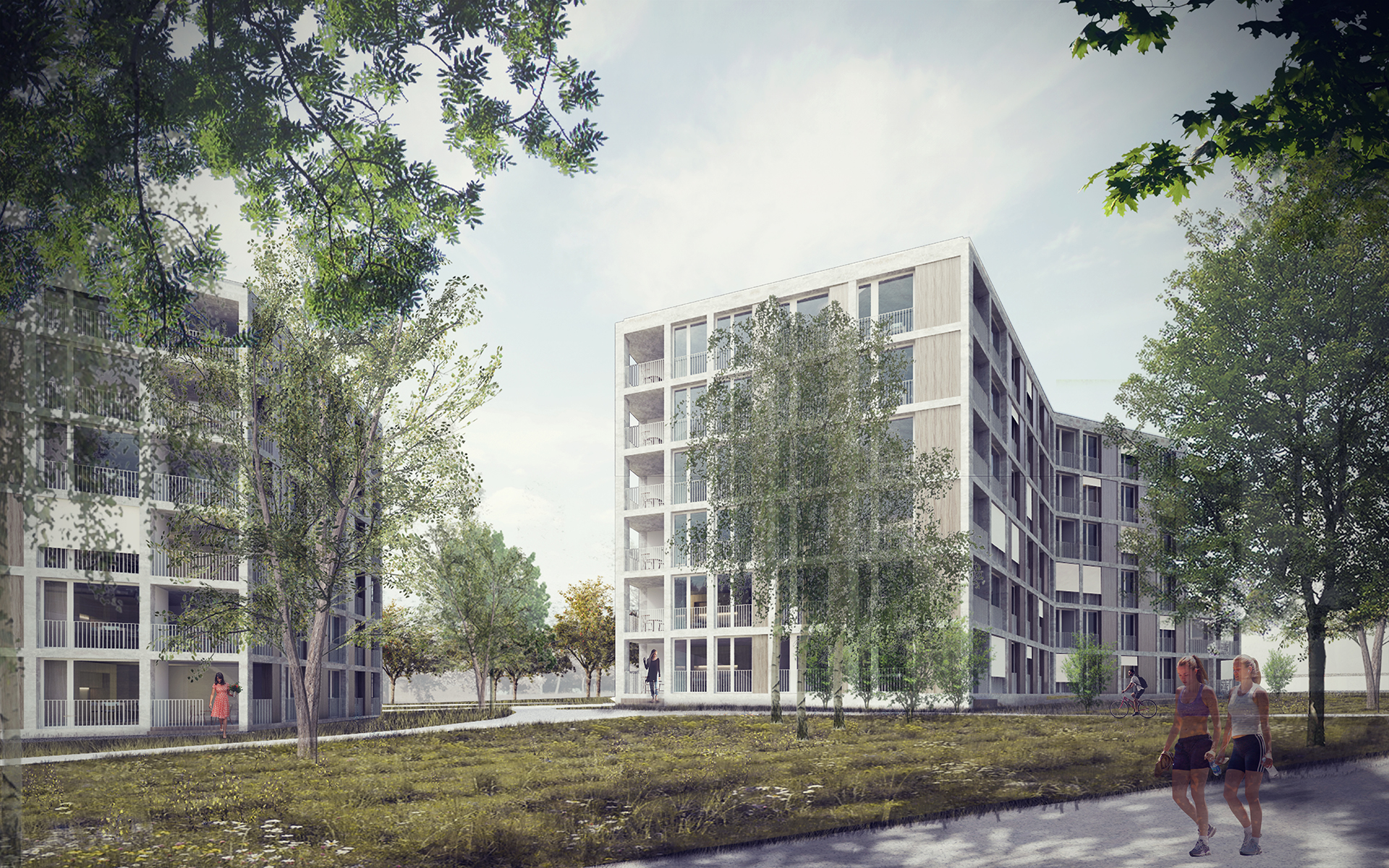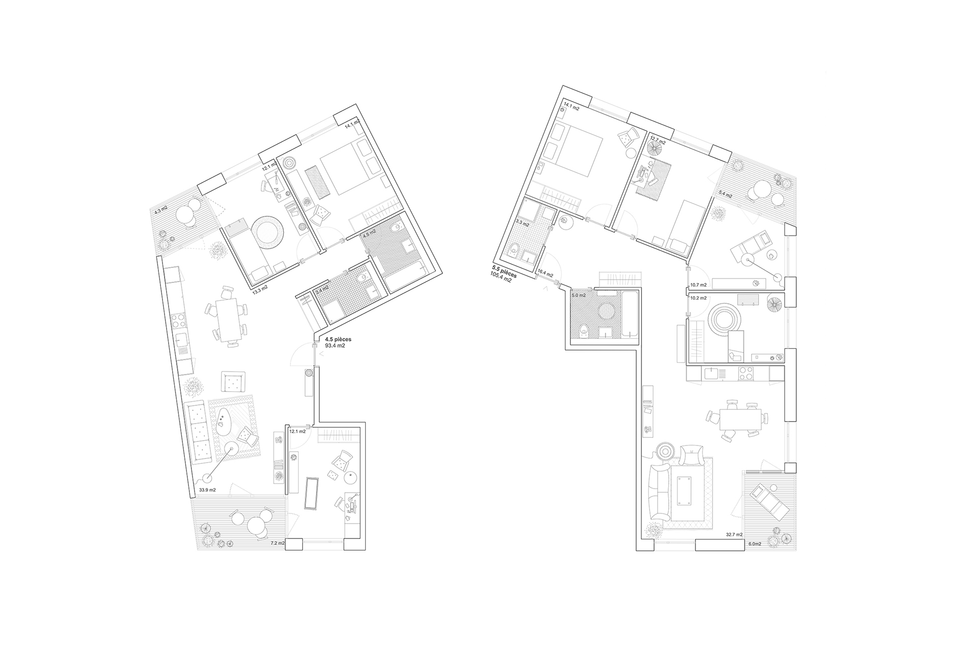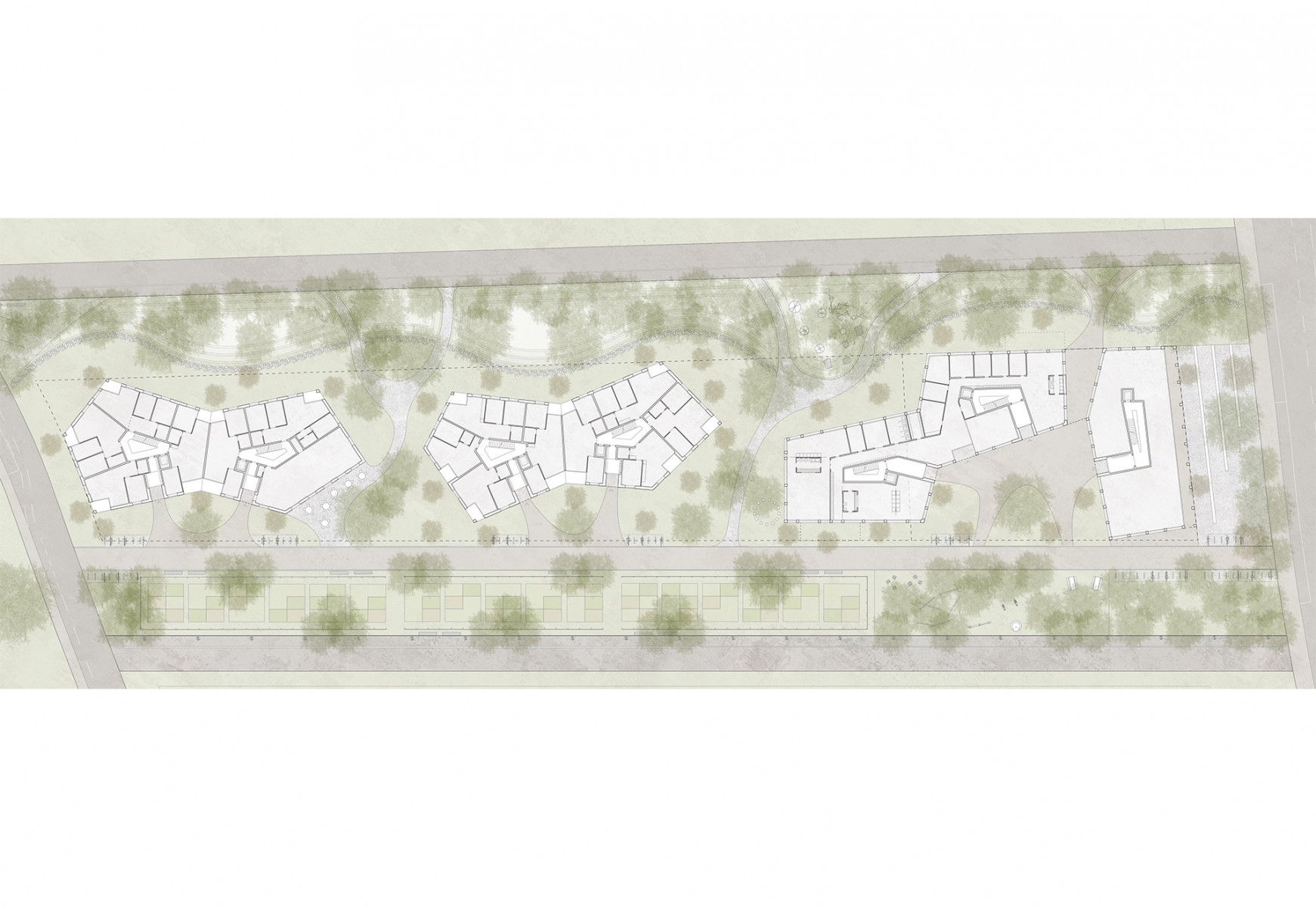 Le concept d’implantation des volumes bâtis des différentes coopératives découle du cahier des principes d’aménagement urbanistique et paysager établi pour l’ensemble du site et plus particulièrement pour la pièce urbaine C. La forme urbaine de cette pièce longue et étroite s’apparente à une barre et non pas à un ilôt, comme c’est le cas pour d’autres pièces urbaines sur le site. En partant de cette forme linéaire initiale, sans redent ni décalage, et en la rendant plus perméable par la multiplication des passages traversant le site, la continuité de la figure s’enrichit de séquences et de déformations qui font la part belle aux aménagements extérieurs et aux plantations, malgré la densité importante du programme de logements demandé. L’organisation des appartements se veut simple et rationnelle. Les angles des différents bâtiments accueillent les pièces de jour, les façades linéaires les chambres qui sont de forme rectangulaire. L’organisation des appartements se veut simple et rationnelle. Les angles des différents bâtiments accueillent les pièces de jour, les façades linéaires les chambres qui sont de forme rectangulaire. Depuis l’entrée du logement, un hall doté d’une armoire/vestiaire distribue les chambres et les locaux sanitaires. Dans son prolongement, les pièces de jour de l’appartement se dévoilent dans toute leur profondeur et leur spatialité. Cette séquence se termine par le balcon/loggia qui organise et différencie le séjour du coin cuisine/salle à manger. L’absence de couloirs au profit de surfaces de dégagement plus généreuses restitue plus de surface utile pour le logement, appropriable pour des usages variés (coins bureau, surface de jeu, rangements/bibliothèque).