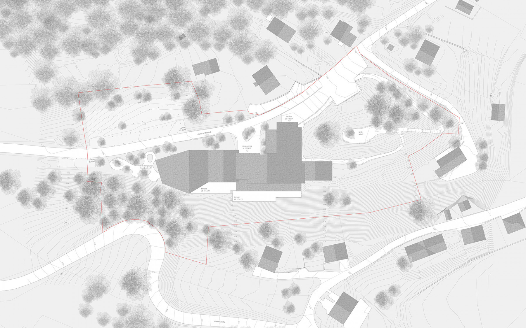 L’EMS Christ-Roi se situe au sud-est du vieux village de Lens, sur une crête linéaire dominant avantageusement la vallée du Rhône et les Alpes méridionales. Avec la création de l’agrandissement à l’ouest, l’organisation intérieure du bâtiment existant est remaniée et simplifiée, notamment au niveau des répartitions des unités et de la création des zones communes dans celles-ci, ainsi que dans la simplification des circulations horizontales. L’agrandissement ne cherche pas à se confondre avec l’existant, il se différencie du vocabulaire faux chalet avec de grands avant-toits, mais tente un dialogue avec l’existant en créant un volume articulé qui termine la composition existante linéaire par un point. L’organisation des circulations permet au système de se retourner, en évitant les couloirs en cul-de-sac, avec des espaces de dégagement et de halte ouverts sur le paysage. L’agrandissement reprend la volumétrie des toits en pente existant, notamment dans le dessin des lignes d’avant-toits qui se poursuivent sans interruption.