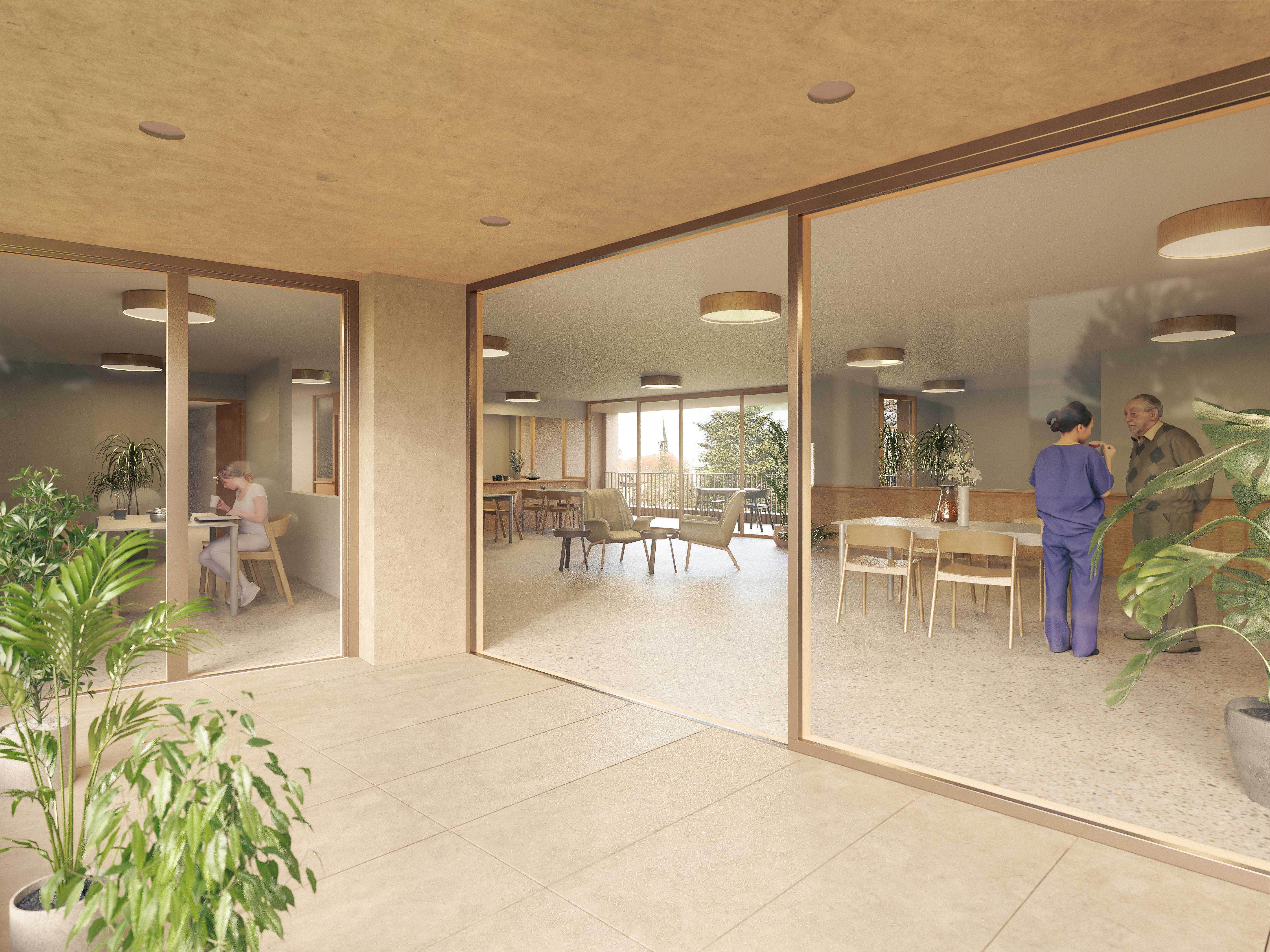 Le bâtiment de l’EMS définit un espace représentatif et doit, par conséquent, être ouvert et assurer le lien entre le quartier de la gare et l’école du Sacré-Coeur ainsi que la cité historique, tout en respectant l’intimité de sa fonction de résidence médicalisée pour anciens, immergée dans un grand parc nouvellement créé. La morphologie proposée, de forme compacte et réduite à l’essentiel, permet de dégager de part et d’autre du site de généreux espaces de jardin et des terrasses qui prolongent les différentes activités des parties communes. L’insertion naturelle dans le terrain en pente permet de dégager un niveau d’entrée situé de plain-pied et un niveau de jardin à l’étage supérieur sur lequel s’ouvrent les locaux les plus publics (restaurant, cafeteria, salle polyvalente, foyer de jour, etc.). Les unités de vie de 30 chambres chacune sont ensuite réparties sur les 3 étages restants. La forme de « 8 » qui résulte de la morphologie proposée permet de réduire l’impact du volume et ses longueurs de façades, tout en gardant à l’intérieur des parcours en boucles pour les résidents.