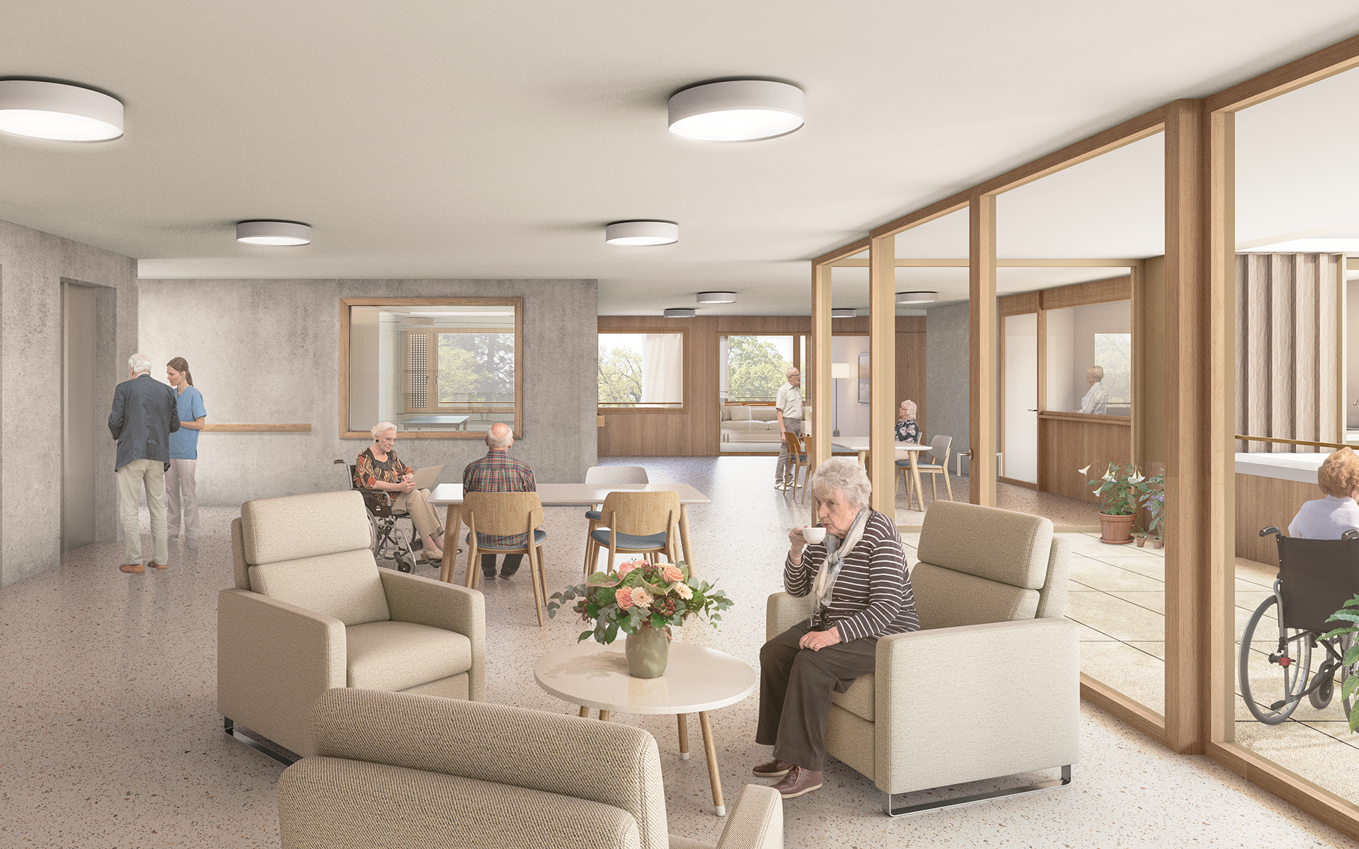 Les trois parallélépipèdes décalés les uns par rapport aux autres créent une cour d’entrée qui termine la contre-allée d’accès définie par le plan de quartier. De cette cour arborée on atteint l’entrée principale avec le hall d’accueil, la réception-bar en lien avec la cafeteria et la salle à manger commune. Dès l’entrée, on voit les prolongements extérieurs sur la terrasse et le jardin à l’est. Au sud se situe la salle à manger commune, avec aussi des prolongements sur des terrasses intégrées au jardin. De l’entrée principale on accède aux ascenseurs et monte-charges qui amènent aux différentes unités de vie des étages.