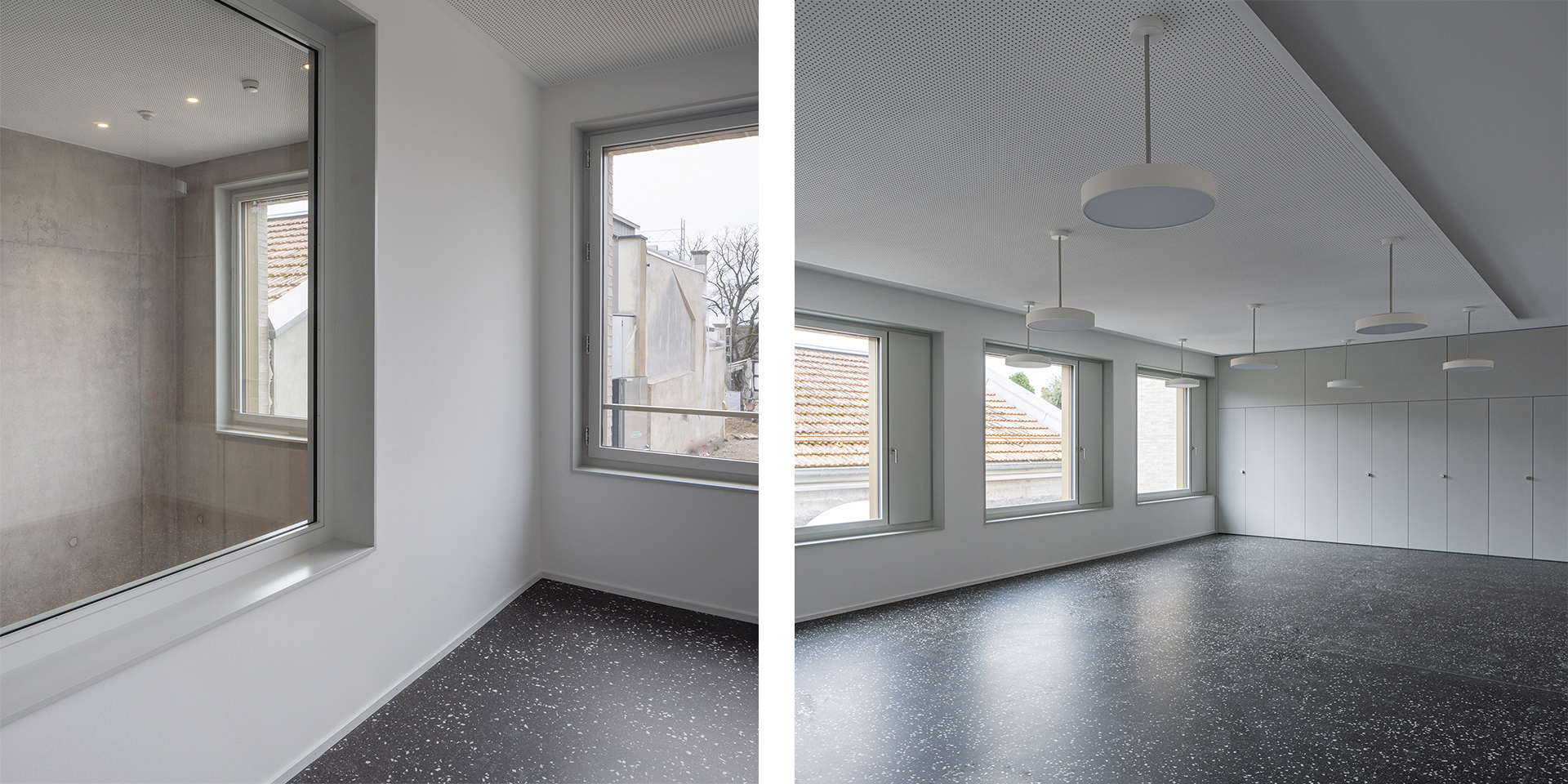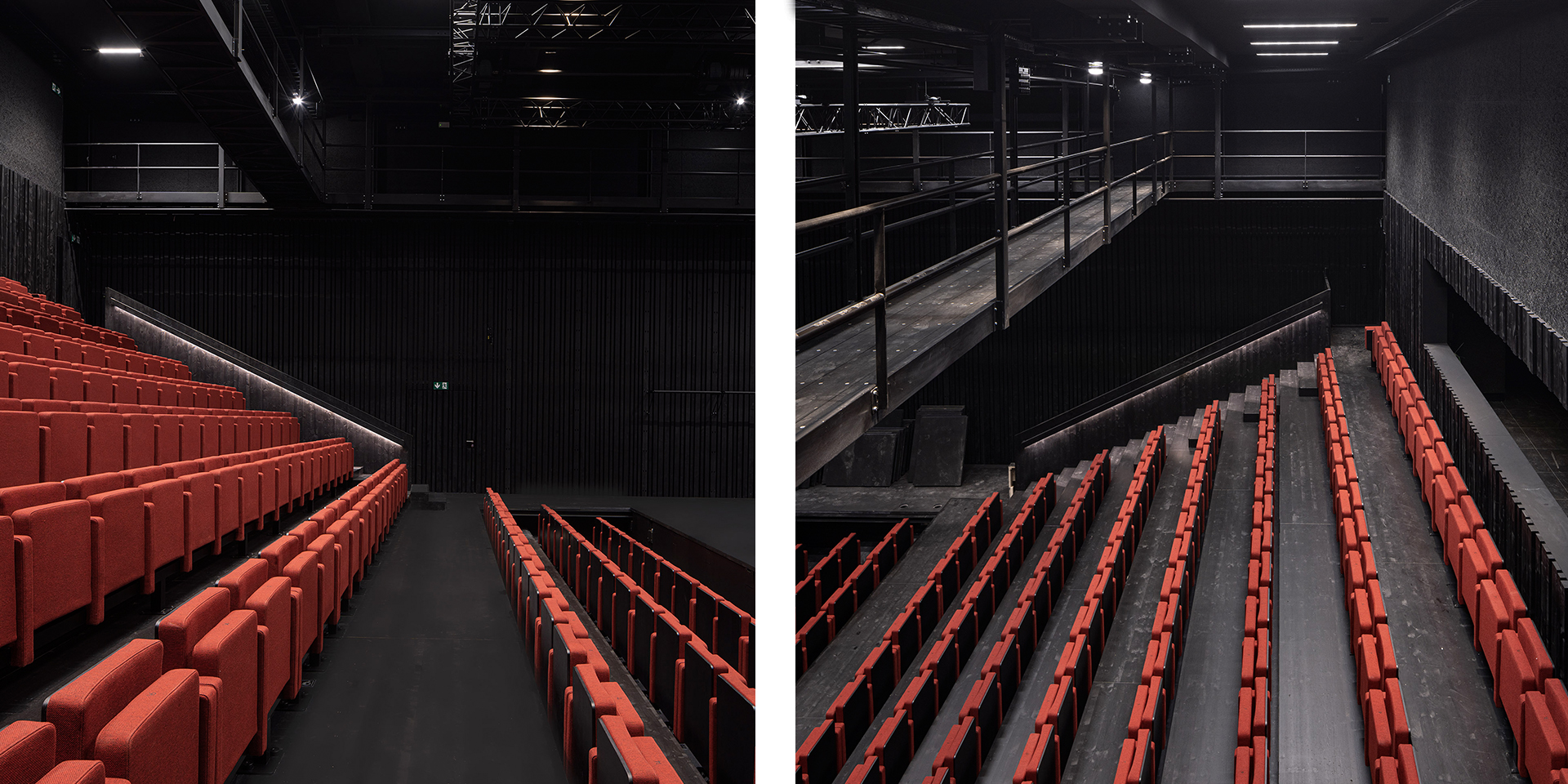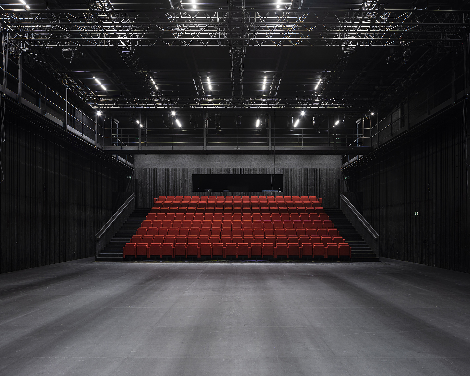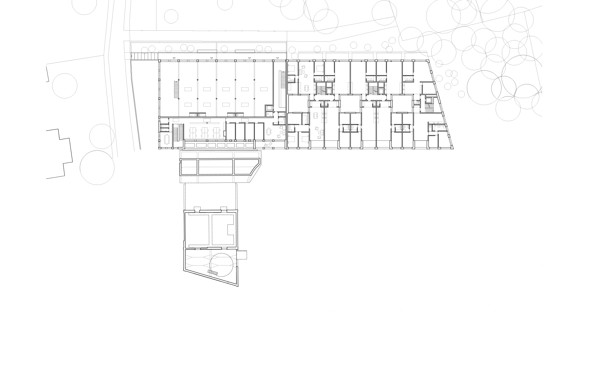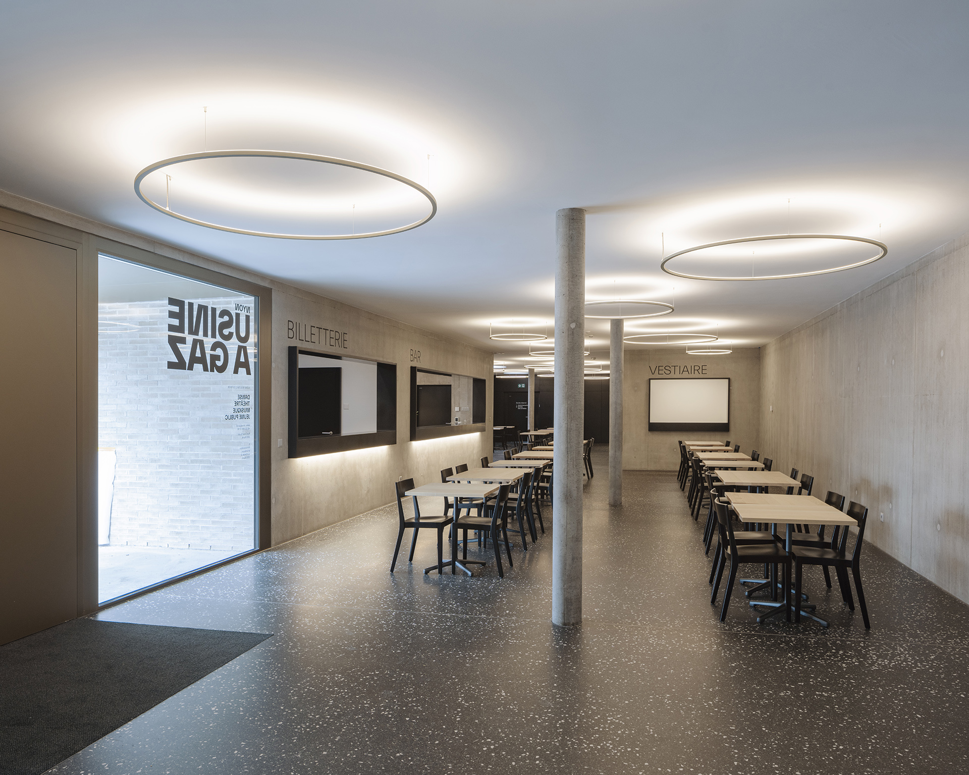 Le plan de quartier «Vy-Creuse-Usine à Gaz-Rive» détermine précisément les possibilités d’implantation volumétrique des constructions, un théâtre et ses annexes à l’ouest, des logements et des surfaces commerciales à l’est, à proximité du lac. La nouvelle place publique en légère pente conduit à l’entrée du nouveau théâtre. Le foyer de la nouvelle salle ainsi que les loges, les dépôts, l’administration et la salle de répétition se distribuent dans l’interstice entre les bâtiments du théâtre existant et la nouvelle salle, permettant de relier les locaux actuels au futur complexe. La salle du théâtre est orthogonale, simple et fonctionnelle. Un accès pour les livraisons et les professionnels du théâtre sont situés à l’ouest du bâtiment, en liaison avec la rue de la Vy-Creuse. Les logements pour artistes et des surfaces de bureaux prennent place au-dessus du théâtre et sont accessibles par une rue de desserte. Dans la partie est, le rez est dévolu à des surfaces commerciales.