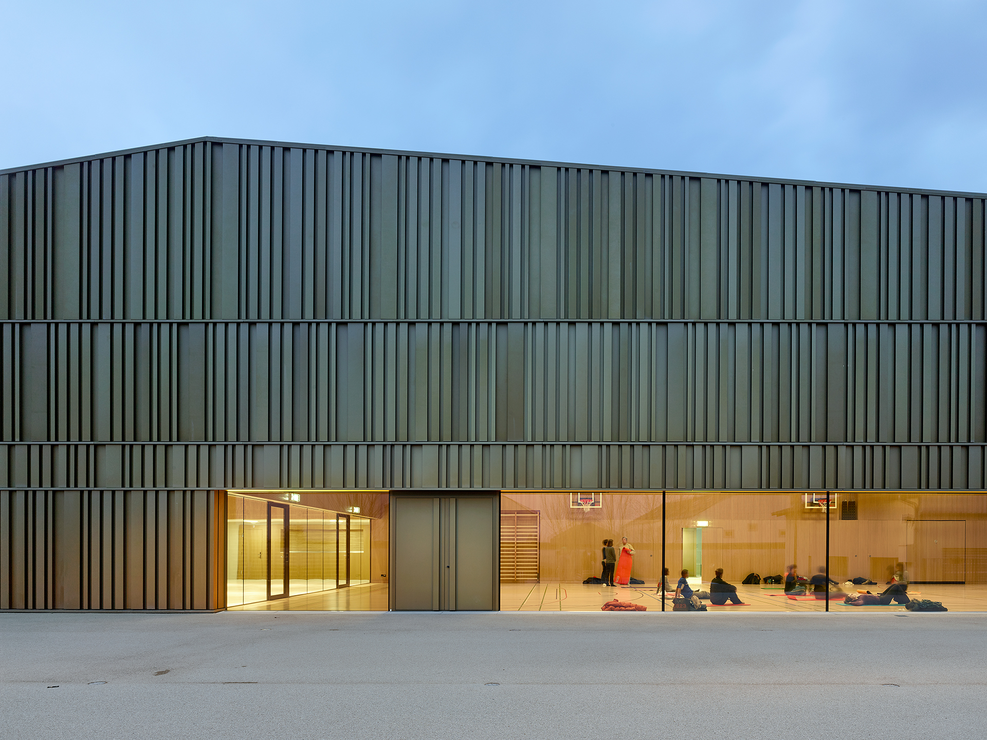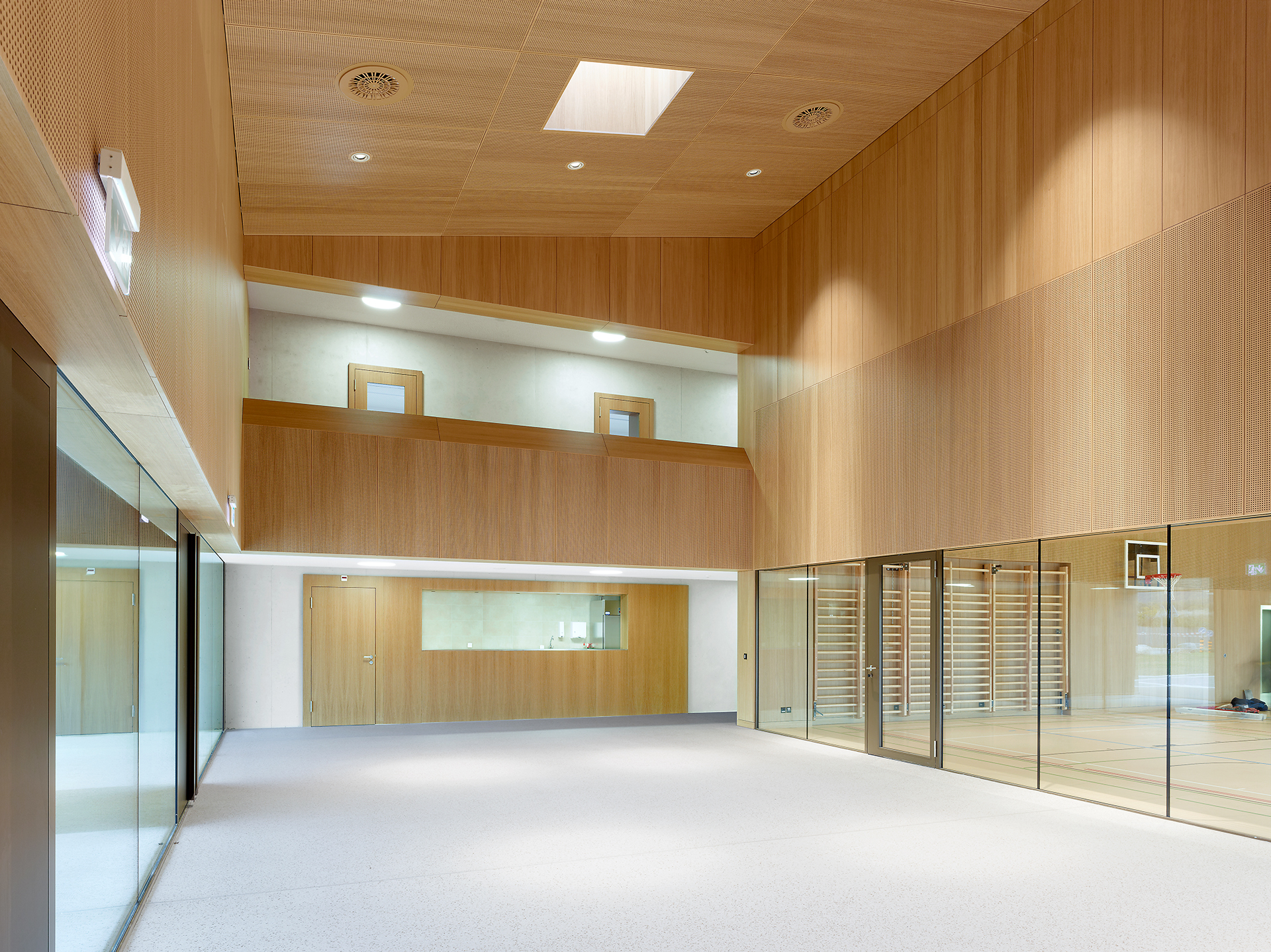 Le site accueillant un bâtiment communal et une crèche est caractérisé par la présence d’un abri enterré de protection civile. D’autres constructions pourraient à l’avenir compléter ces deux équipements publics regroupés autour d’une nouvelle centralité villageoise. L’implantation en quinconce de ces différents bâtiments crée des espaces extérieurs de formes et de caractères variés qui coulissent les uns par rapport aux autres. Le bâtiment communal s’implante sur une partie de l’abri de protection civile existant. Le plan du bâtiment communal est réalisé de manière à ne pas charger la dalle de l’abri. Au rez-de-chaussée, le foyer se prolonge par un large couvert donnant sur la place du village et ouvert sur le Jura, tandis que la salle polyvalente s’ouvre sur une place orientée au sud. Un accès aux bureaux de l’administration communale situés à l’étage est possible par le nord.